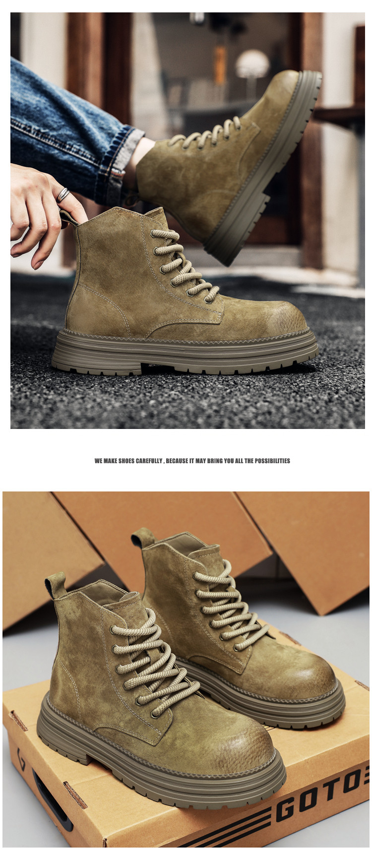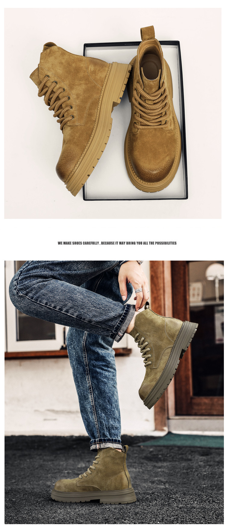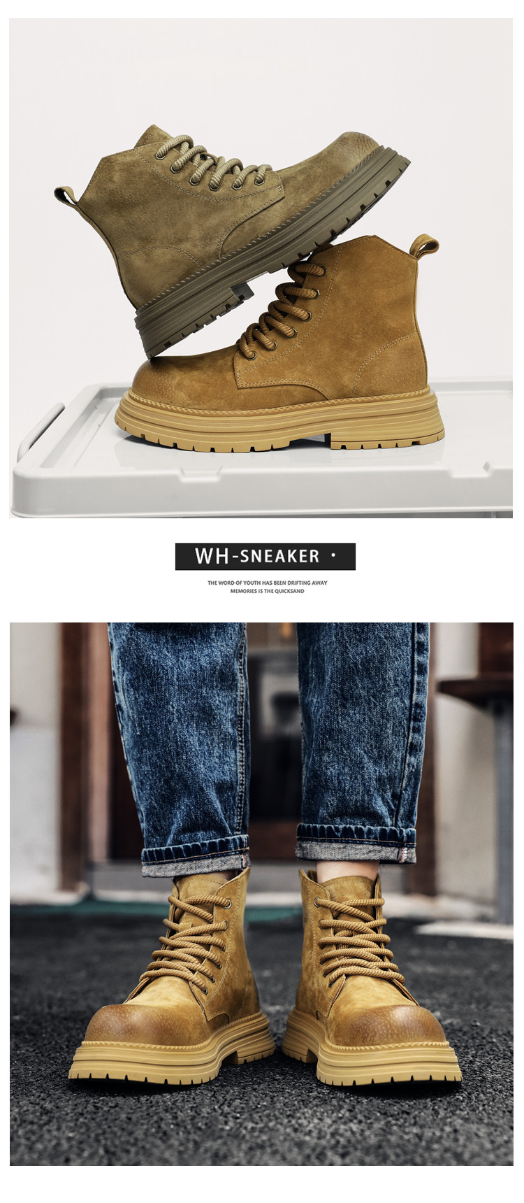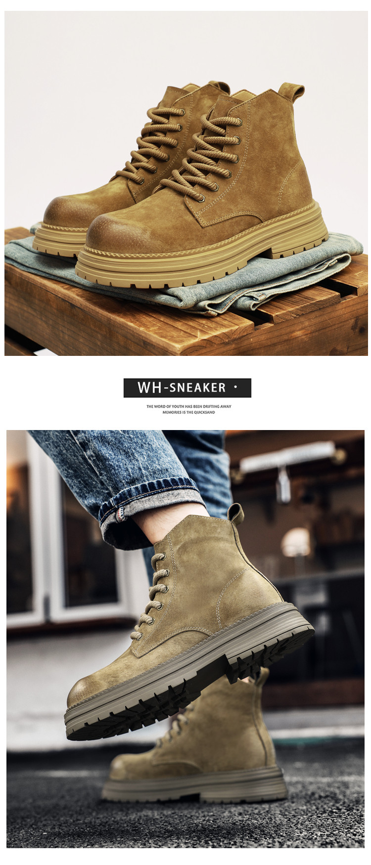 Martin Boots for Men, Winter Genuine Leather High-Top Shoes, British Style Thick-Soled Couple's Yellow Boots, Fleece-Lined Outdoor Mid-Top Work Boots
