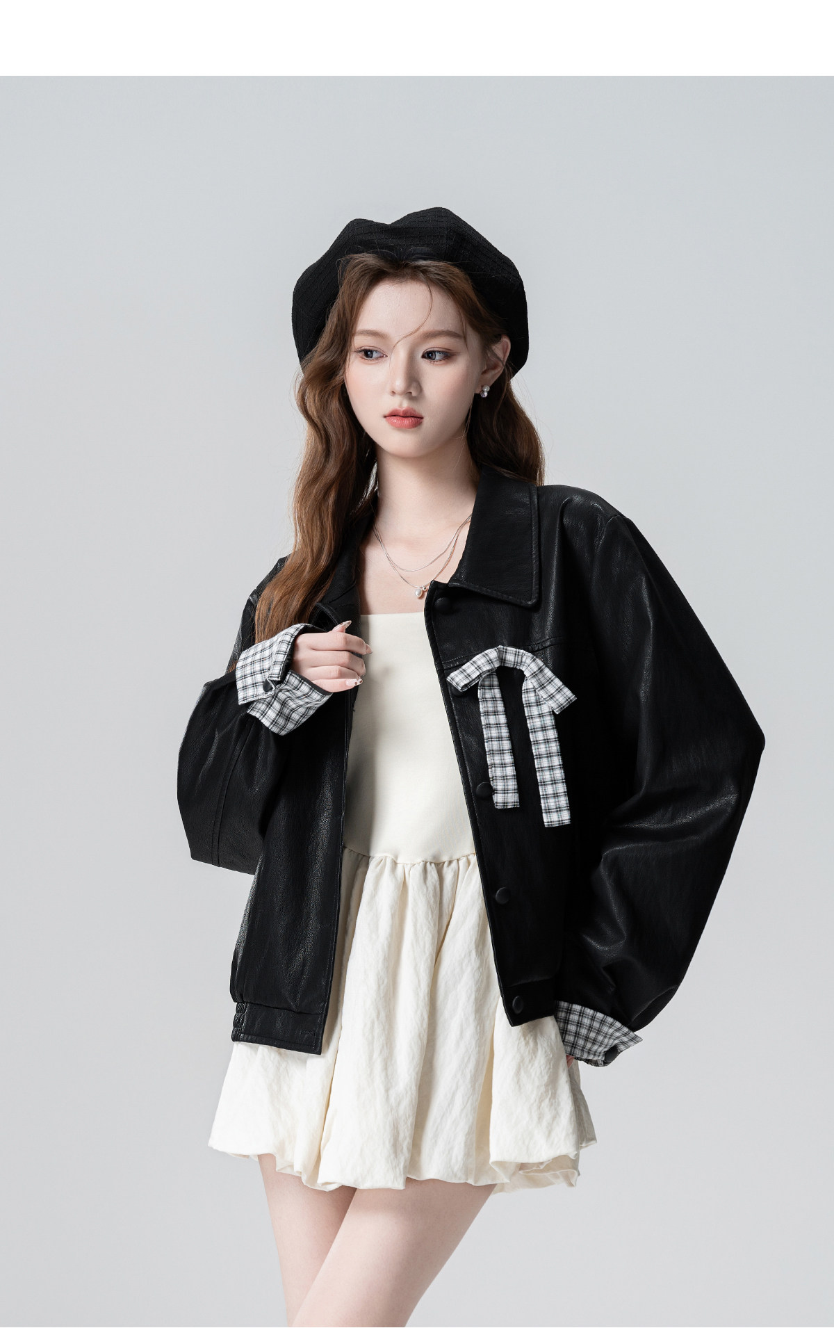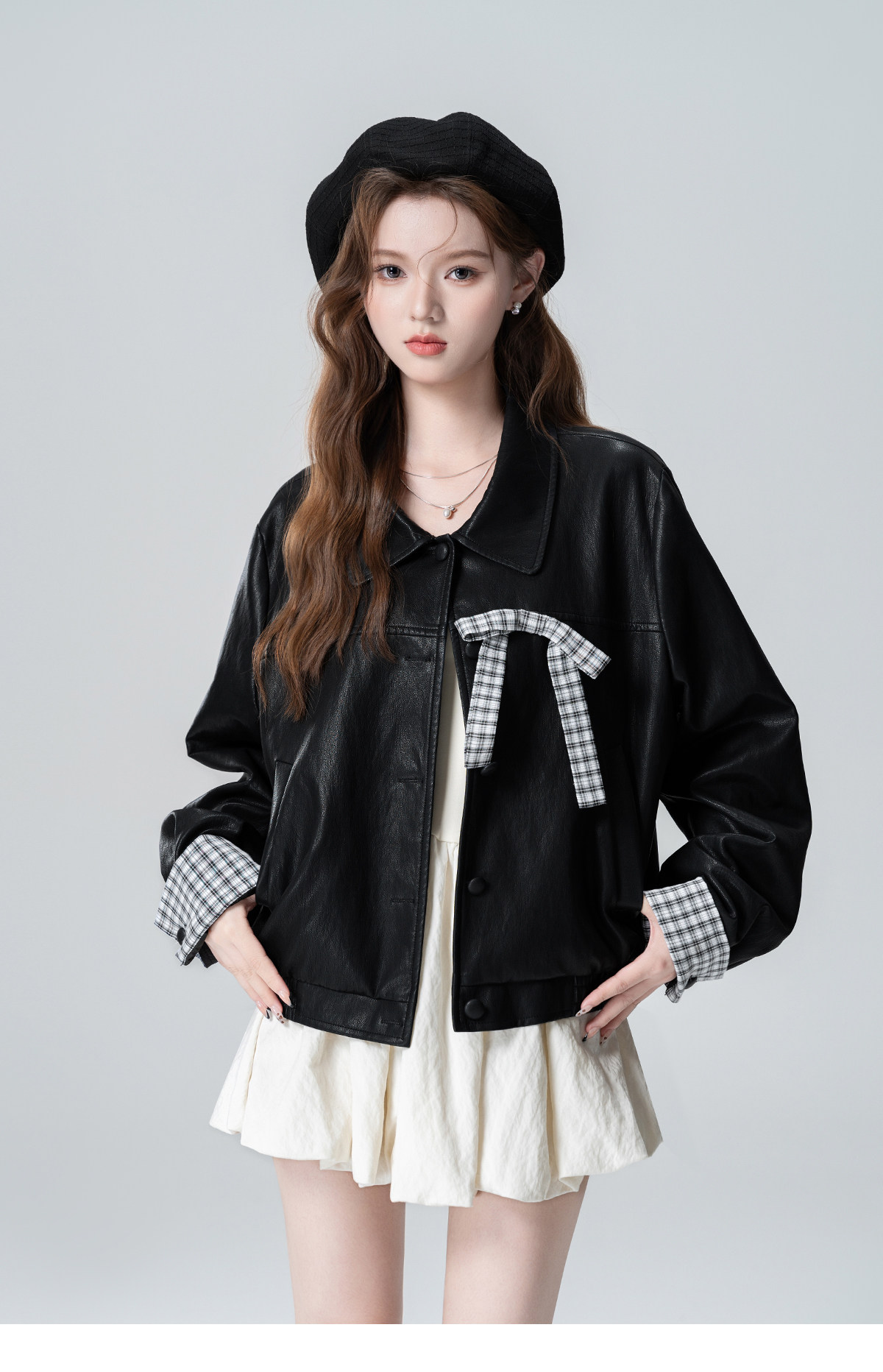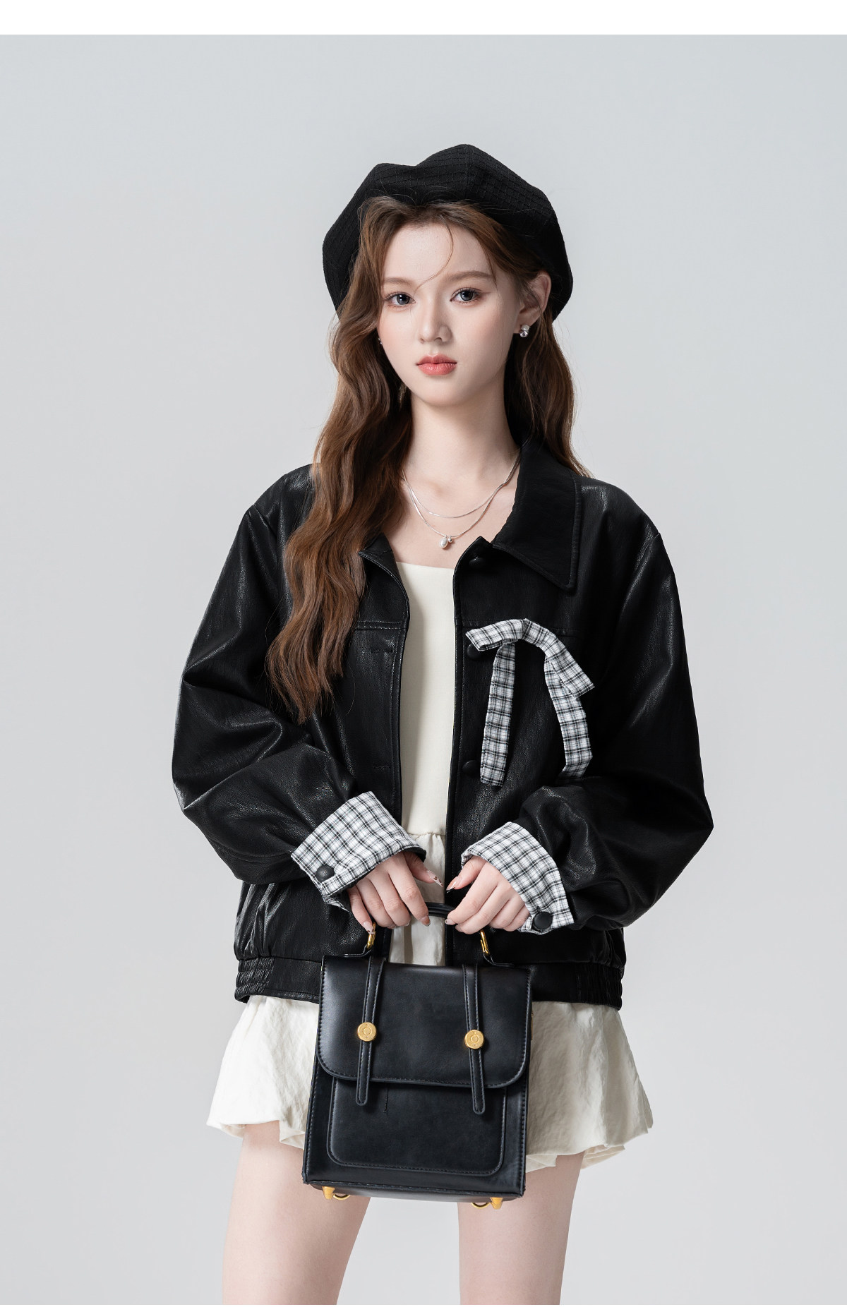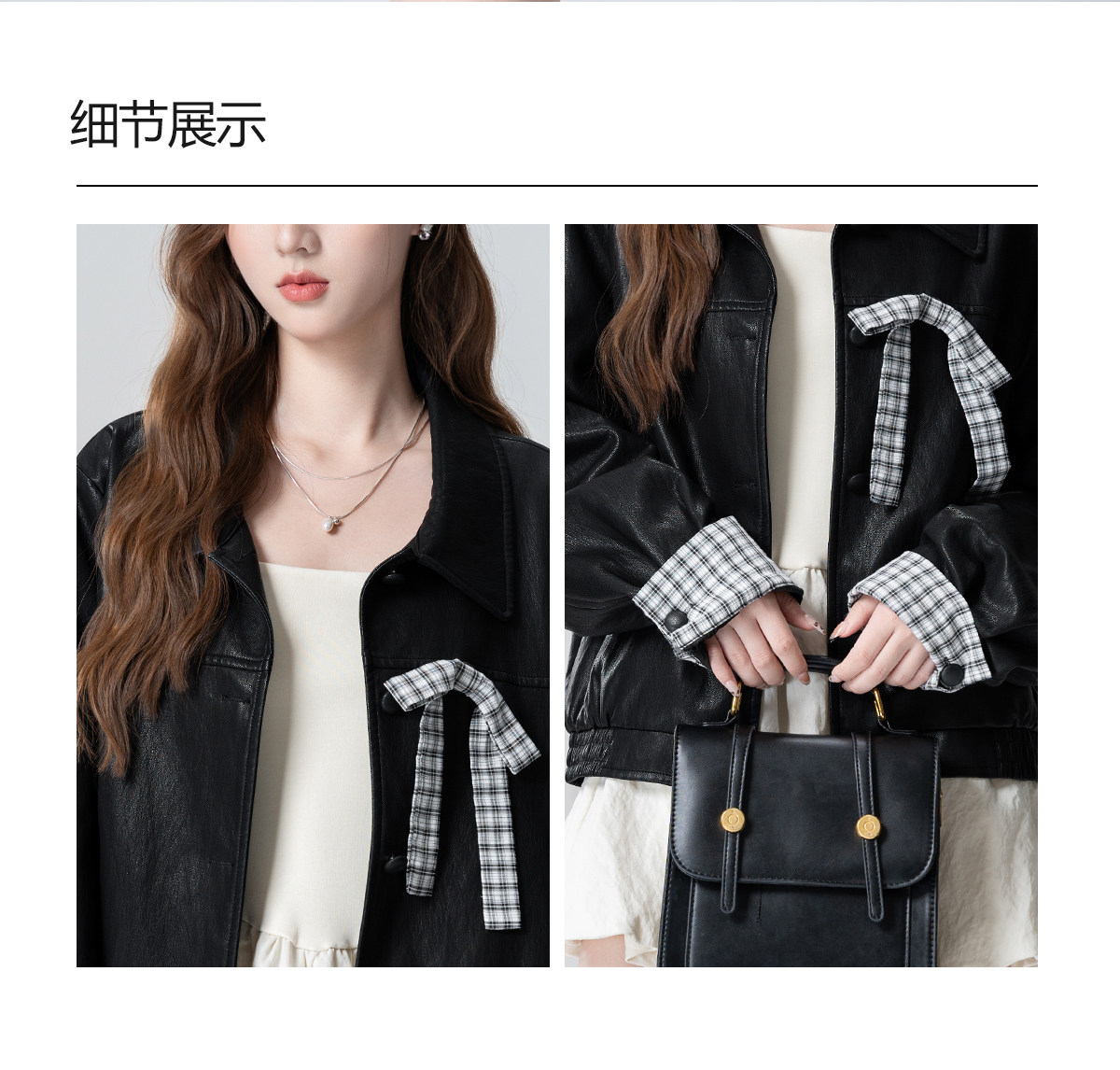 Black Lapel Leather Jacket Women's Spring and Autumn 2026 Autumn New Plaid Splicing PU Leather Jacket Cardigan Short Top