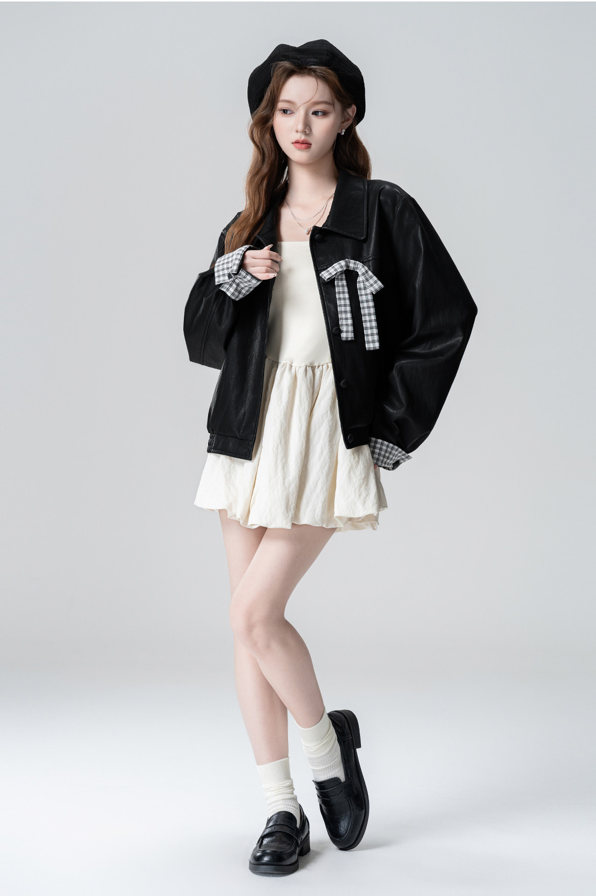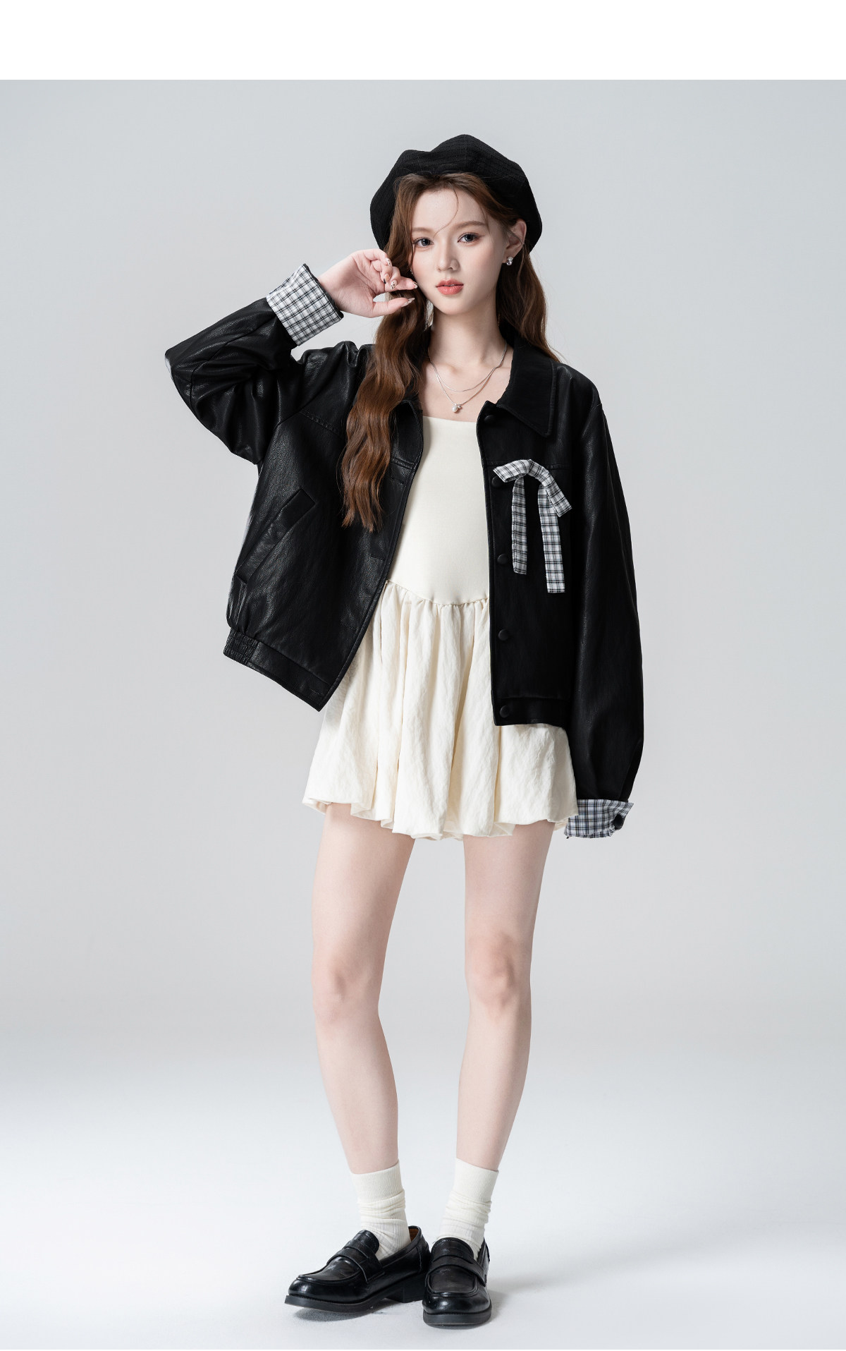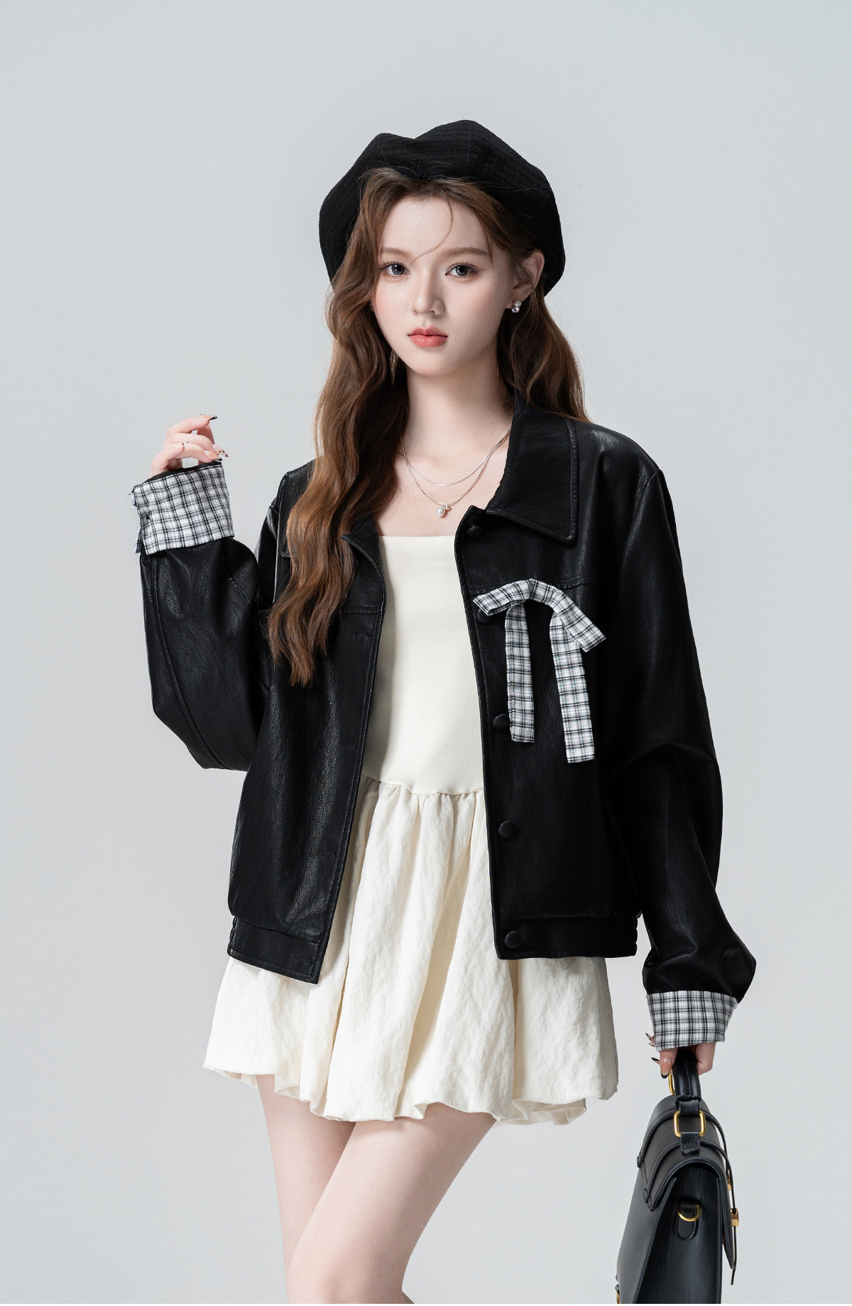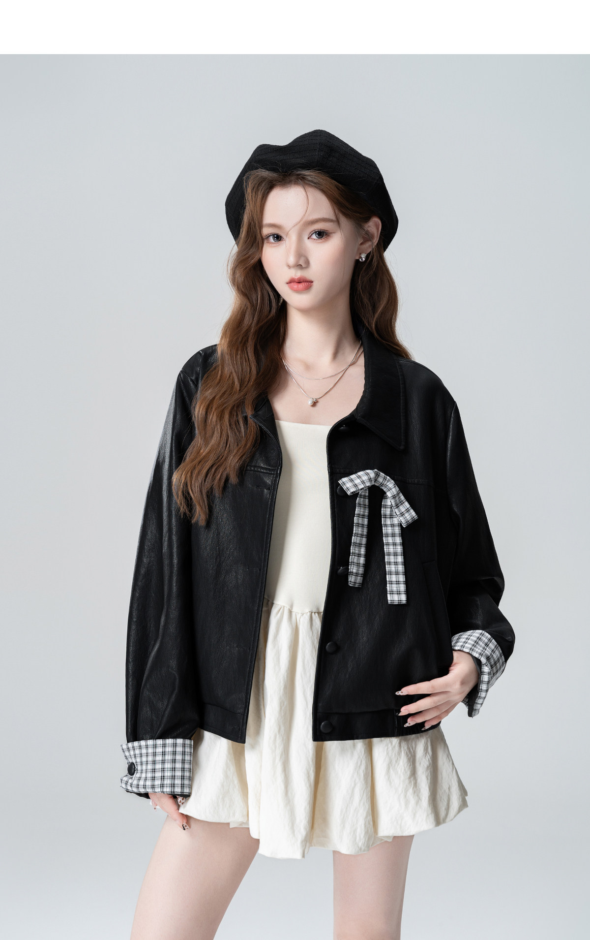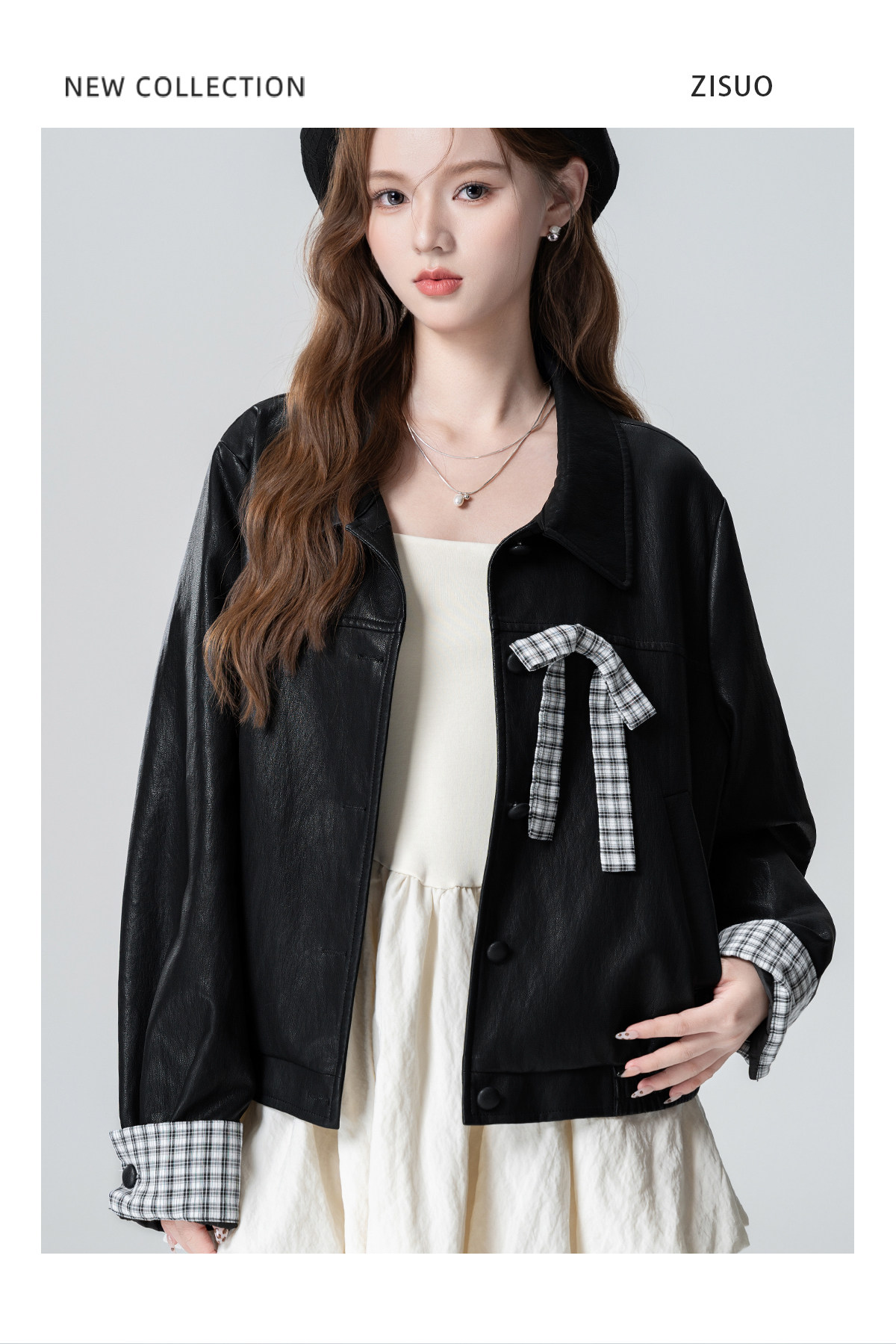 Black Lapel Leather Jacket Women's Spring and Autumn 2026 Autumn New Plaid Splicing PU Leather Jacket Cardigan Short Top