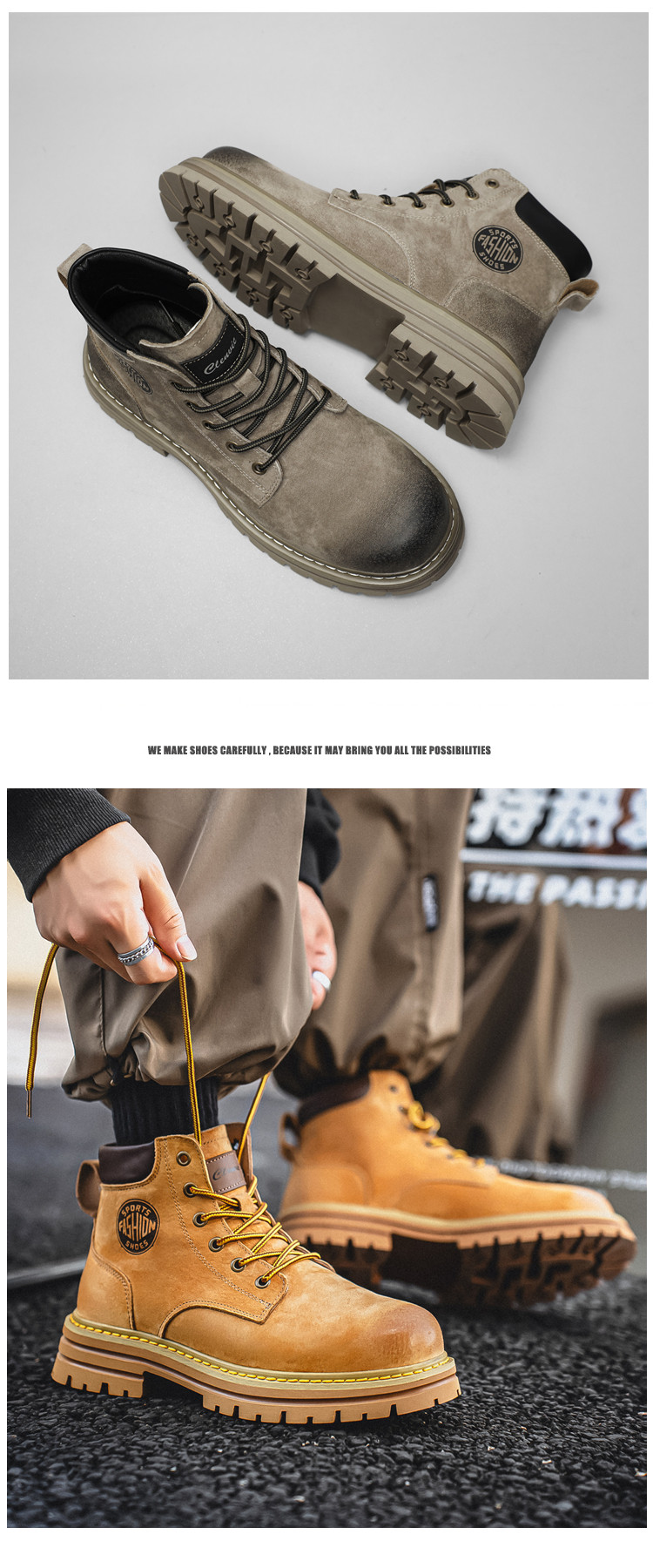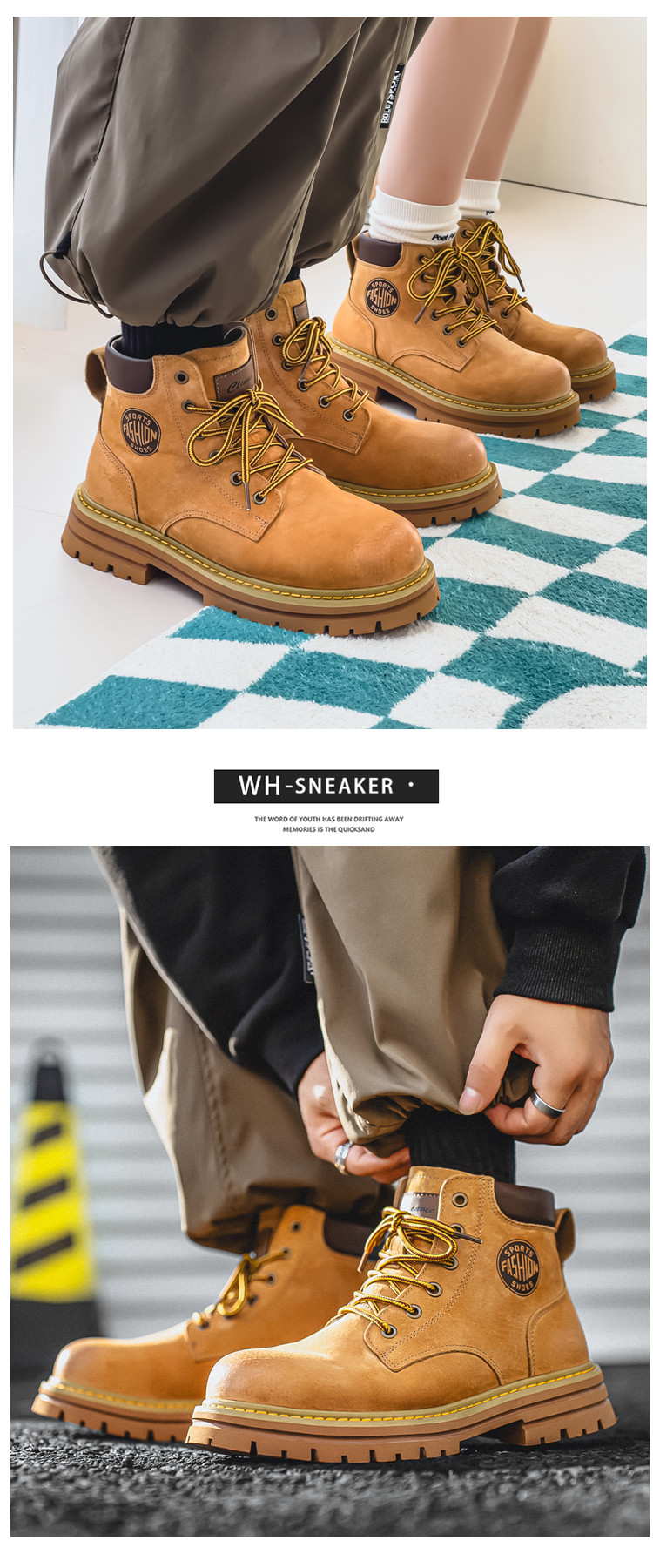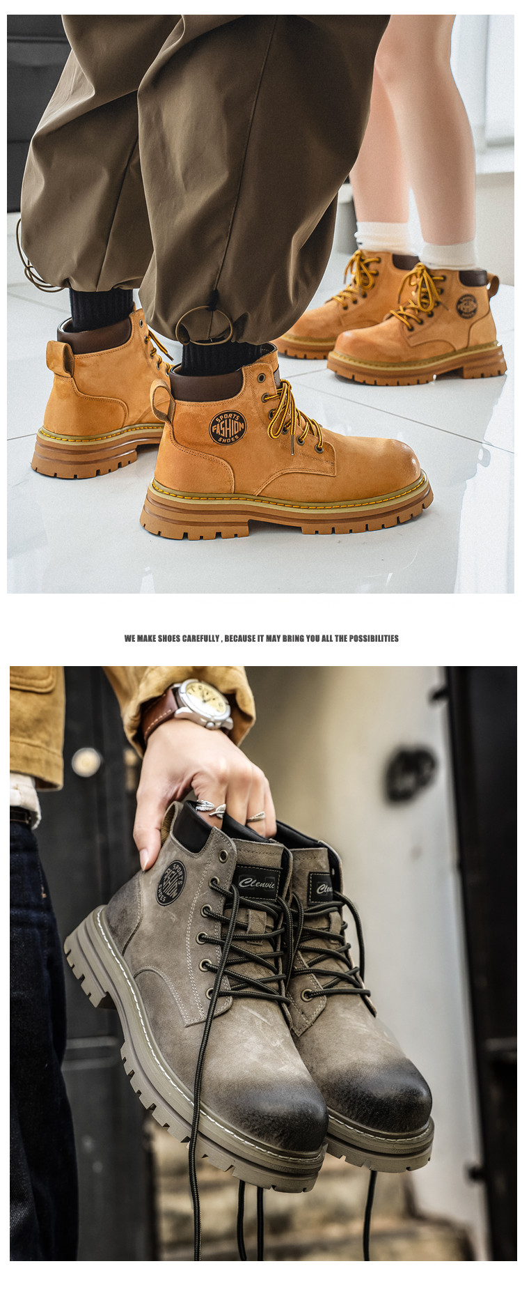 Martin Boots for Men, Winter Genuine Leather High-Top Shoes, British Style Height-Increasing Couple Boots, Yellow Boots with Fleece Lining, Outdoor Mid-Top Work Boots