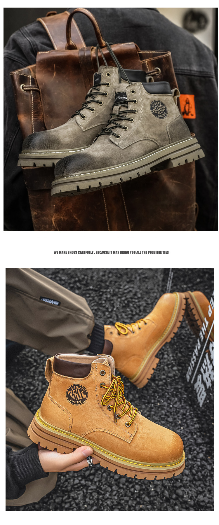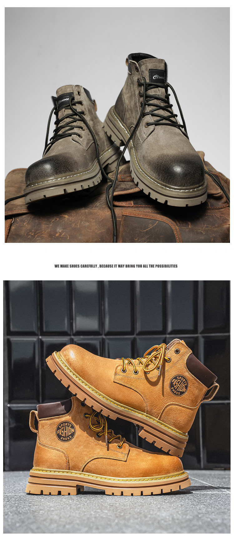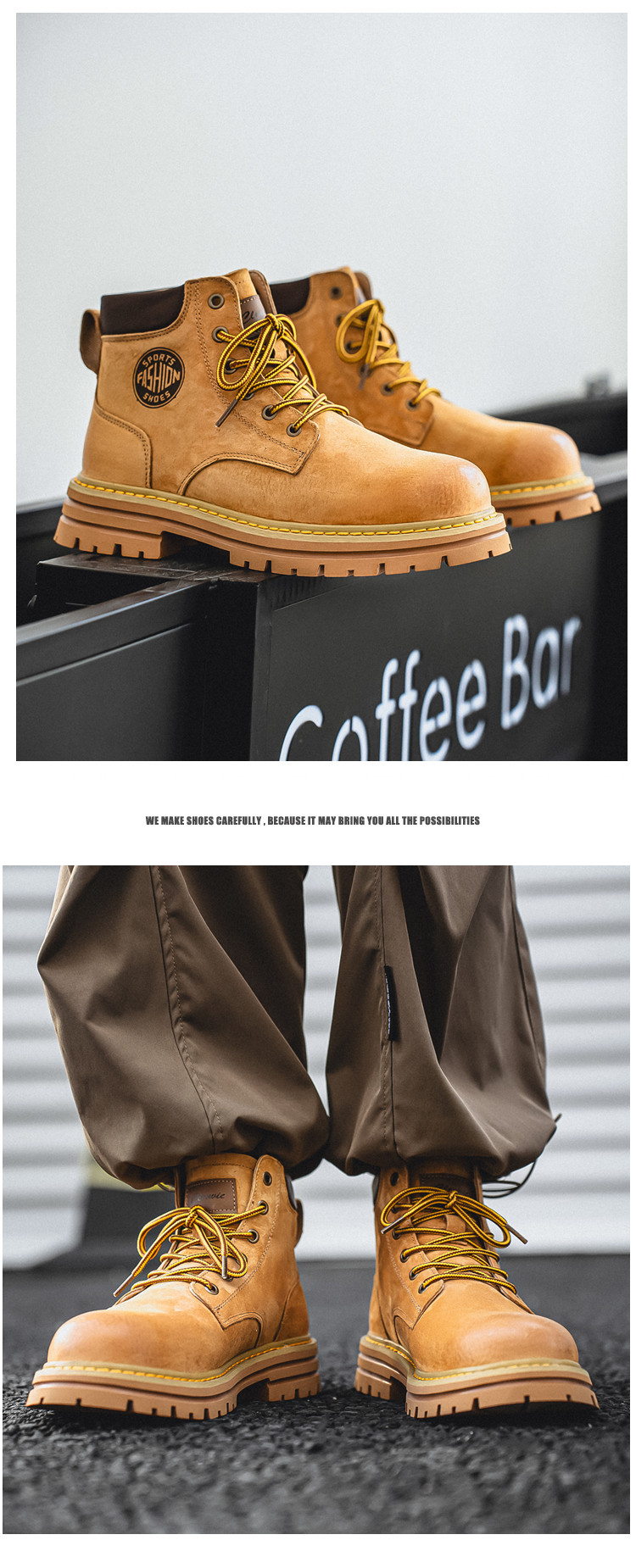 Martin Boots for Men, Winter Genuine Leather High-Top Shoes, British Style Height-Increasing Couple Boots, Yellow Boots with Fleece Lining, Outdoor Mid-Top Work Boots
