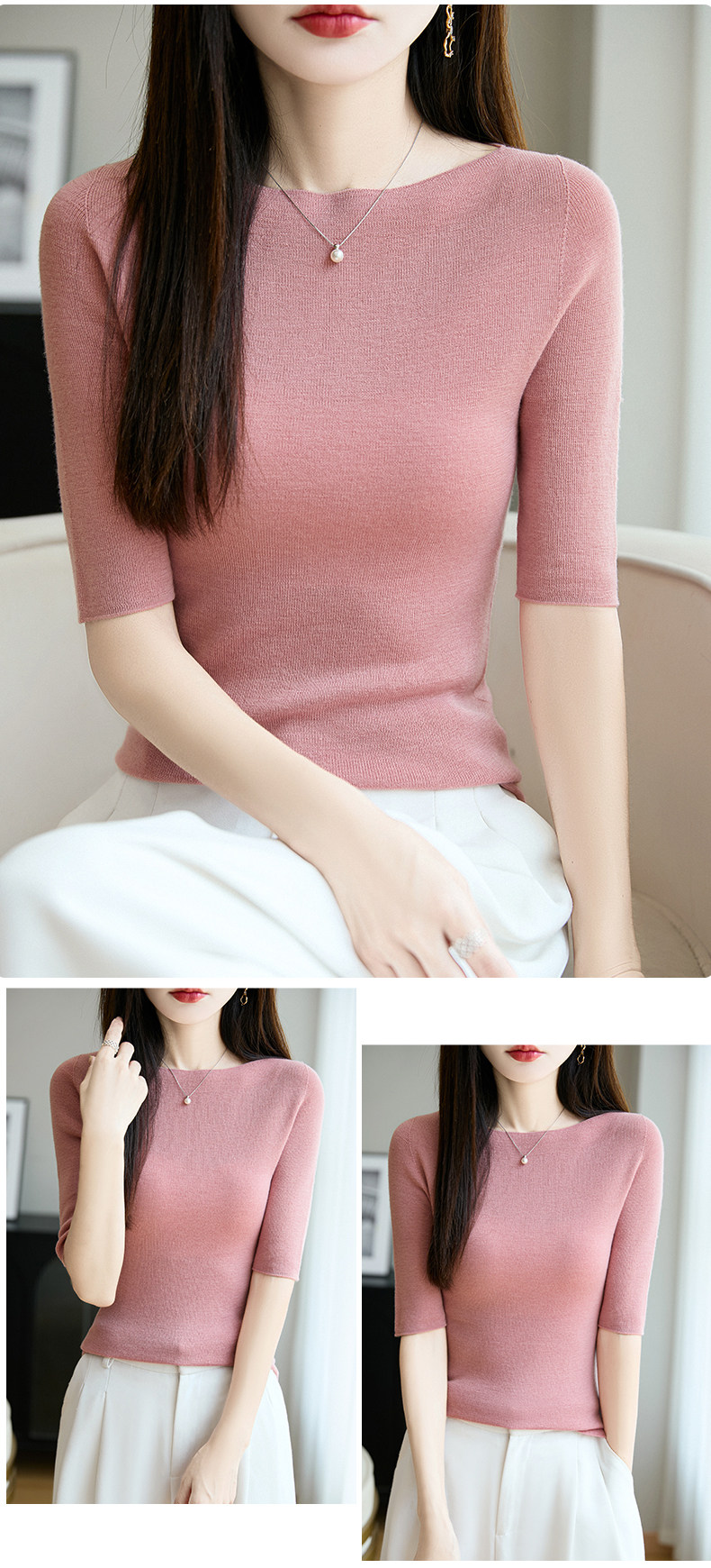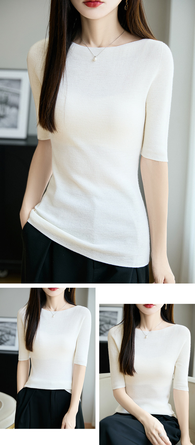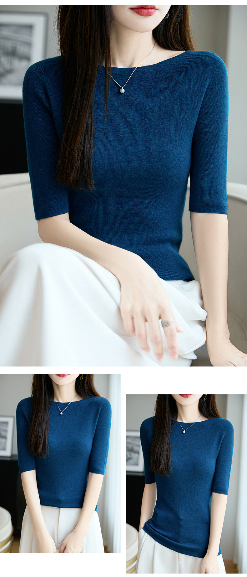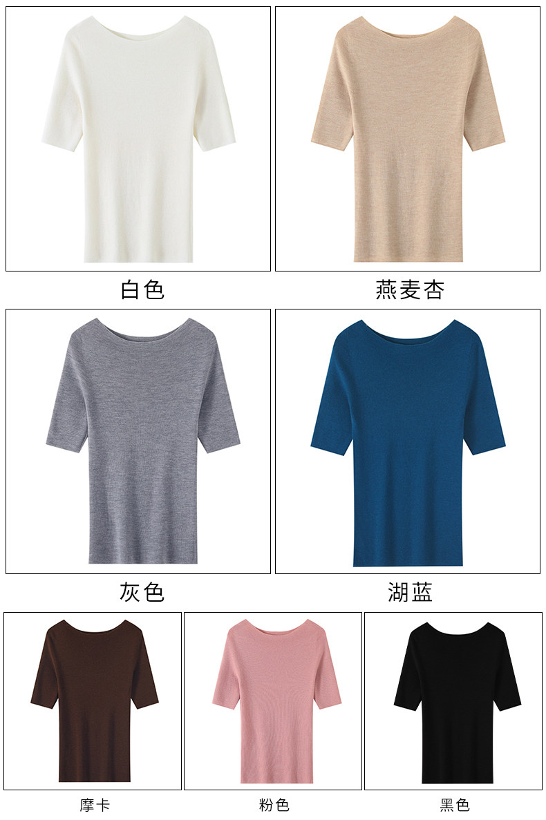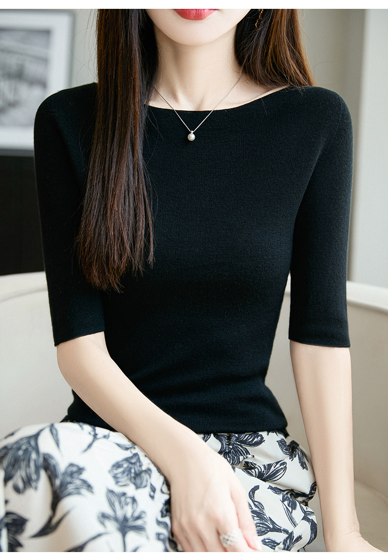100% Fine Worsted Wool Knit Off-Shoulder Five-Quarter Sleeve Women's Soft and Elegant Slimming Yangzi Yarn Half-Sleeve Base Shirt