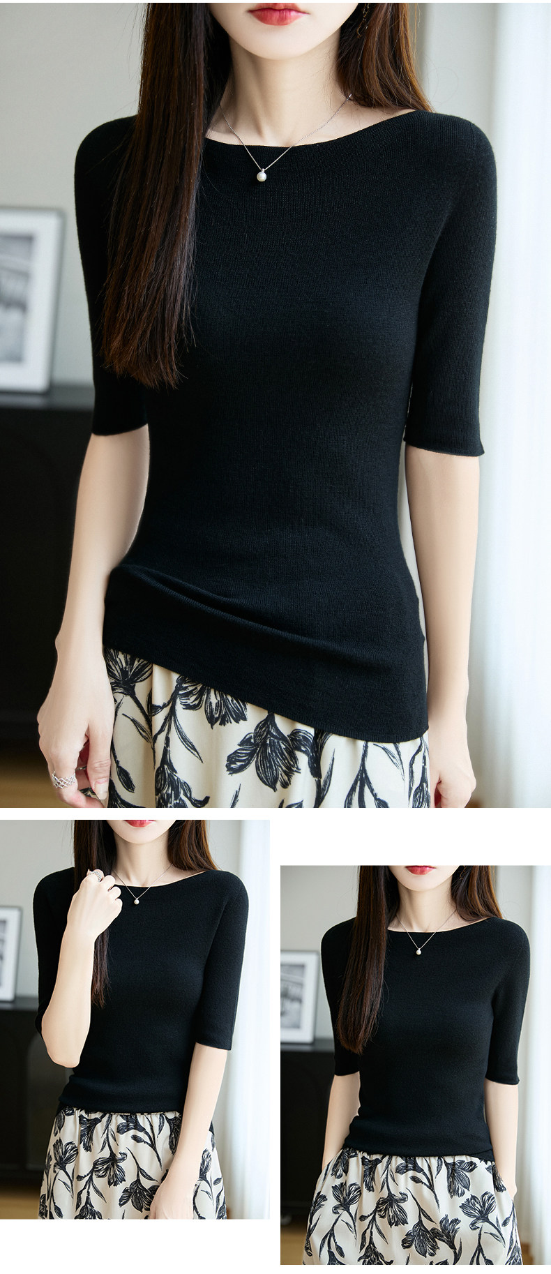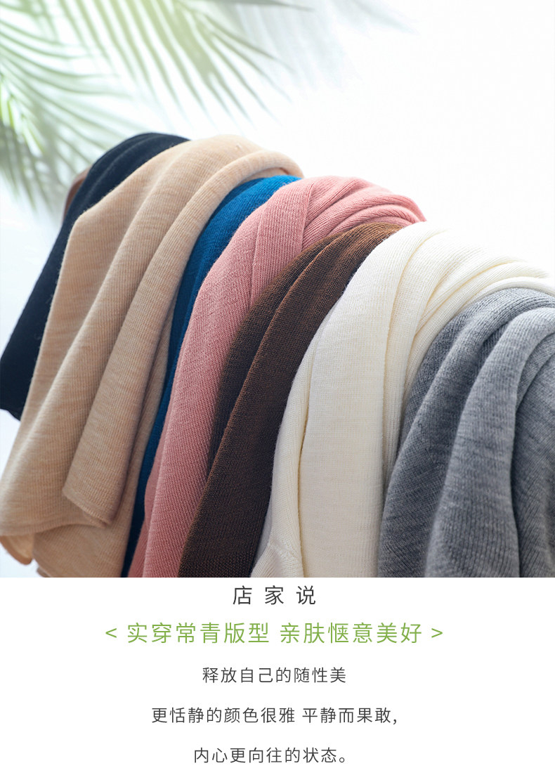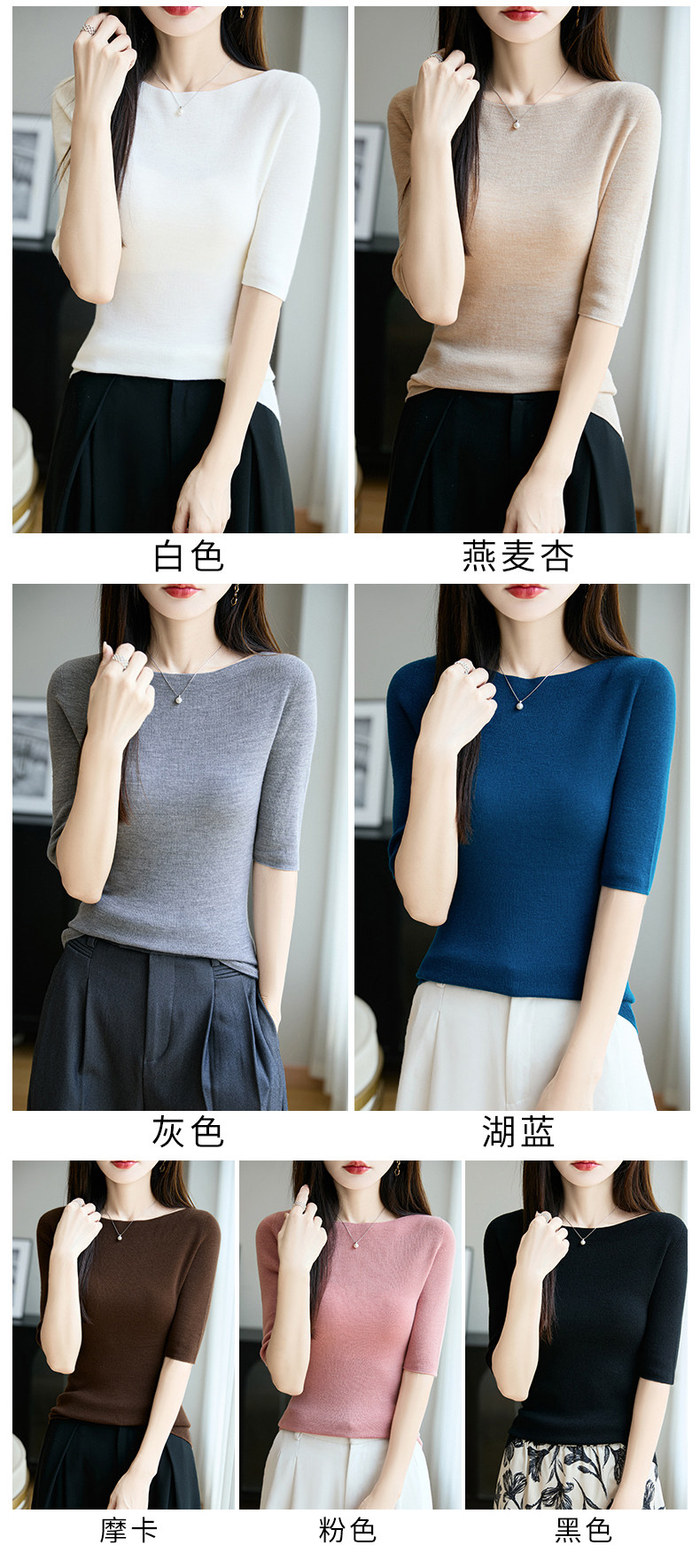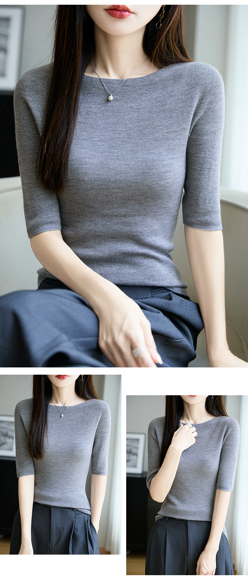 100% Fine Worsted Wool Knit Off-Shoulder Five-Quarter Sleeve Women's Soft and Elegant Slimming Yangzi Yarn Half-Sleeve Base Shirt
