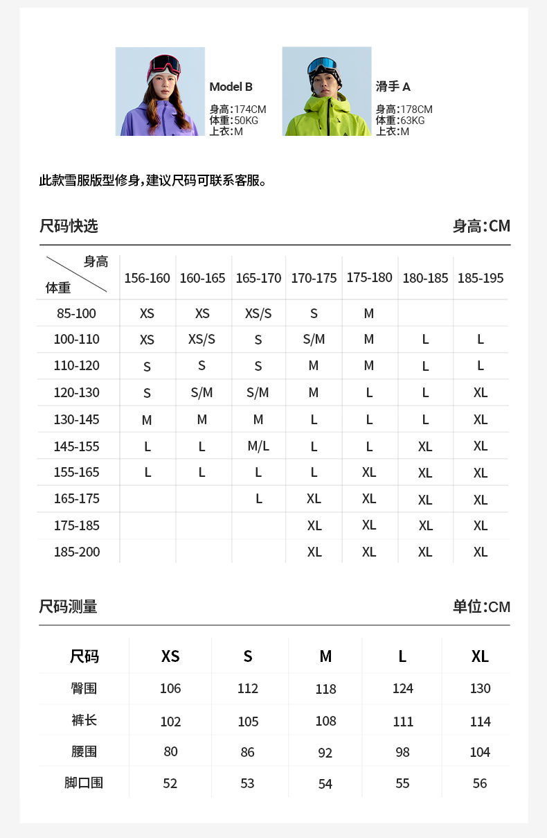 China (cm) 160-165/84-86 165-170 / 88-90 167-172 / 92-96 168-173 / 98-102 170-176 / 106-110