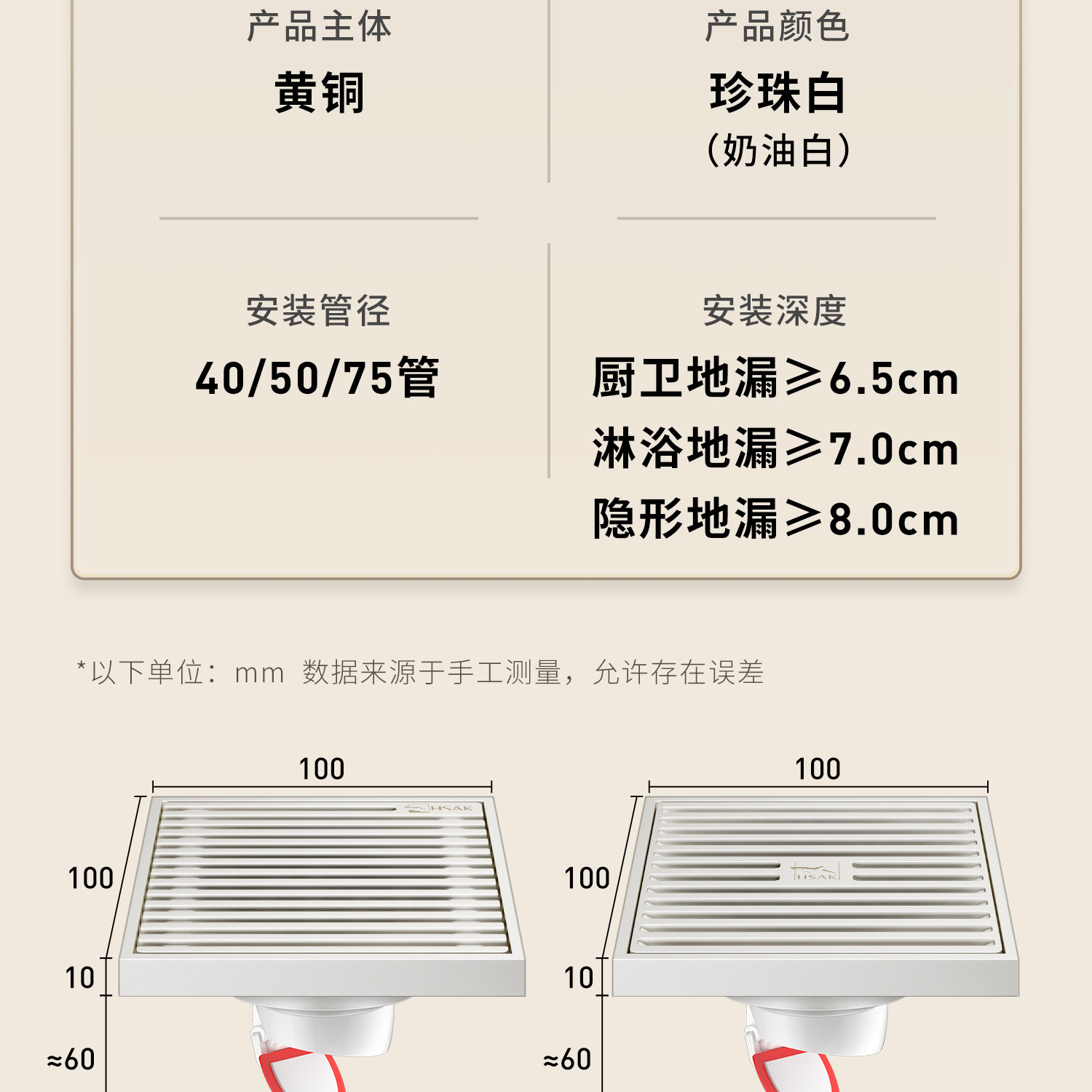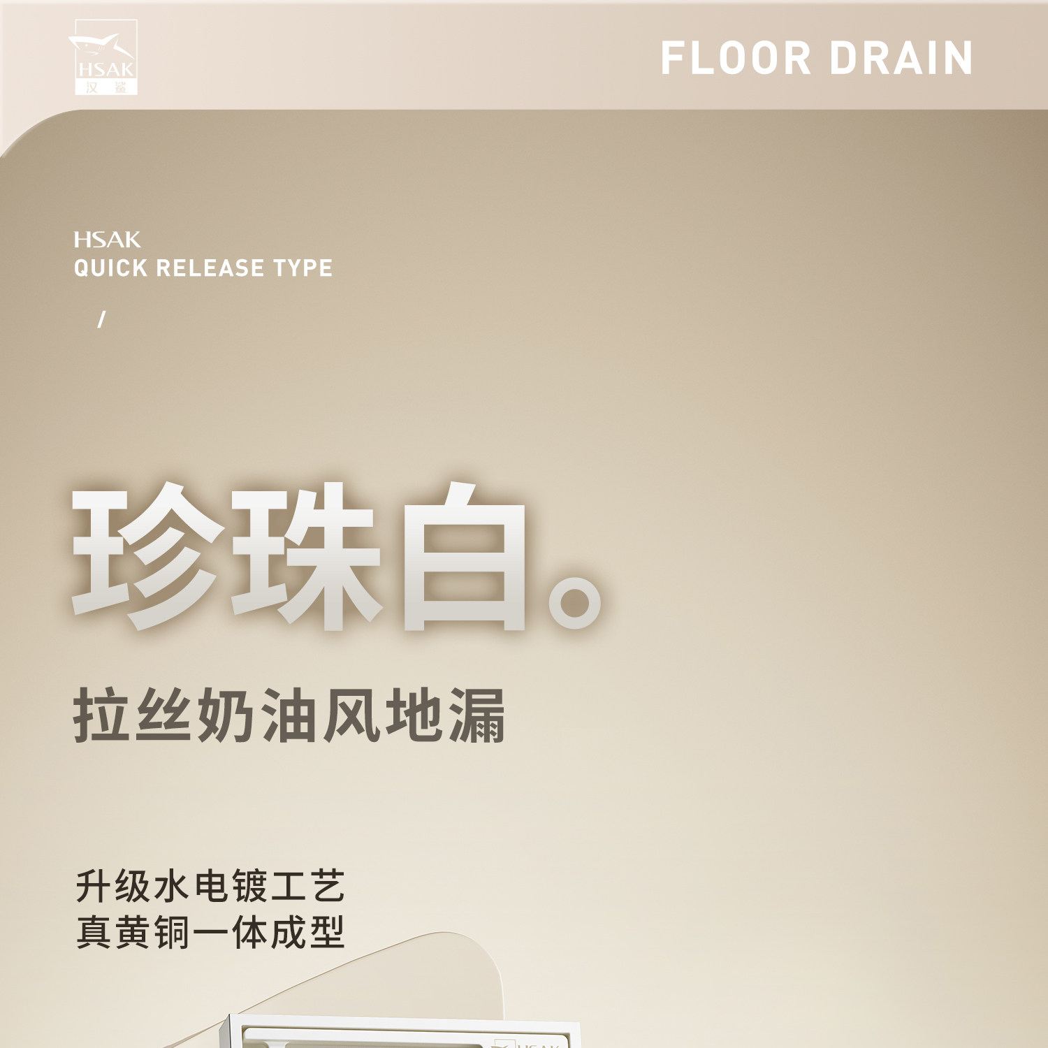 Cream-Colored Brushed Copper Floor Drain with Pearl White Finish, Anti-Odor, Ultra-Thin Cover Core, Invisible Design for Bathroom Shower
