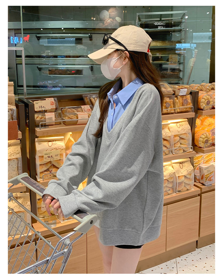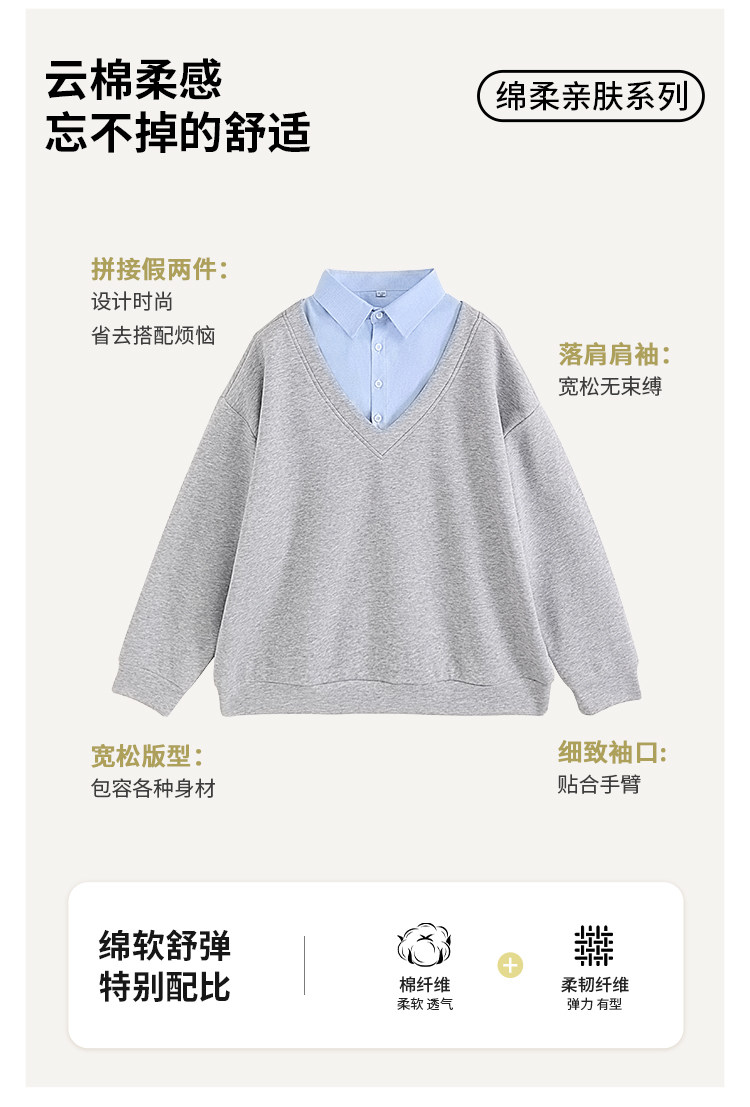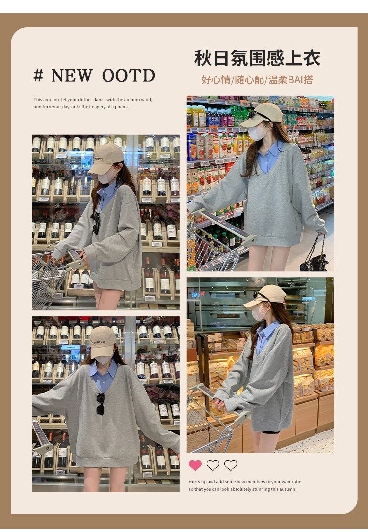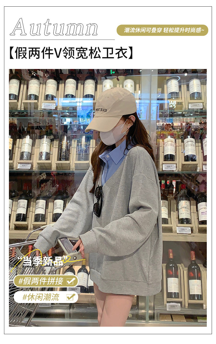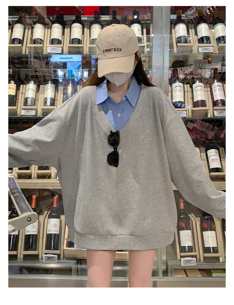 Fake two-piece polo collar sweatshirt for women thin 2026 new long-sleeved Korean gray loose top popular autumn wear