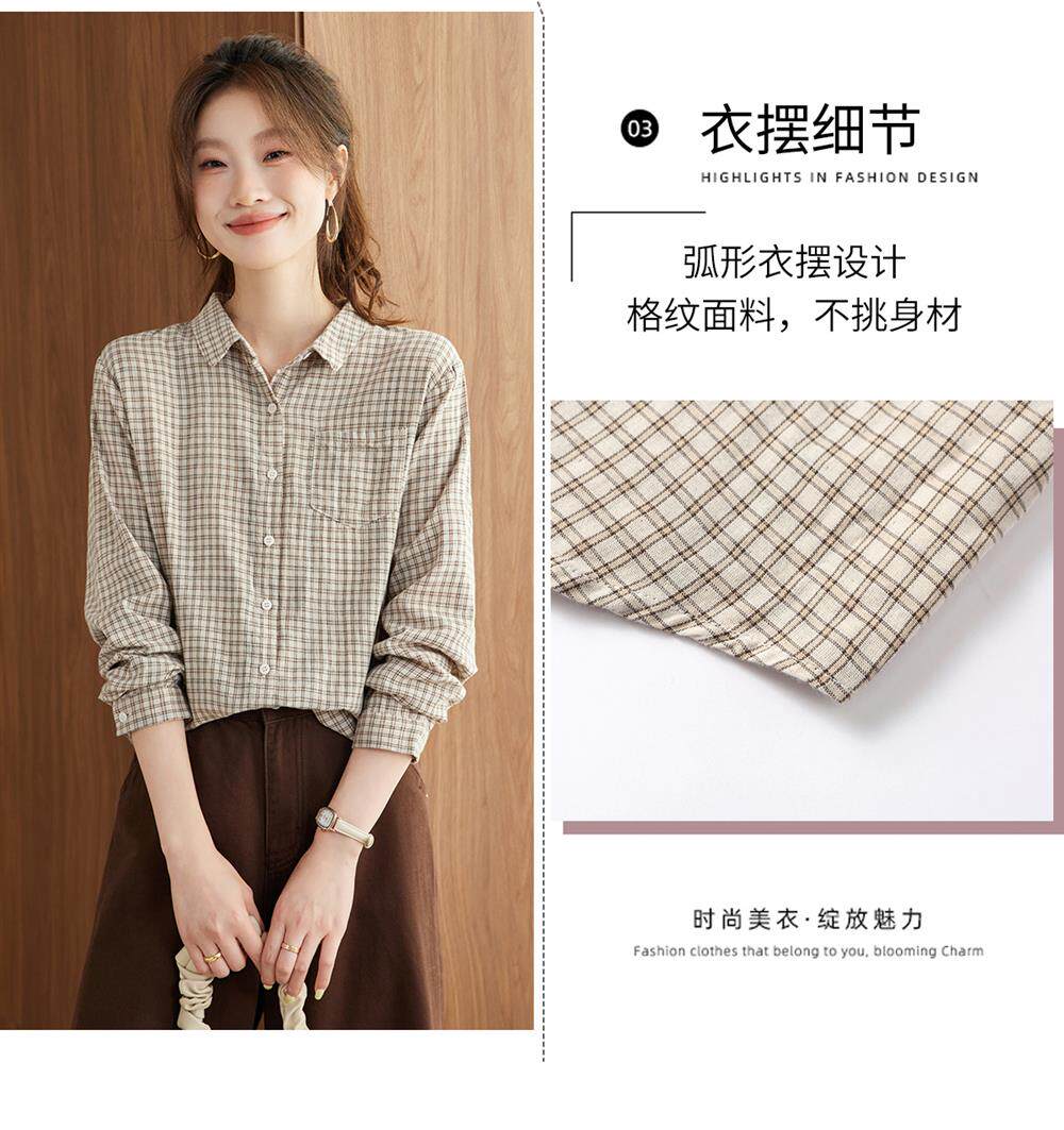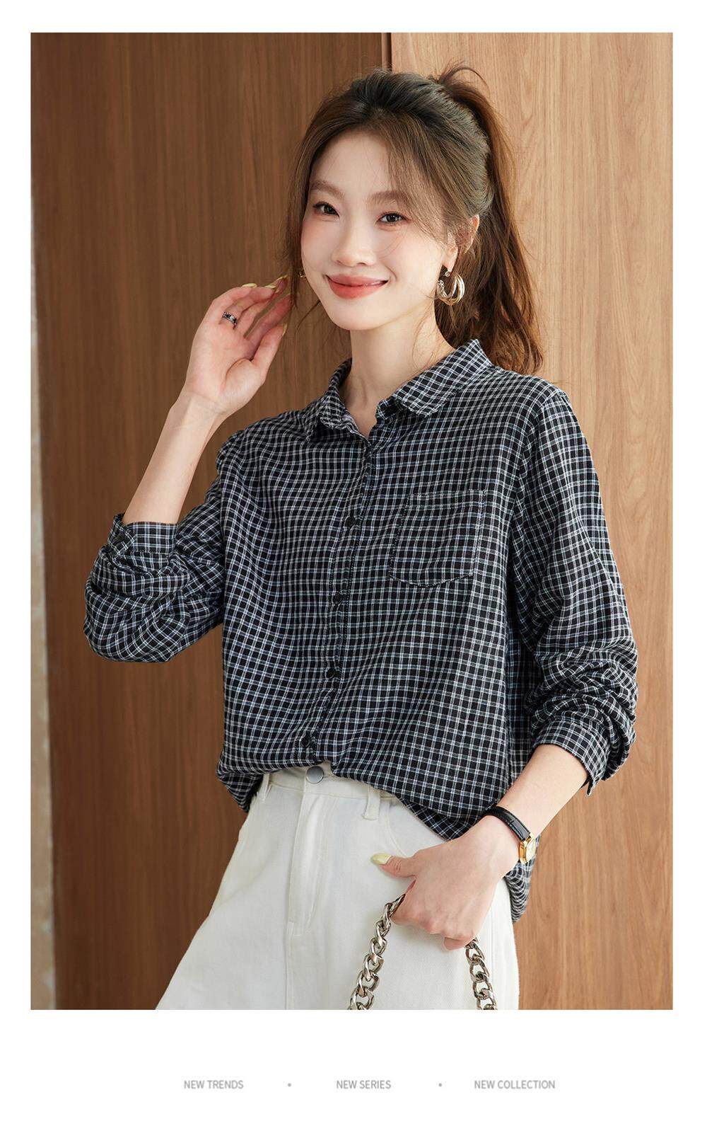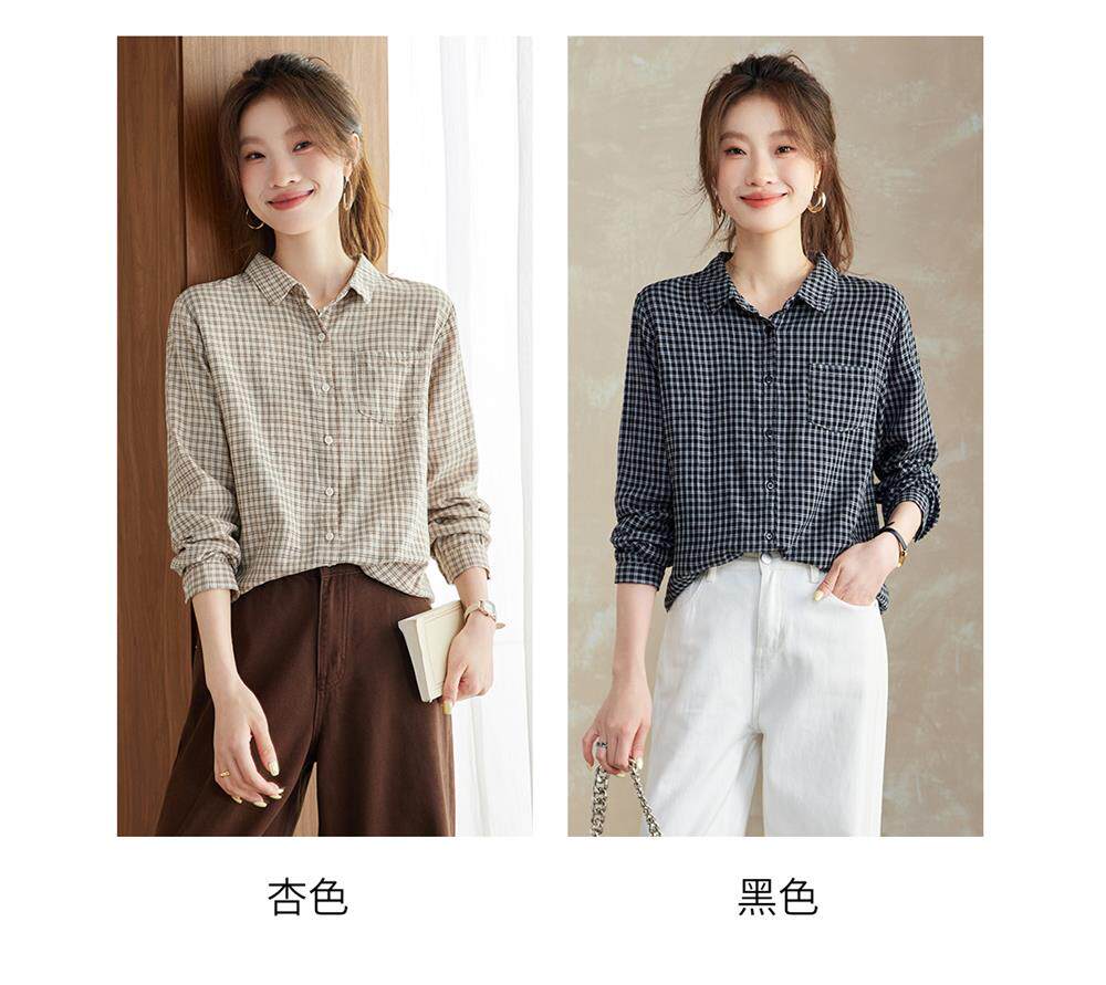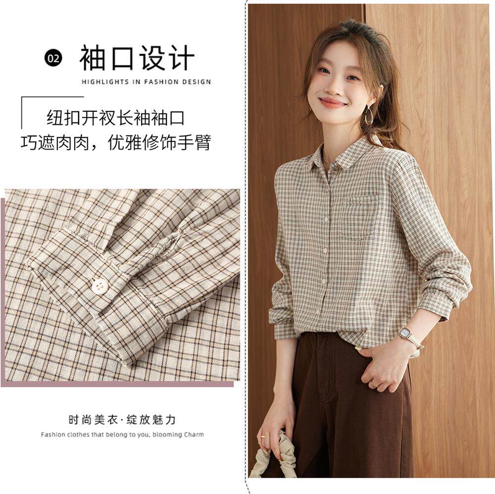 2025 Spring and Autumn New Style Pure Cotton Shirt Women's Plaid Loose Long Sleeve Professional Commuting Shirt Turn-Down Collar Casual Top
