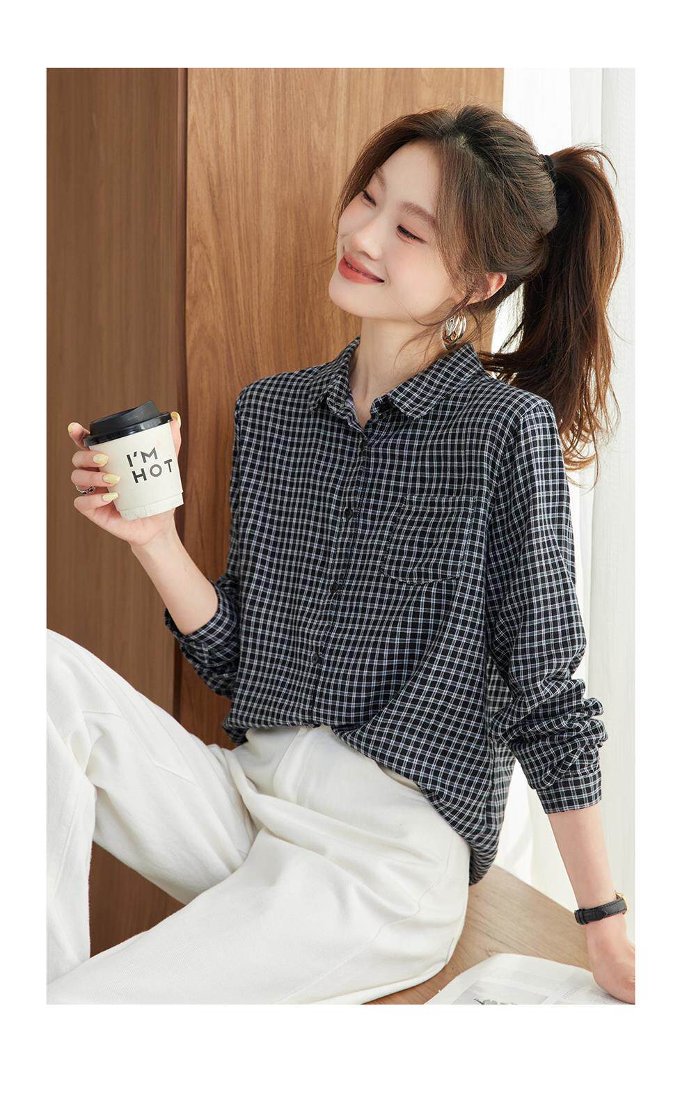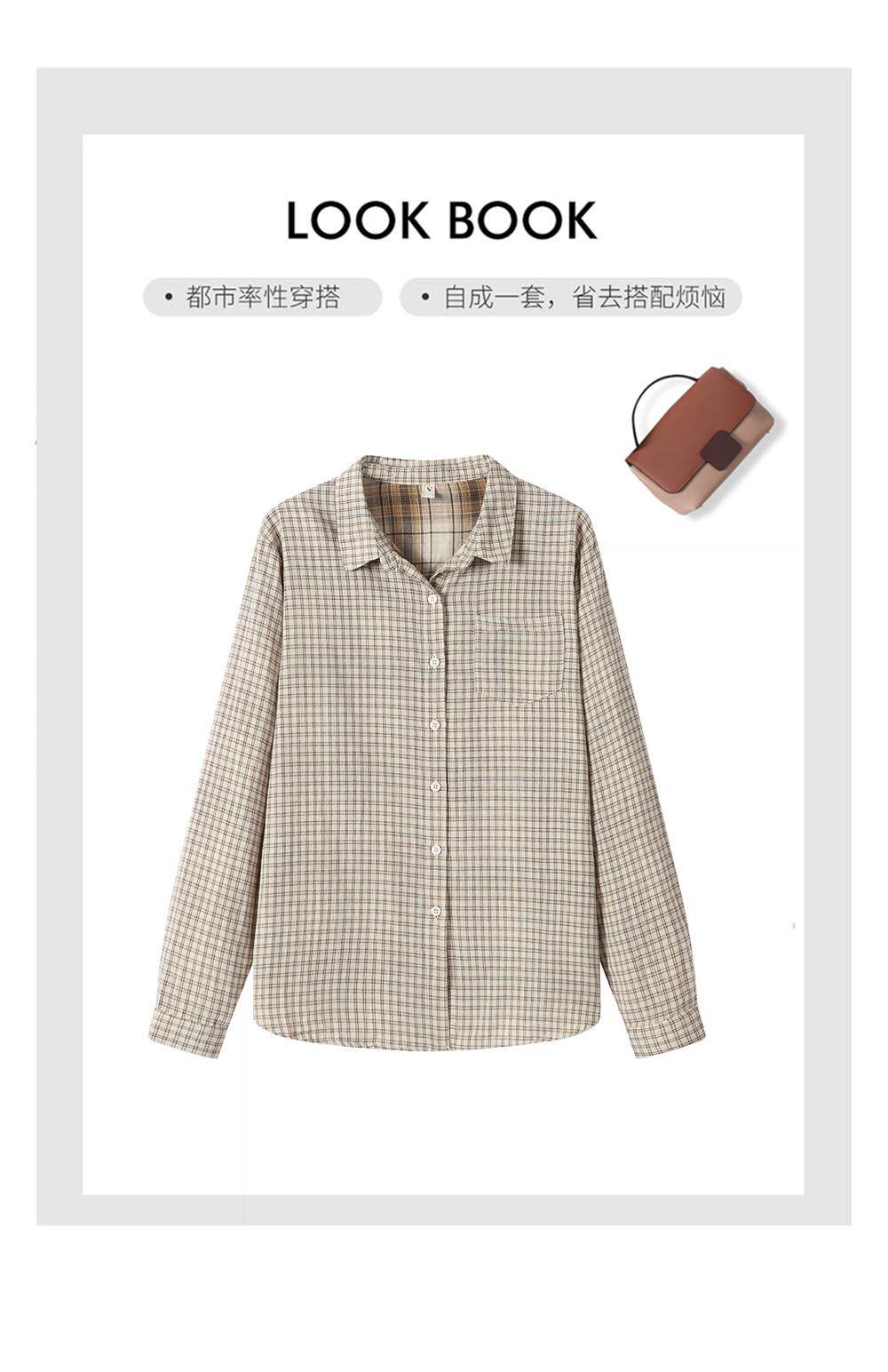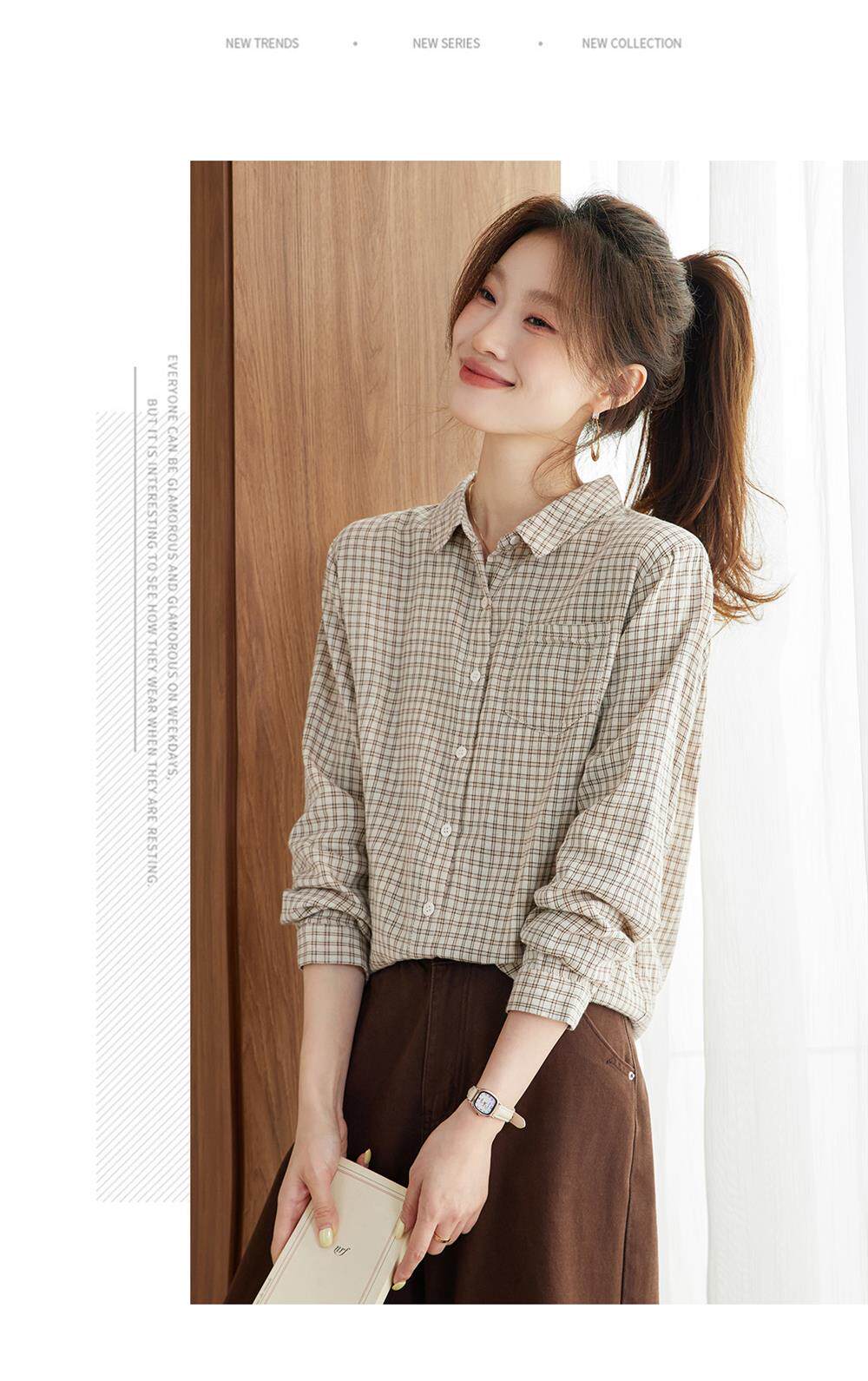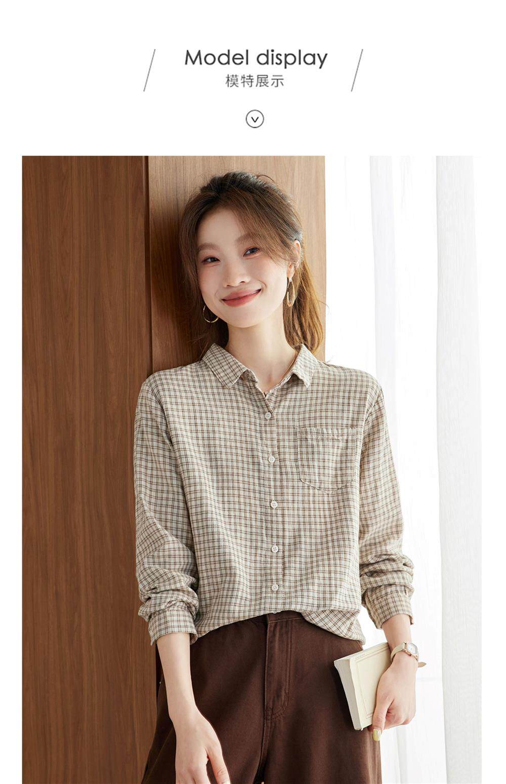 2025 Spring and Autumn New Style Pure Cotton Shirt Women's Plaid Loose Long Sleeve Professional Commuting Shirt Turn-Down Collar Casual Top