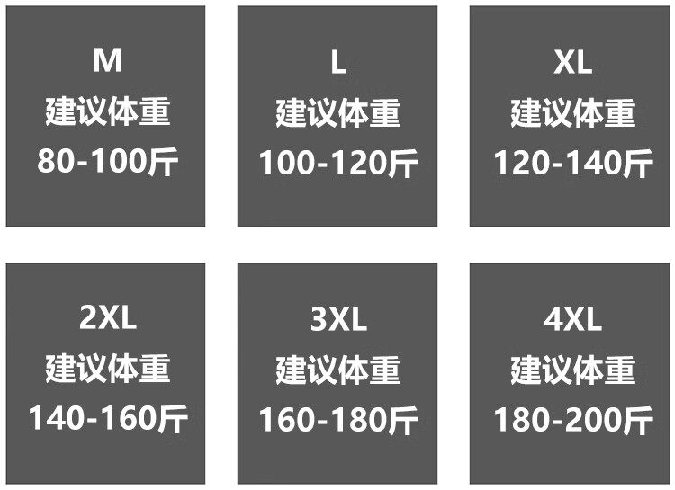 Size M 90-115 Jin Jin equals 0.5 kg,L 115-130 Jin Jin equals 0.5 kg,XL 130-145Jin Jin equals 0.5 kg,2XL 145-160Jin Jin equals 0.5 kg,3XL 160-175 Jin Jin equals 0.5 kg,4XL 175-200Jin Jin is equal to 0.5kg