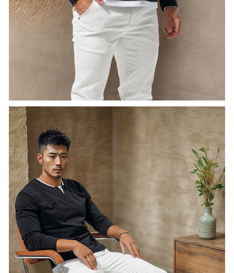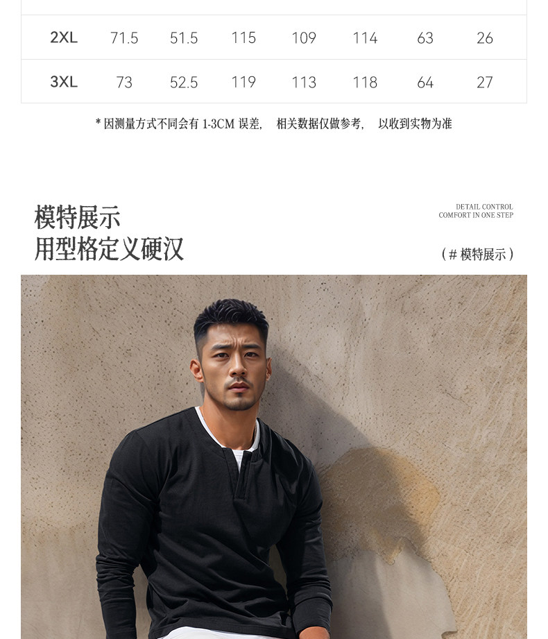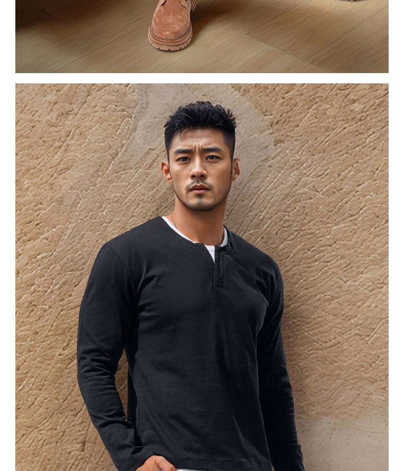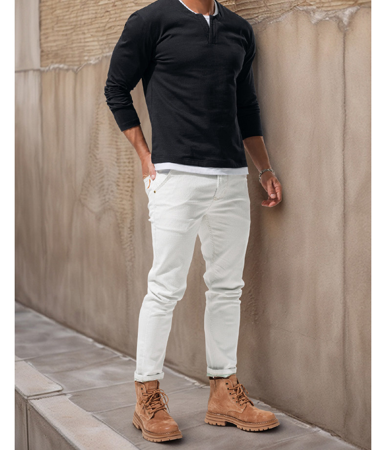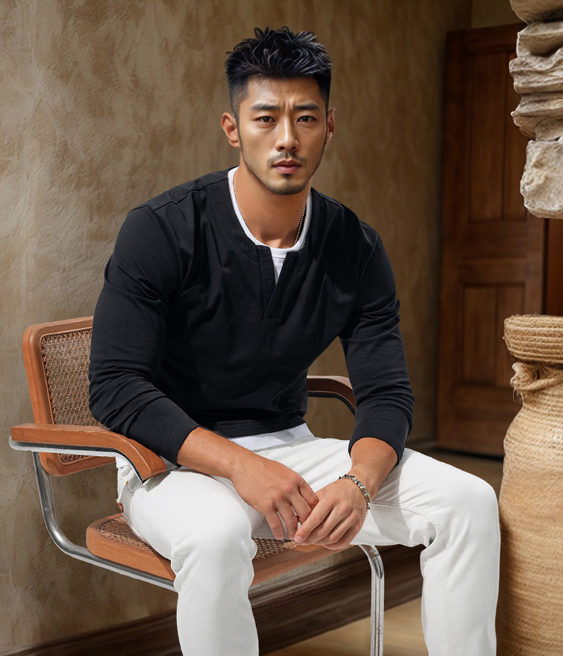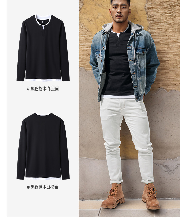 Autumn Heavyweight Retro Long-Sleeve T-Shirt for Men, Pure Cotton V-Neck Black Casual Patchwork Color-Blocking High-End Top, Early Autumn Trend