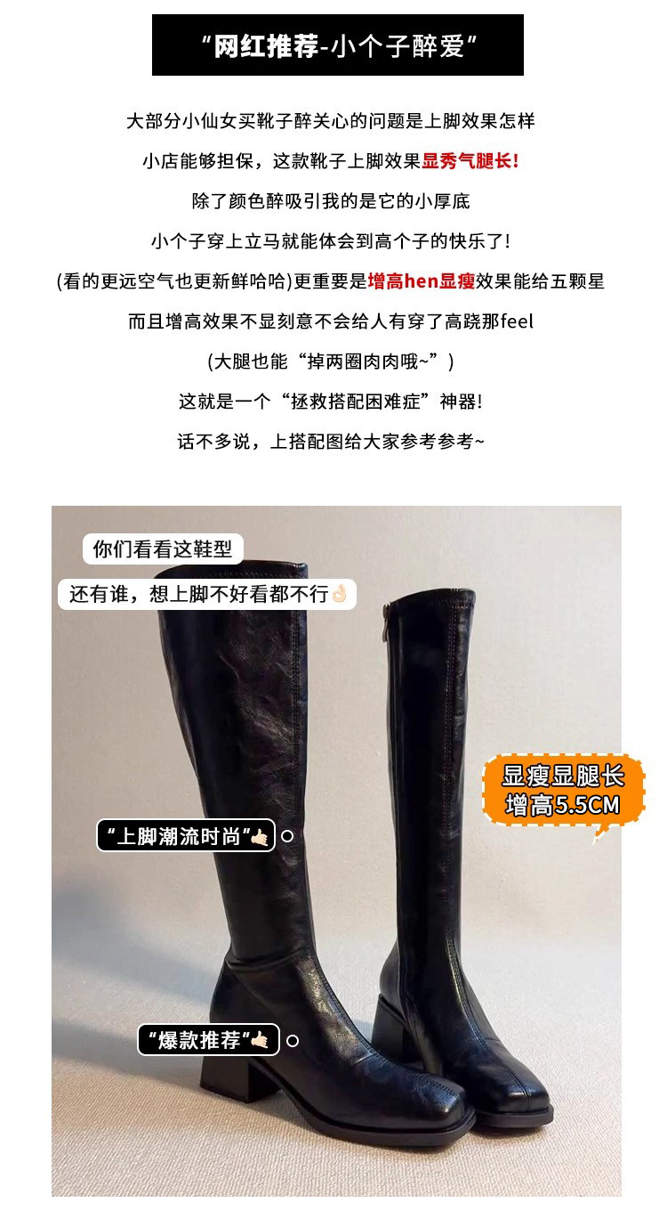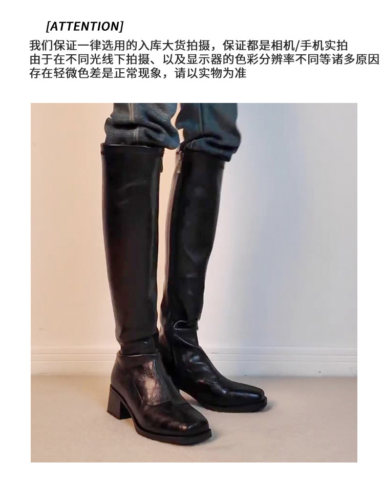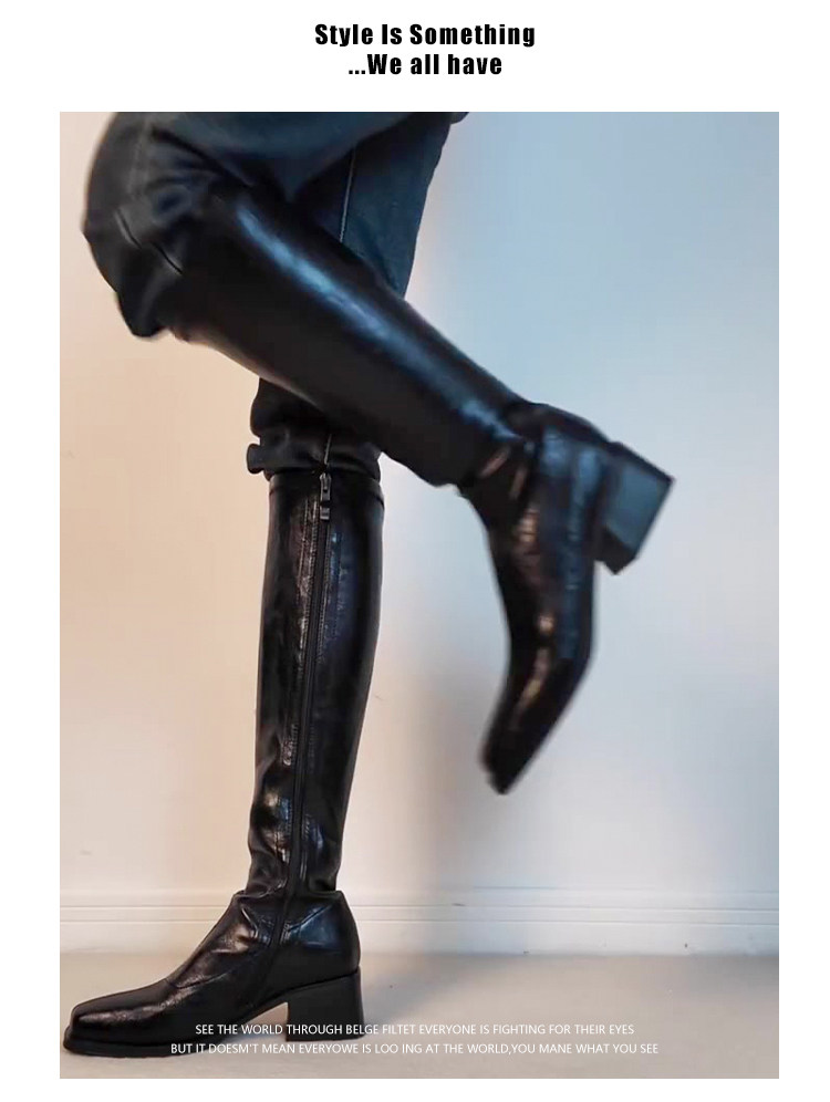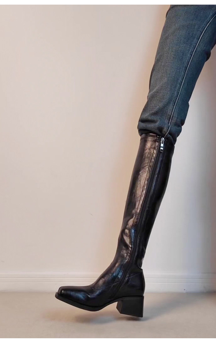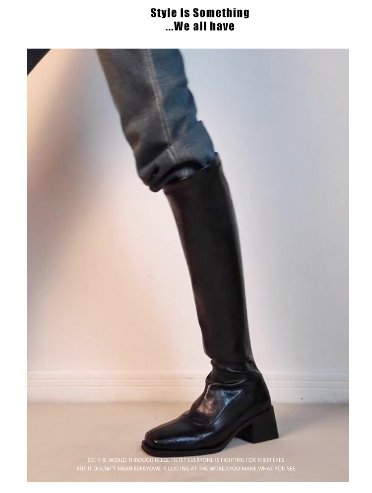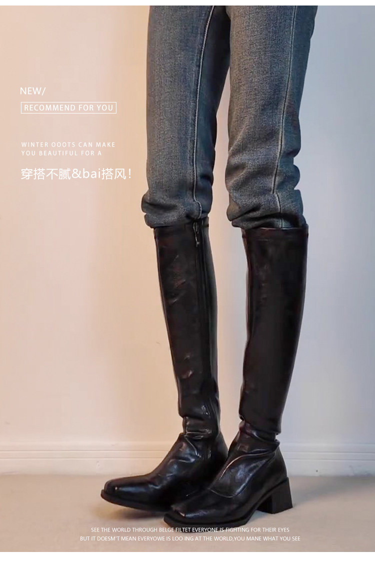Cowhide Retro Thick-Heeled Long Boots for Women, Elastic High-Top Riding Boots, Autumn and Winter Over-The-Knee Versatile Square-Toe Thick-Soled Long Boots