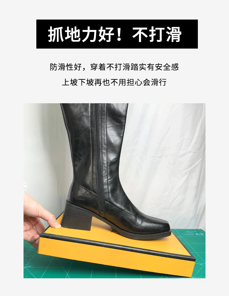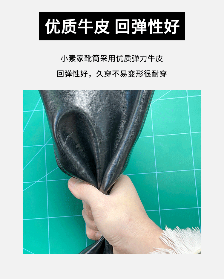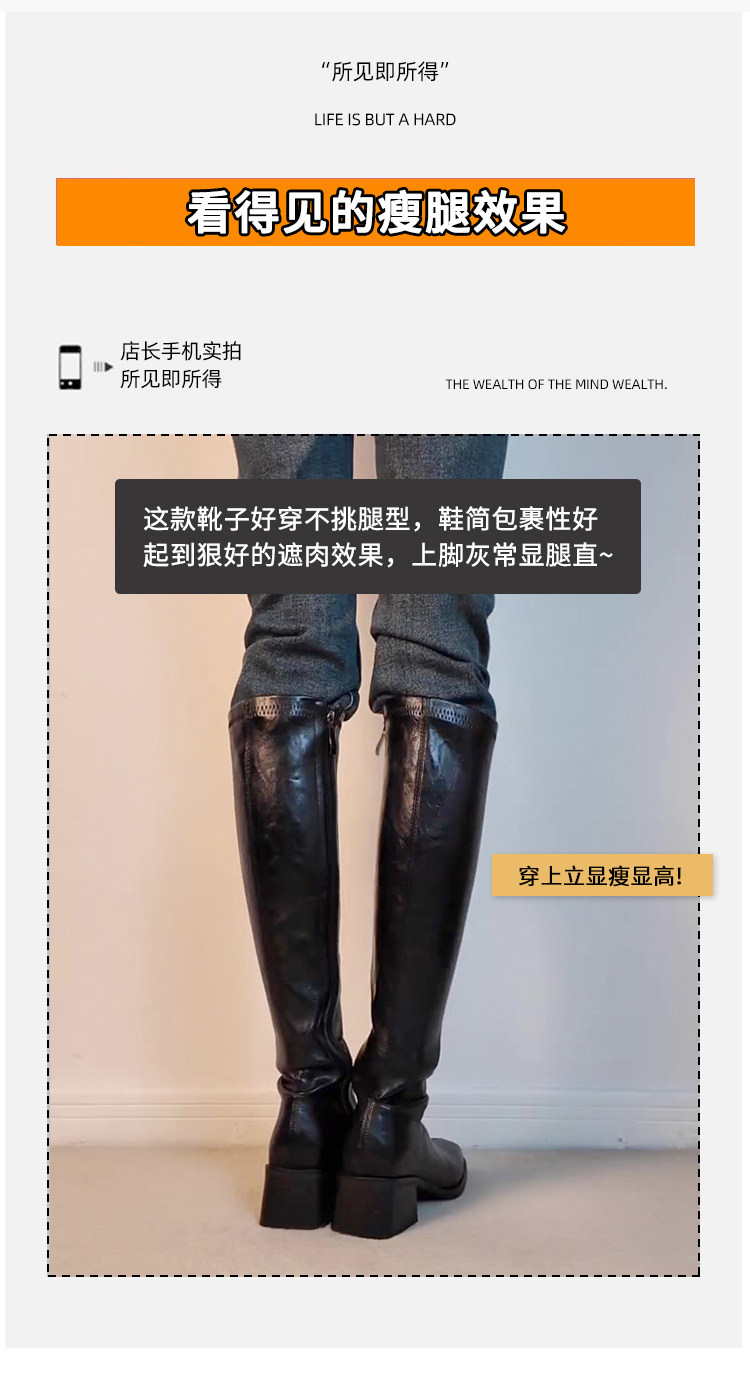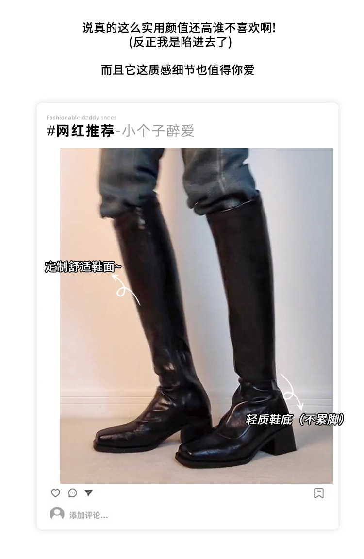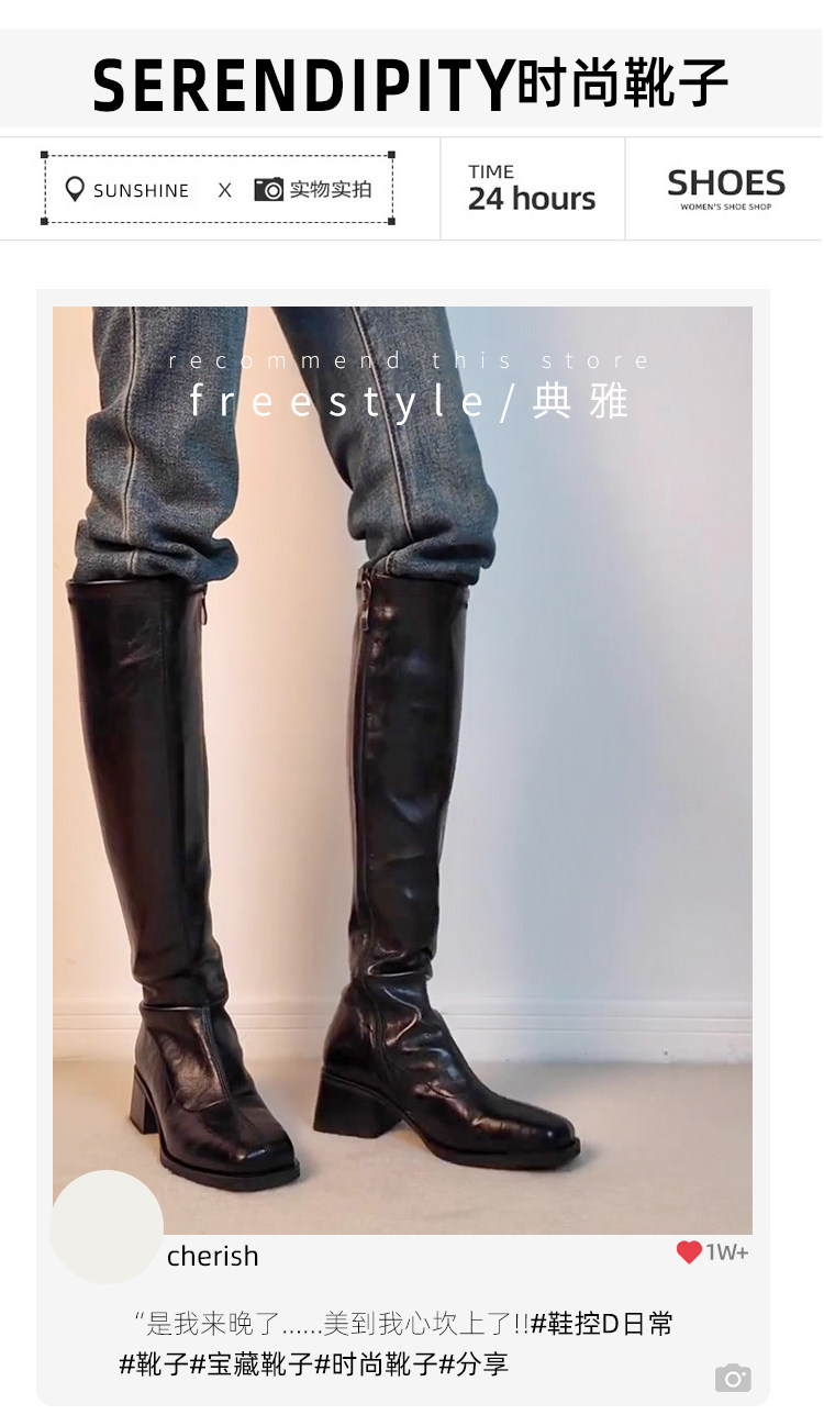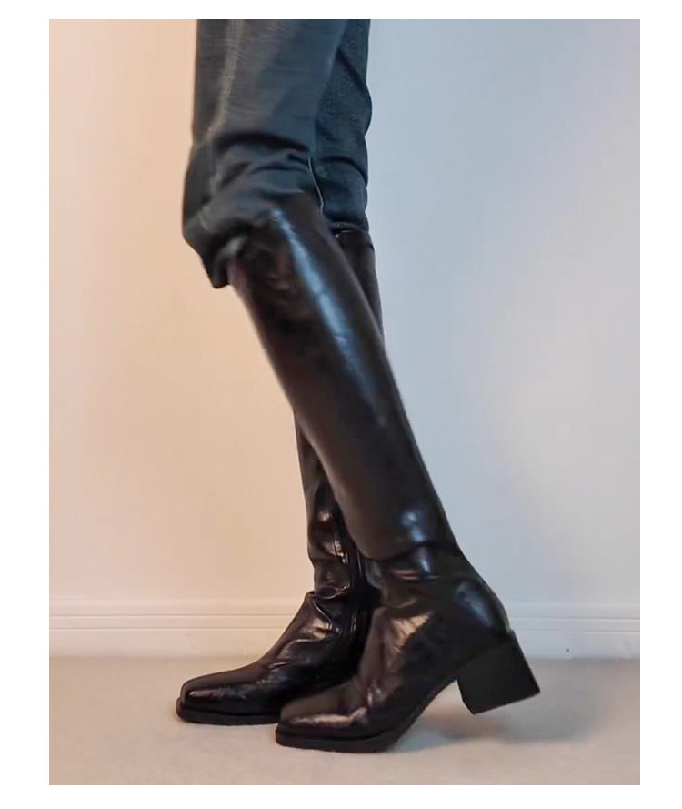 Cowhide Retro Thick-Heeled Long Boots for Women, Elastic High-Top Riding Boots, Autumn and Winter Over-The-Knee Versatile Square-Toe Thick-Soled Long Boots