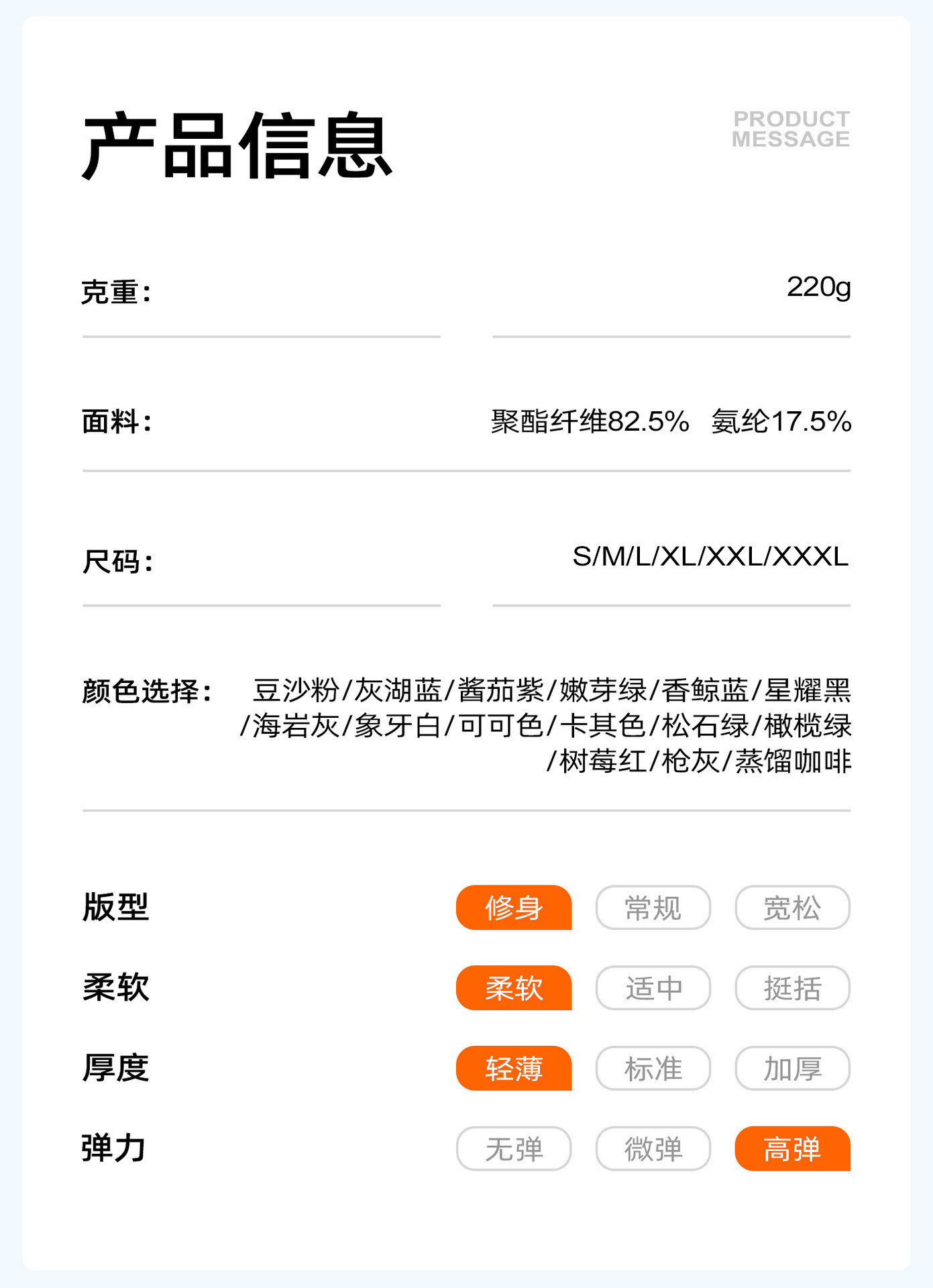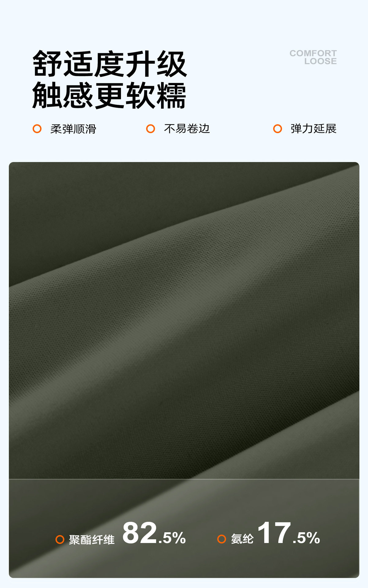 Material ingredients Polyester fiber 82.5% polyurethane elastic fiber (spandex) 17.5%