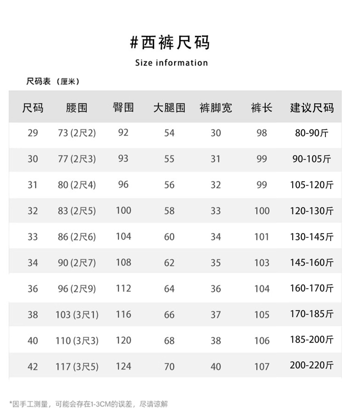 China (cm) 160-165/84-86 165-170 / 88-90 167-172 / 92-96 168-173 / 98-102 170-176 / 106-110