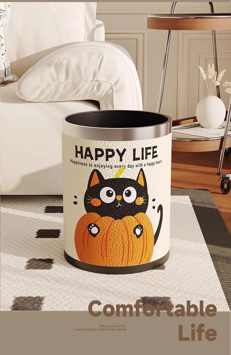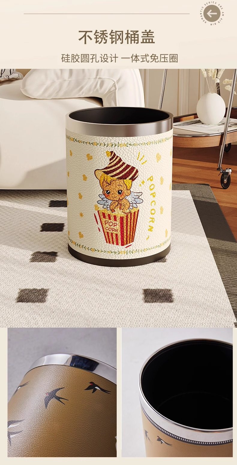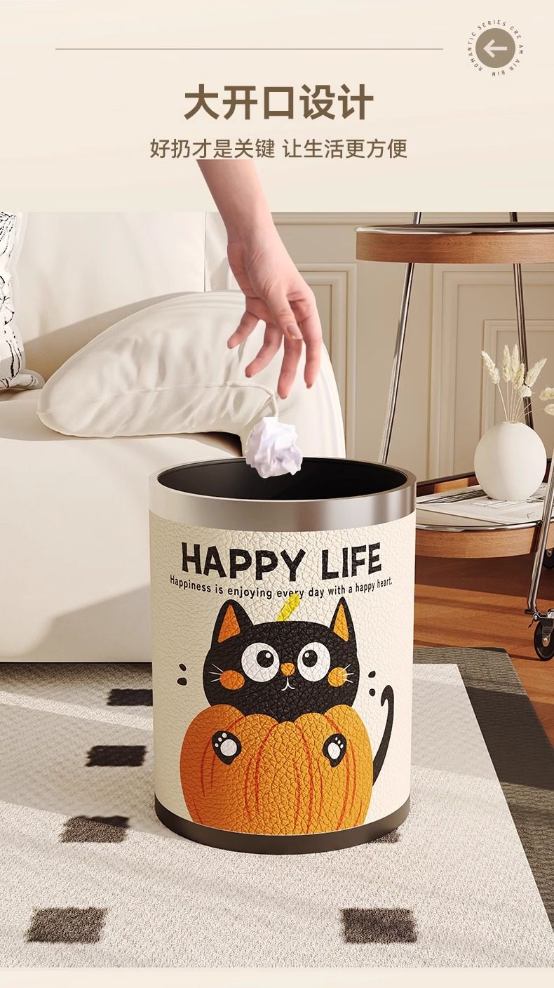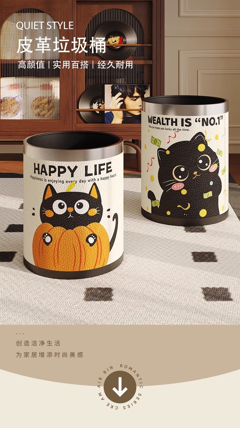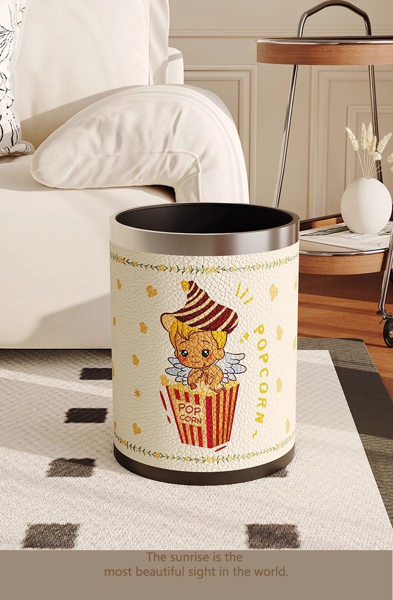 Cartoon leather trash can for home living room, light luxury, high-end sanitary bucket, kitchen, good-looking, cute, large-capacity paper basket