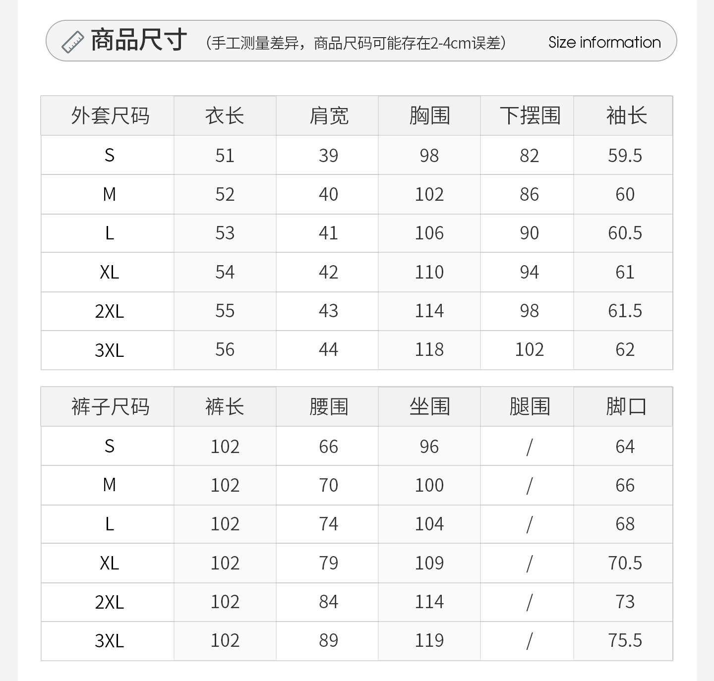 Outseam (cm) 99 cm 101.5 cm 104 cm 106.5 cm 109 cm