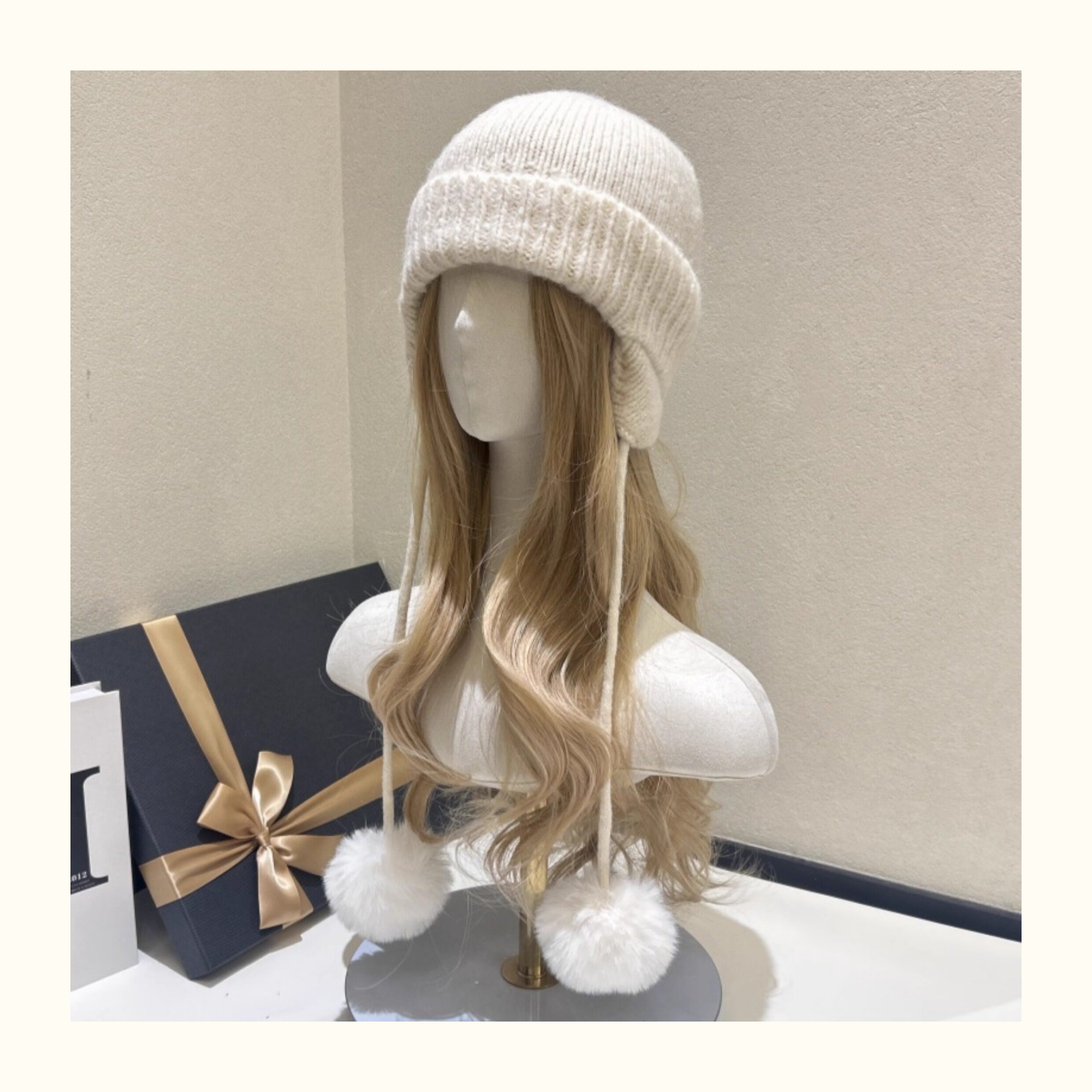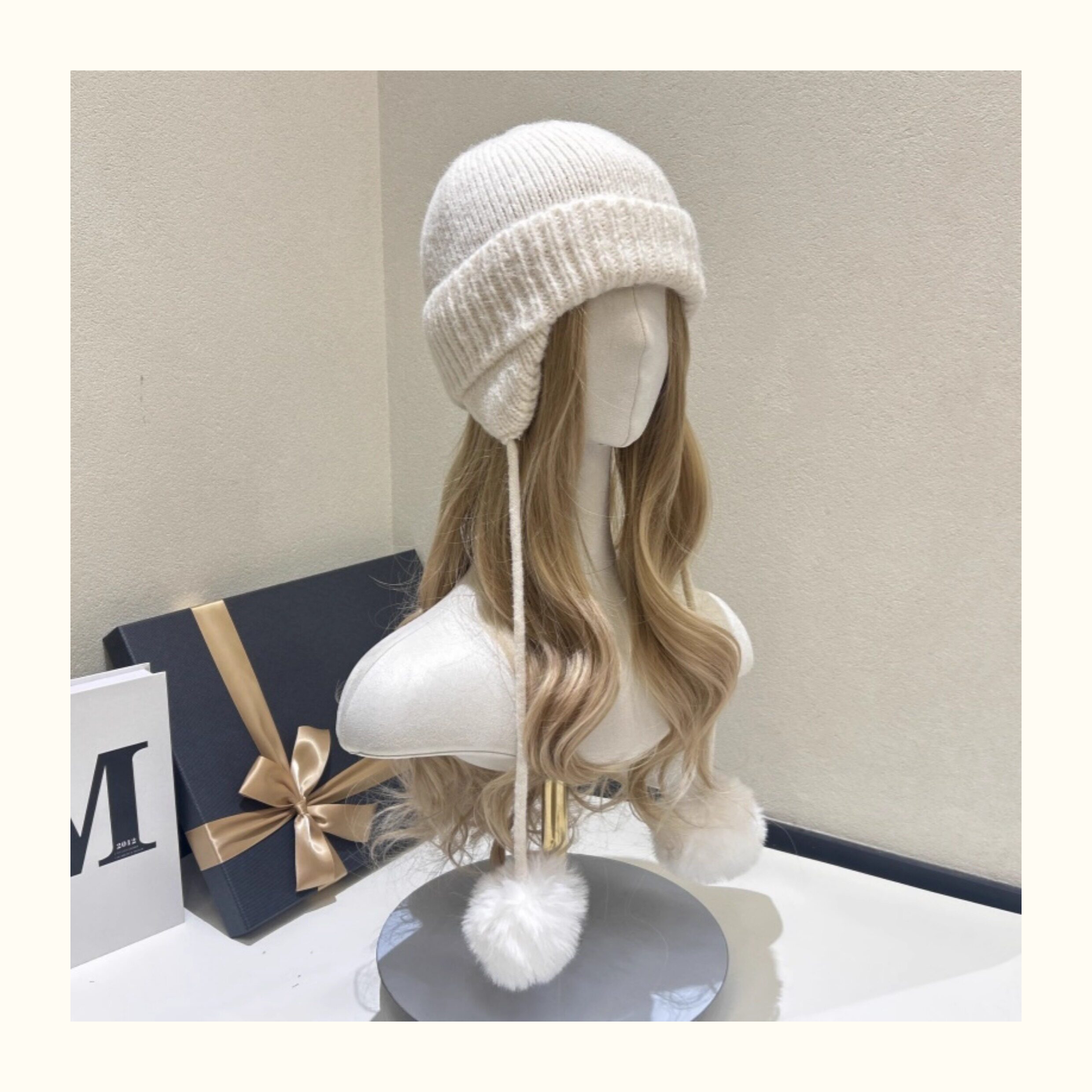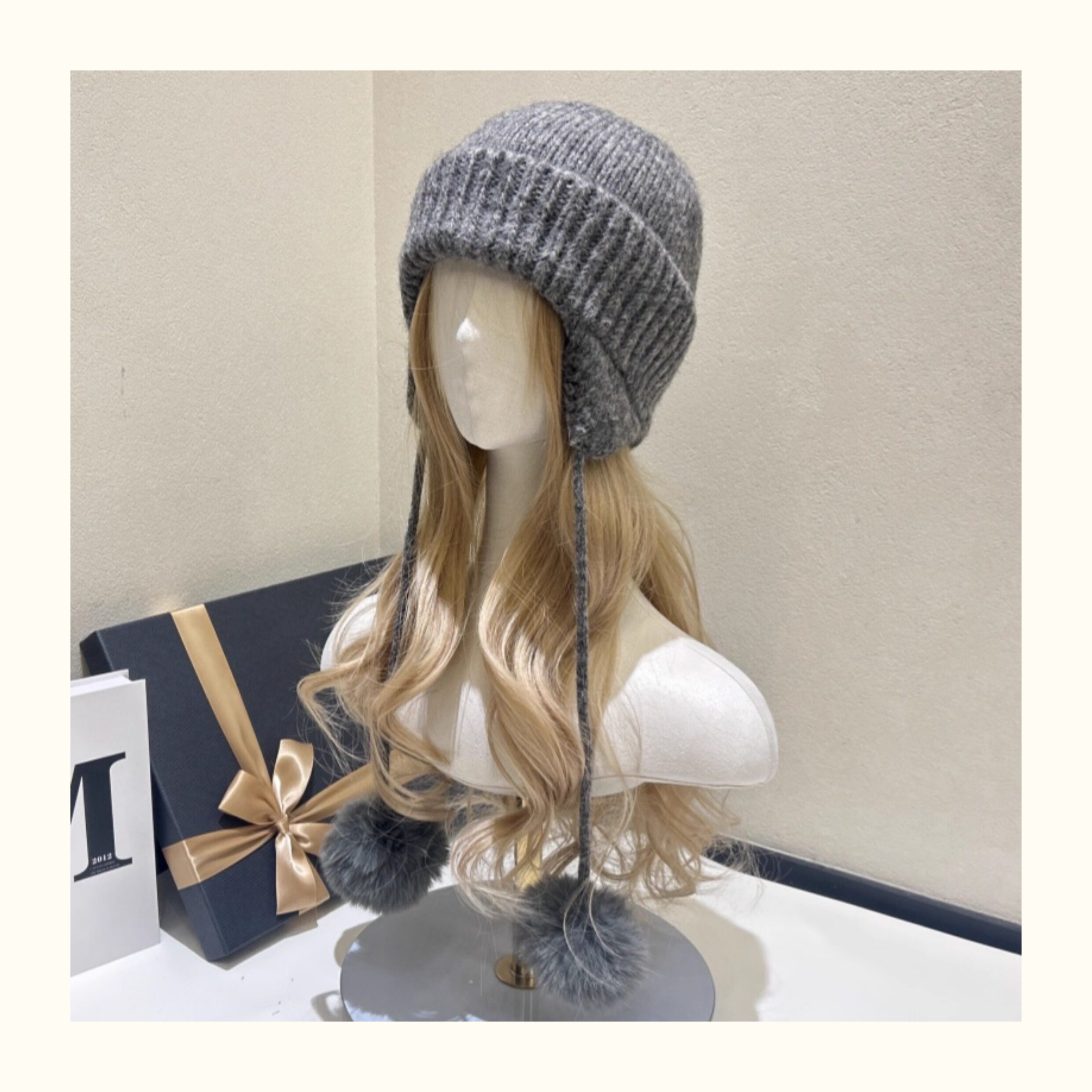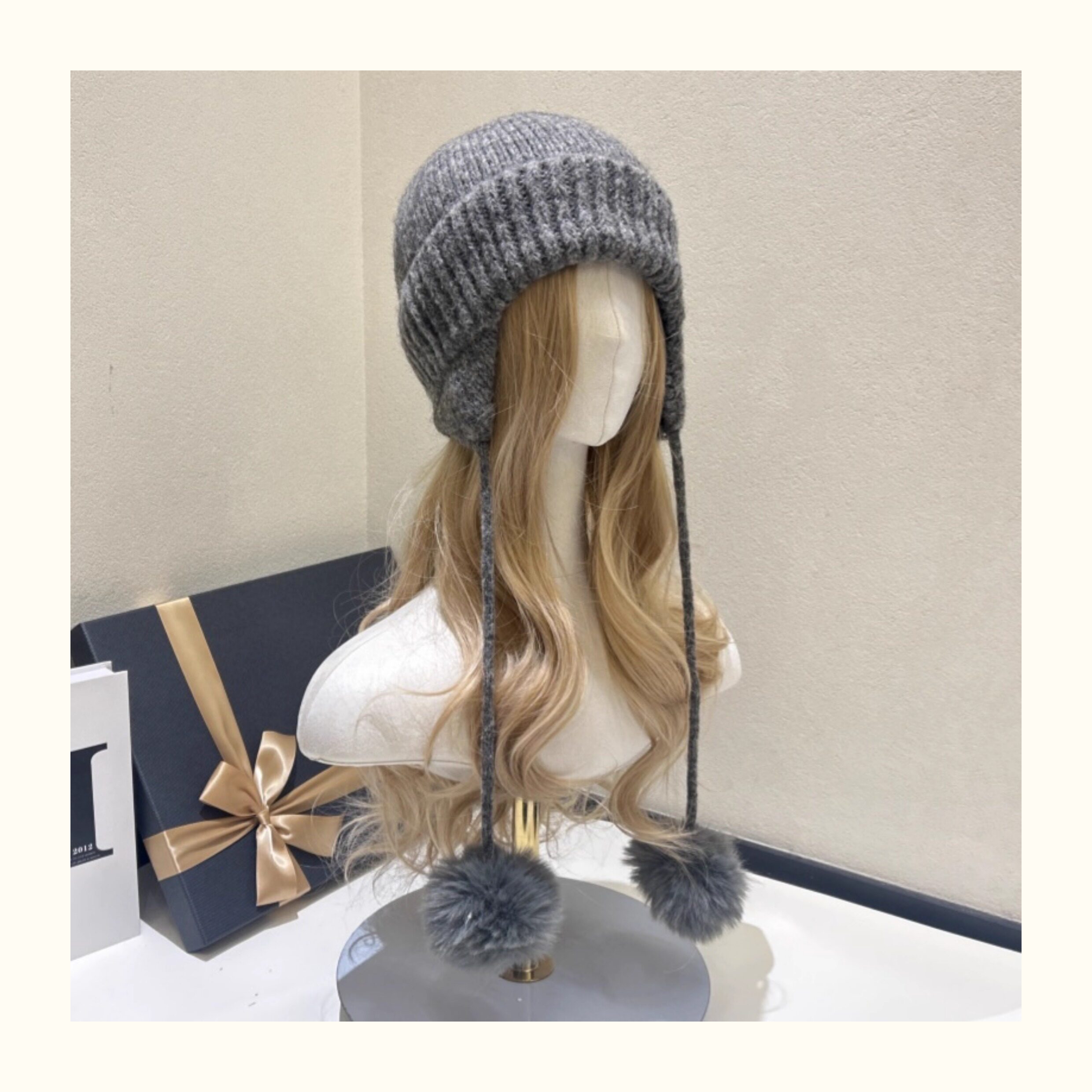 Korean Style Pom-Pom Knitted Wool Hat for Women, Thickened, Warm, Cute, Cold-Proof, Ear-Protecting Hat, Fluffy Lei Feng Hat, Winter Hat