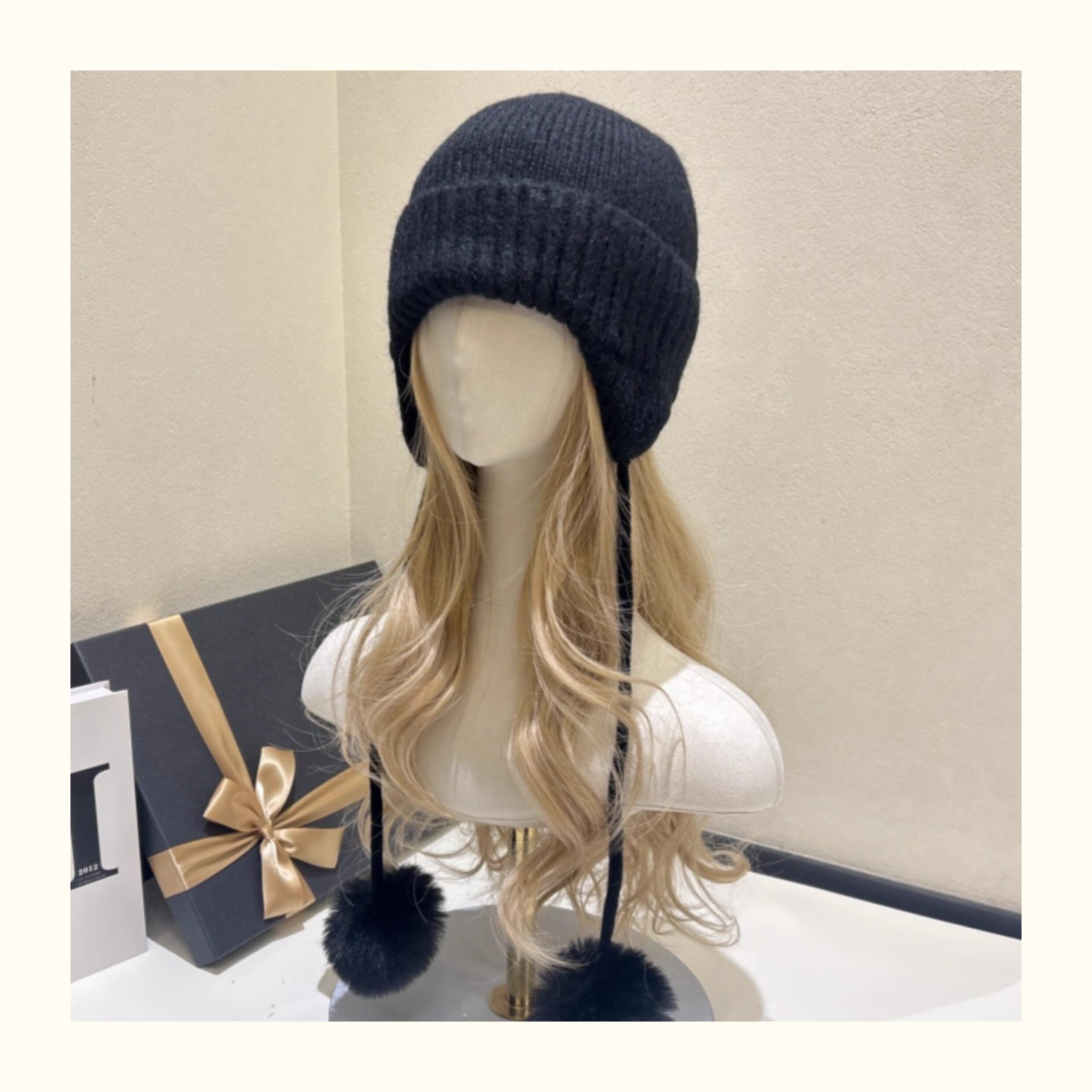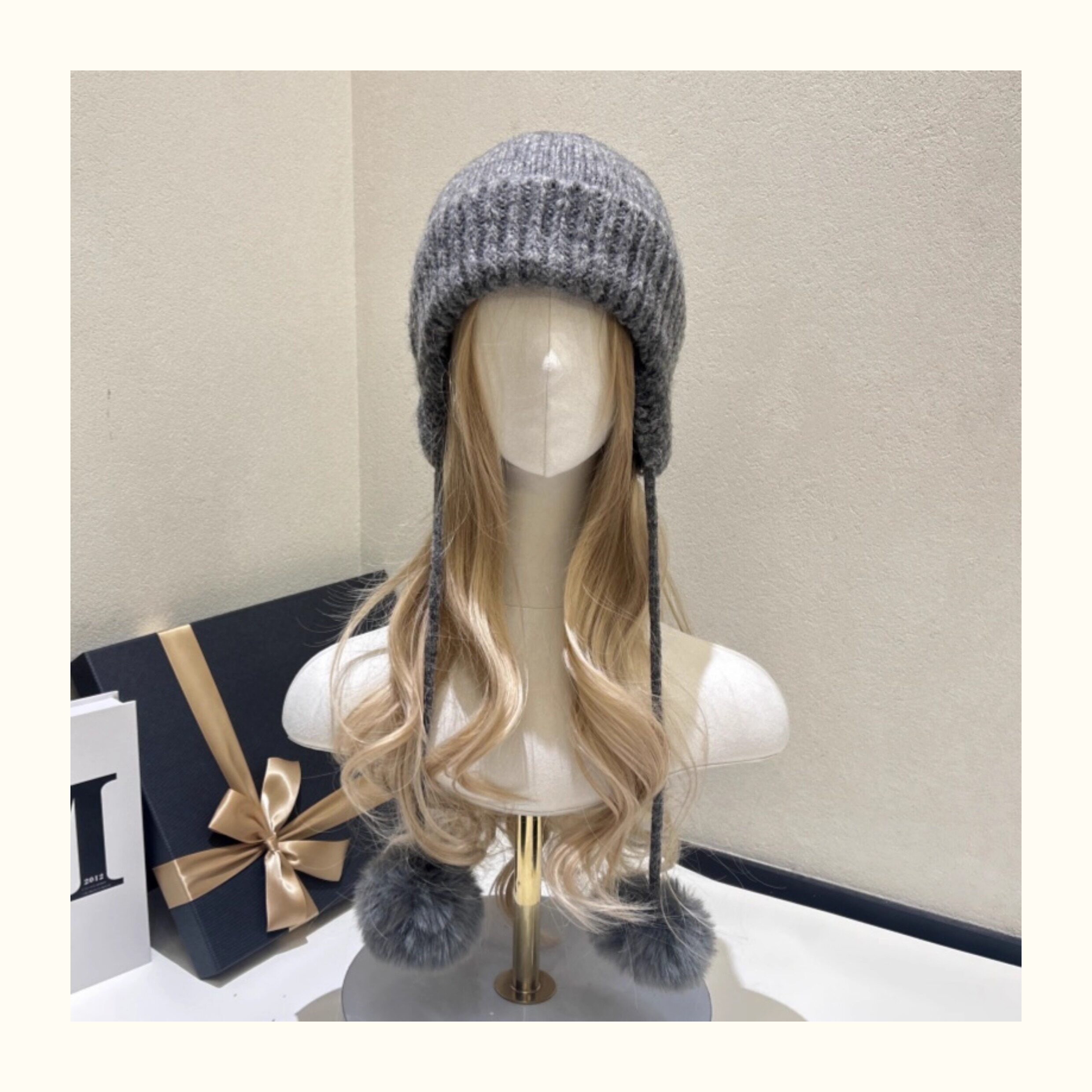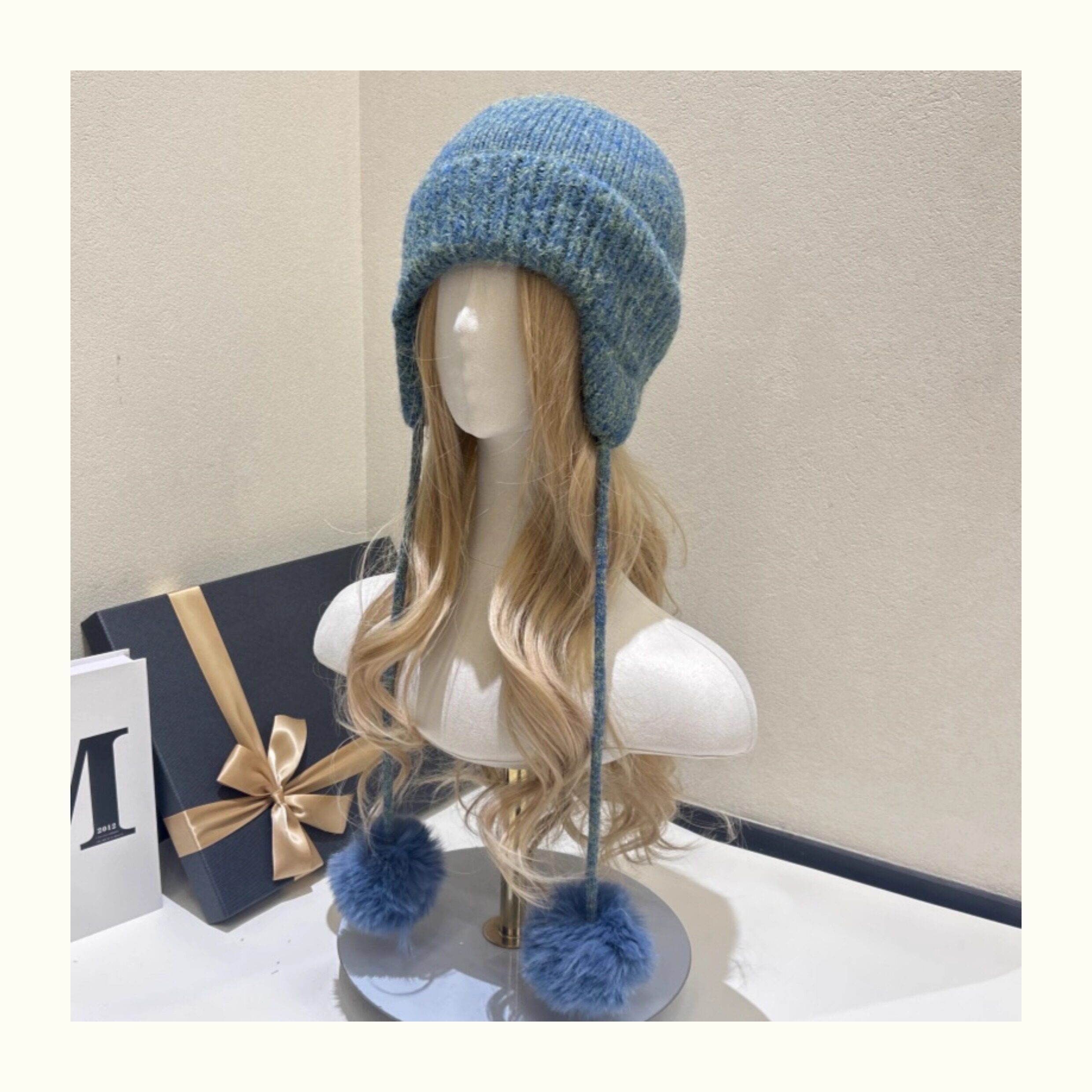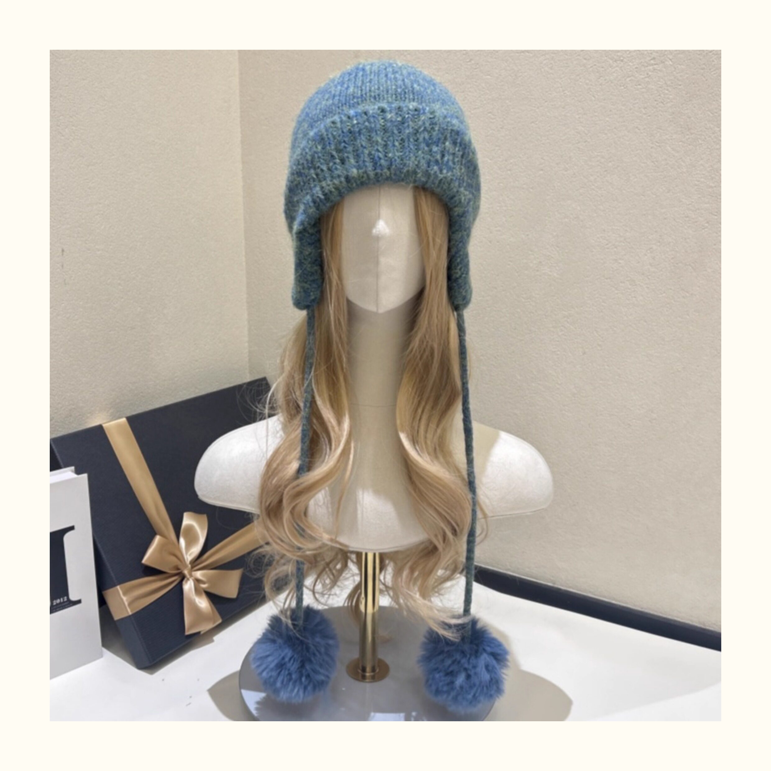 Korean Style Pom-Pom Knitted Wool Hat for Women, Thickened, Warm, Cute, Cold-Proof, Ear-Protecting Hat, Fluffy Lei Feng Hat, Winter Hat