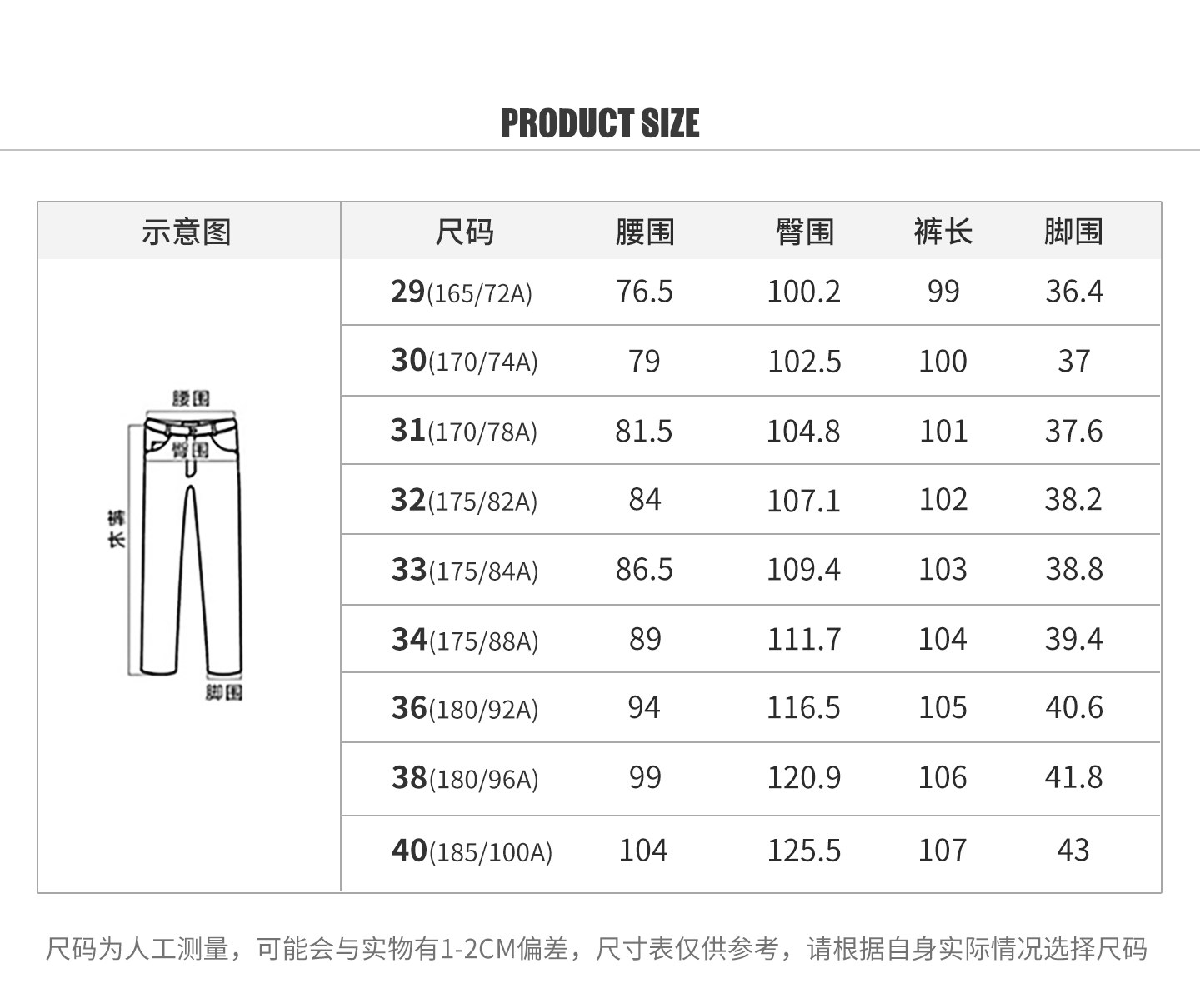 Outseam (cm) 99 cm 101.5 cm 104 cm 106.5 cm 109 cm
