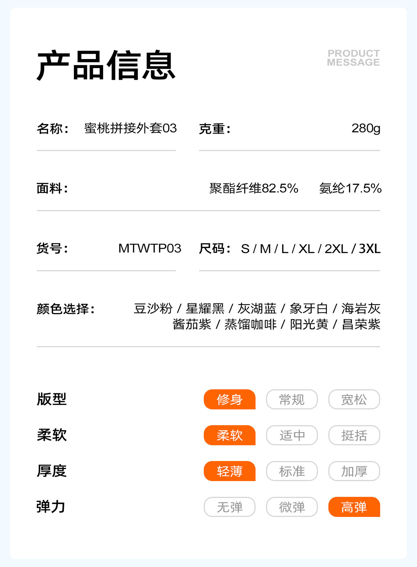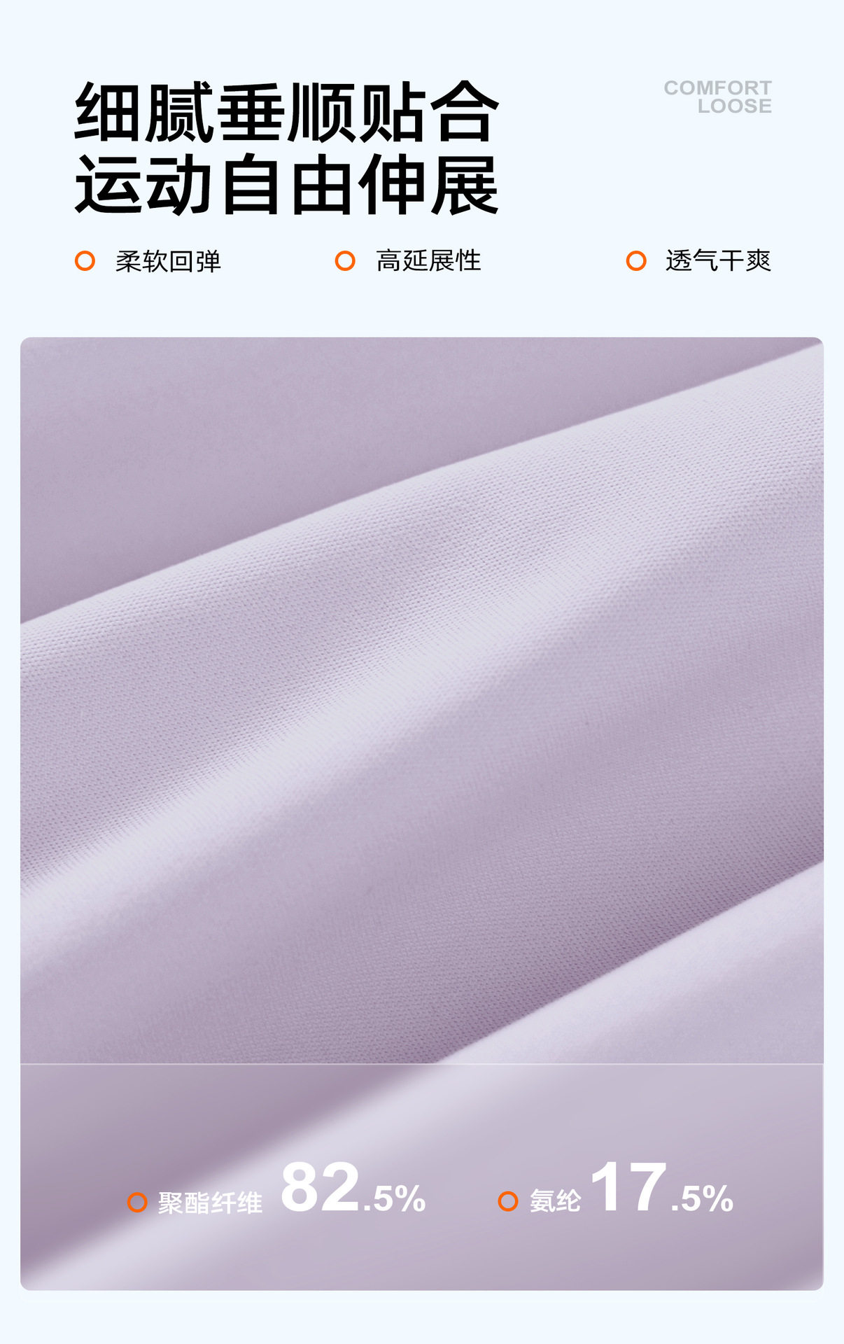 Material ingredients Polyester fiber 82.5% polyurethane elastic fiber (spandex) 17.5%