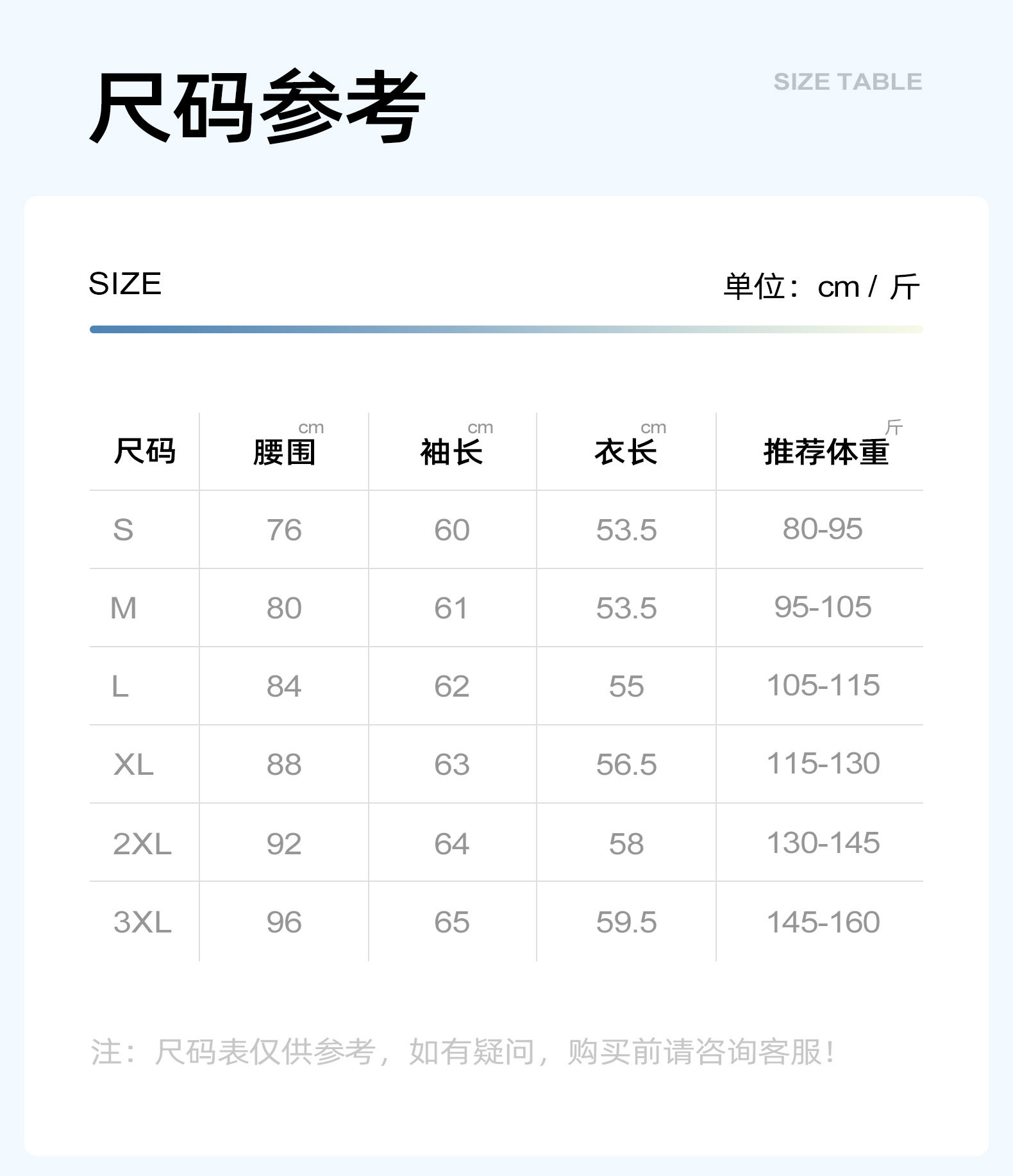 China (cm) 160-165/84-86 165-170 / 88-90 167-172 / 92-96 168-173 / 98-102 170-176 / 106-110