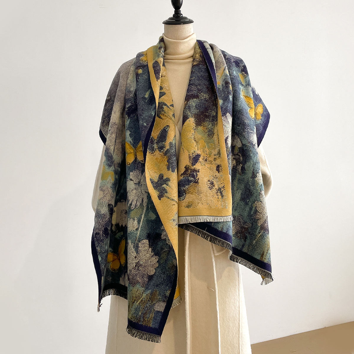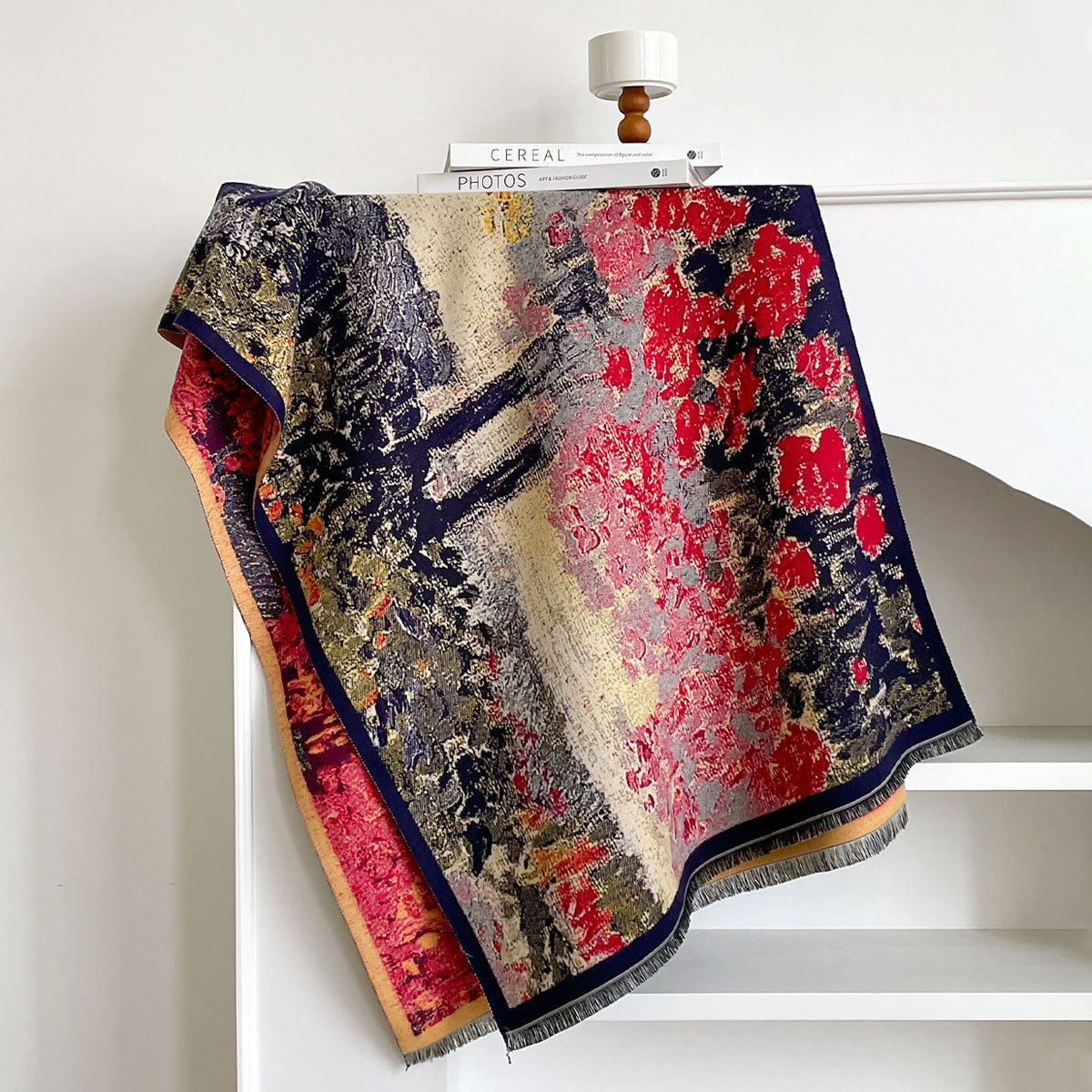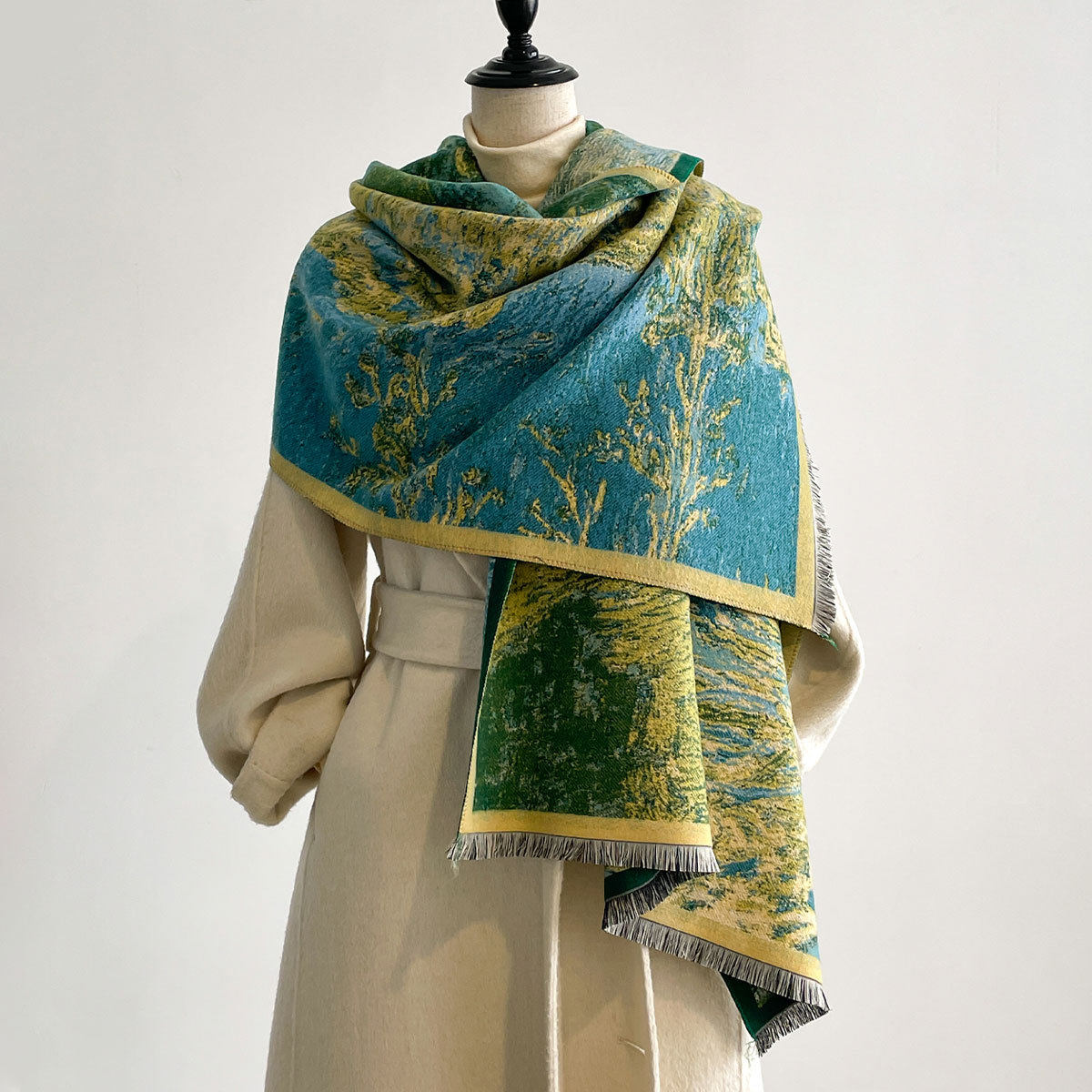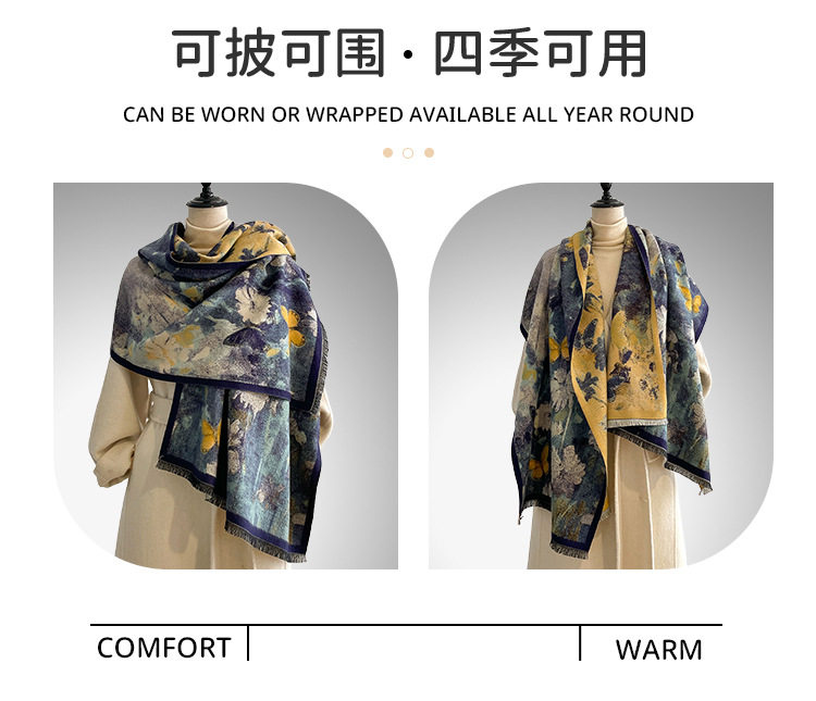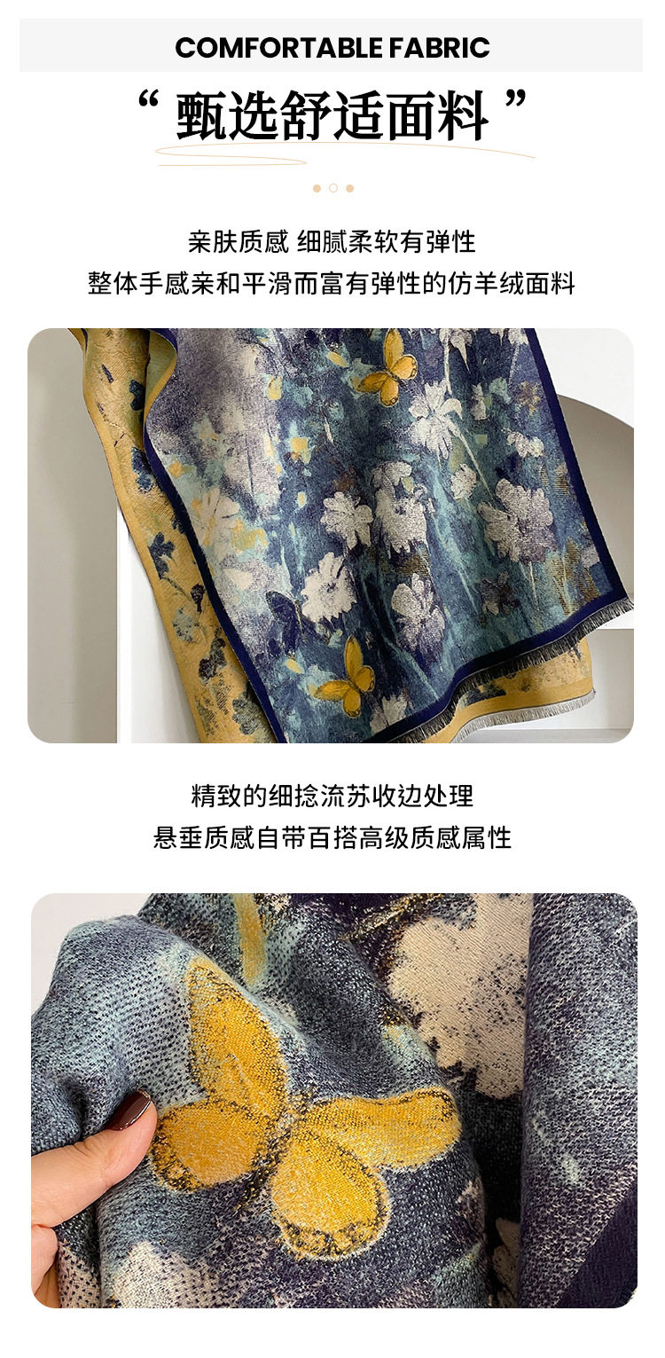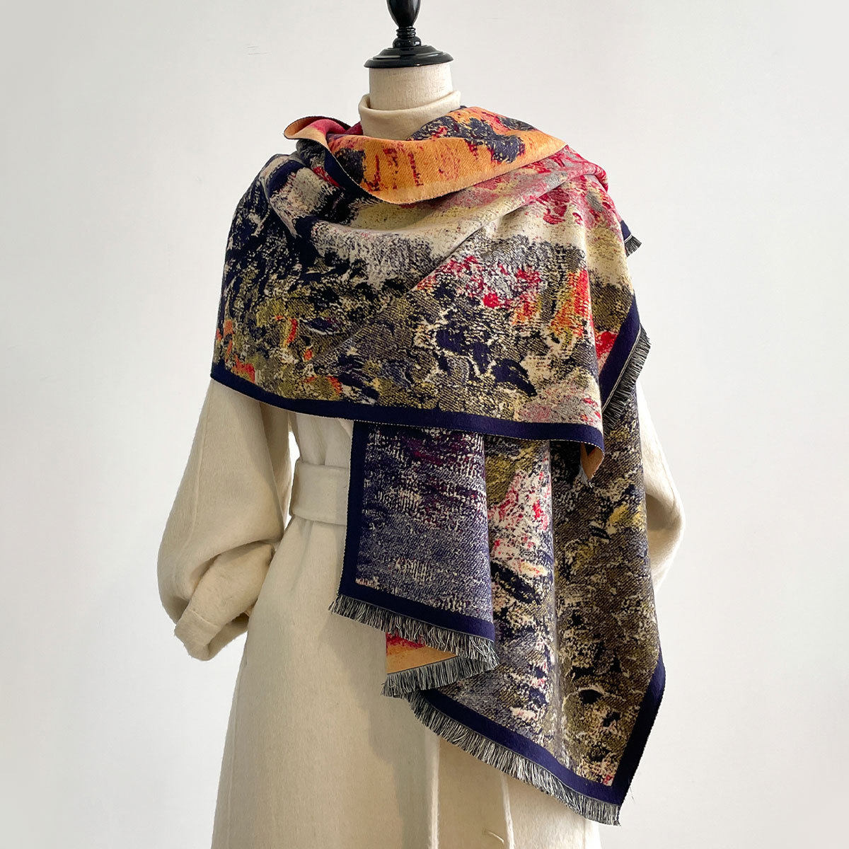 Autumn and winter new imitation cashmere scarf women's literary retro oil painting abstract tassel warm plus velvet shawl scarf