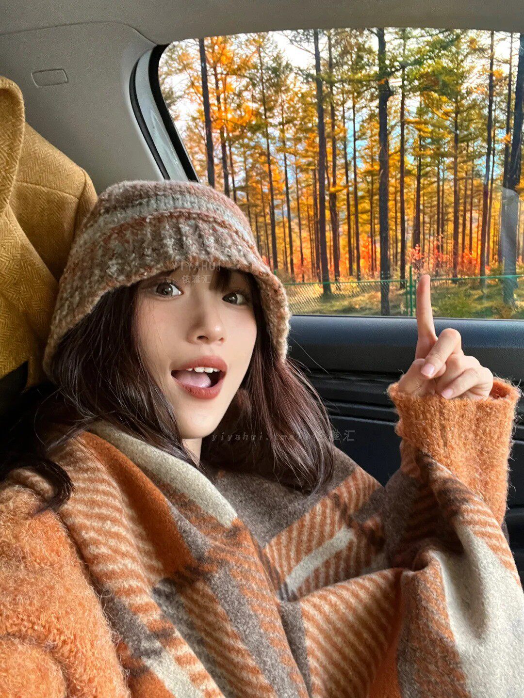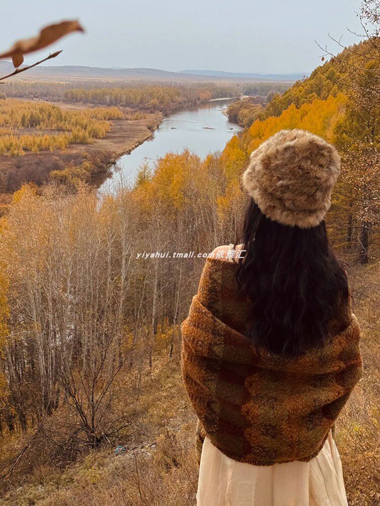 Sort by color Maillard scarf,Amber brown rabbit fur hat,Brown plaid shawl