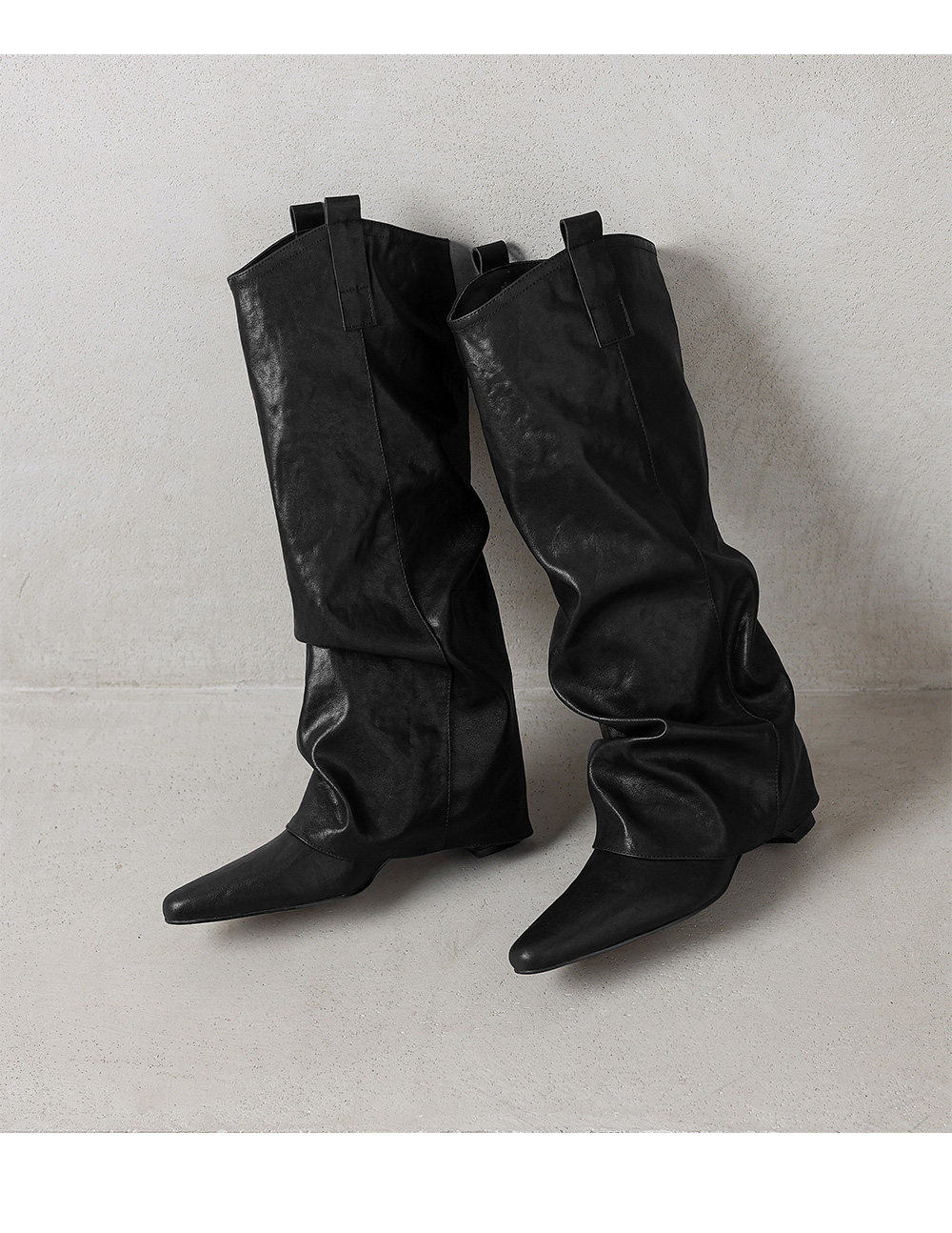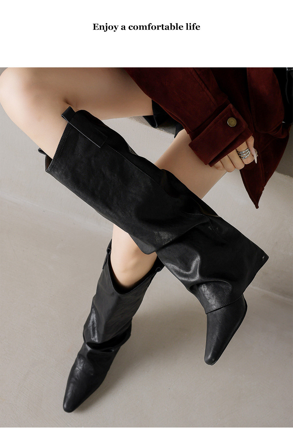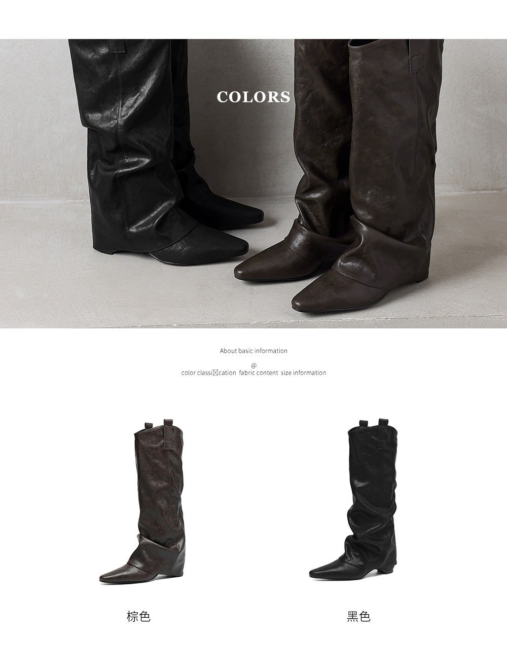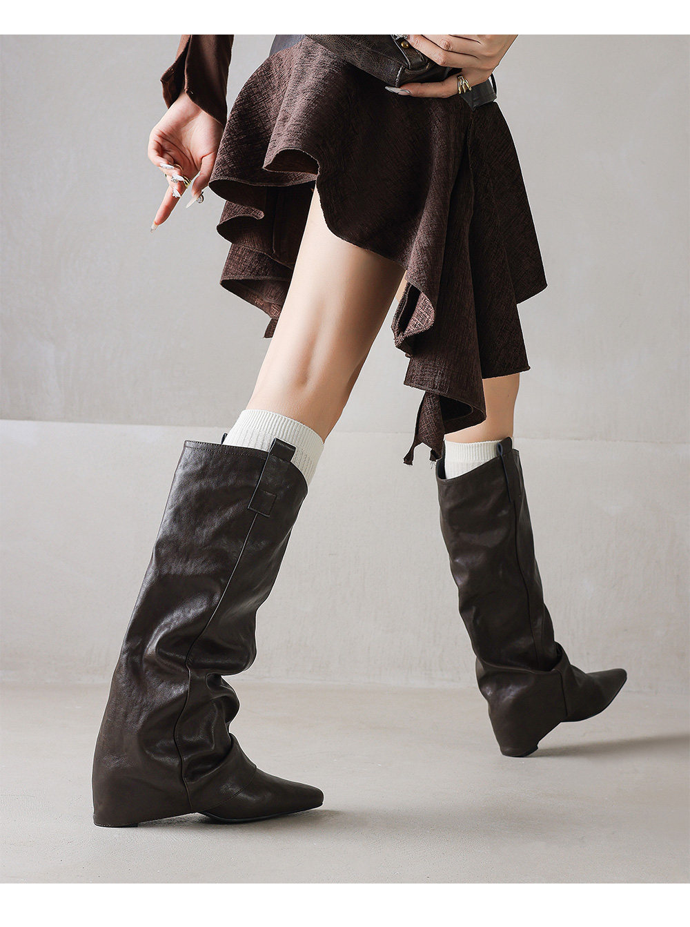 Moriwa Takumi's loose-feeling genuine leather trouser boots, women's inner heightening long boots, autumn and winter new pointed toe thick heel knight boots