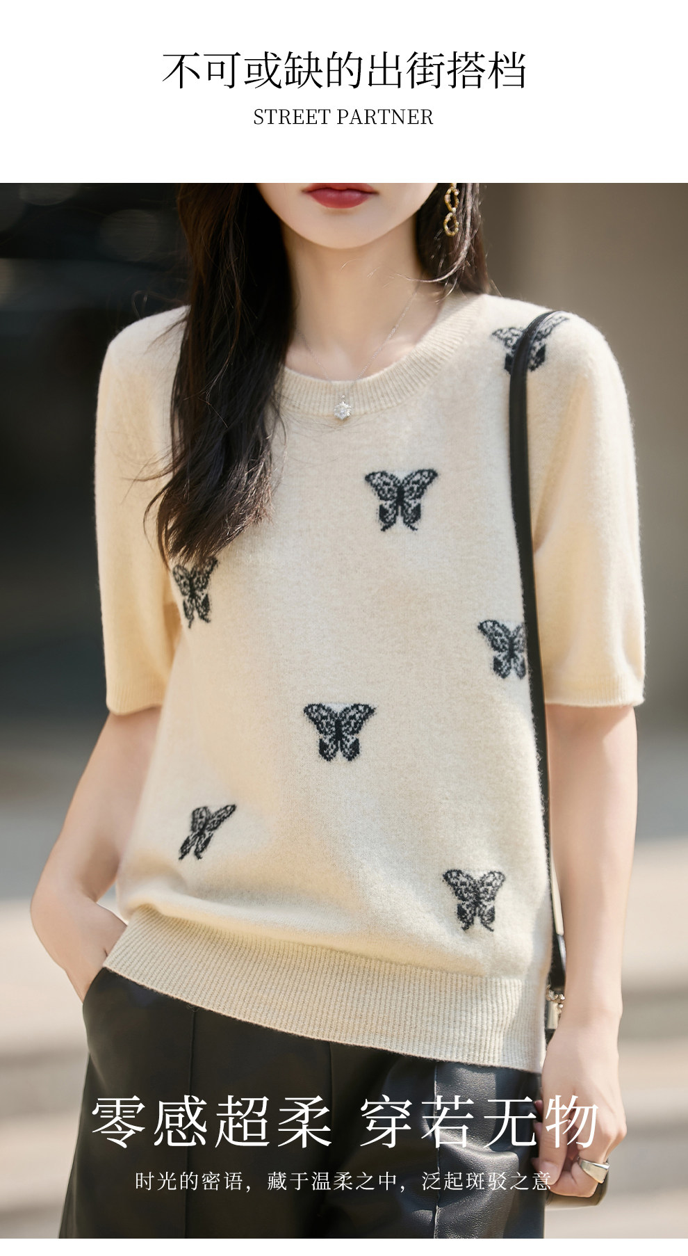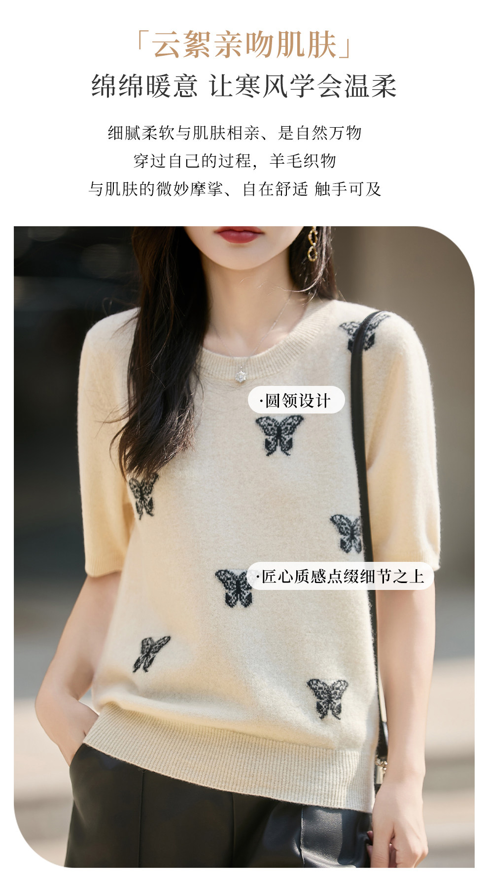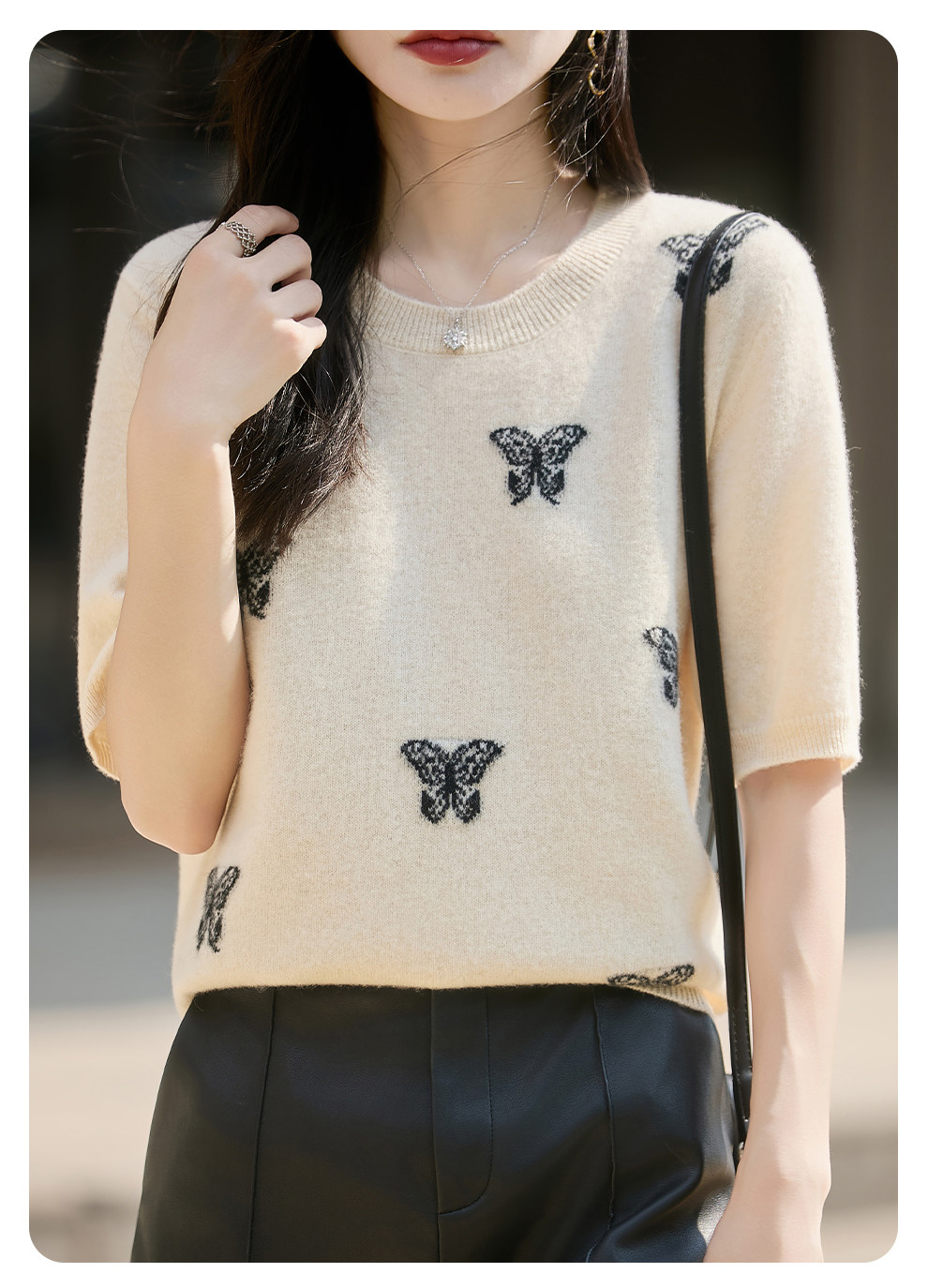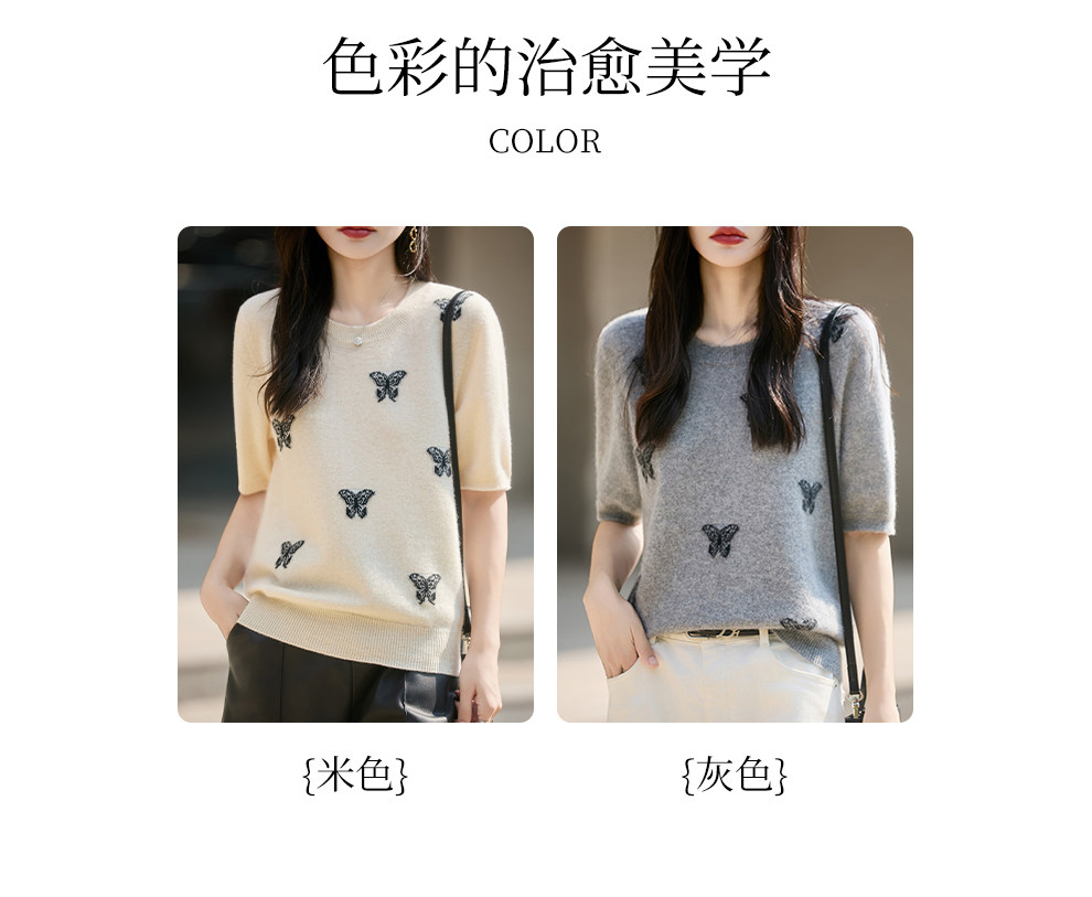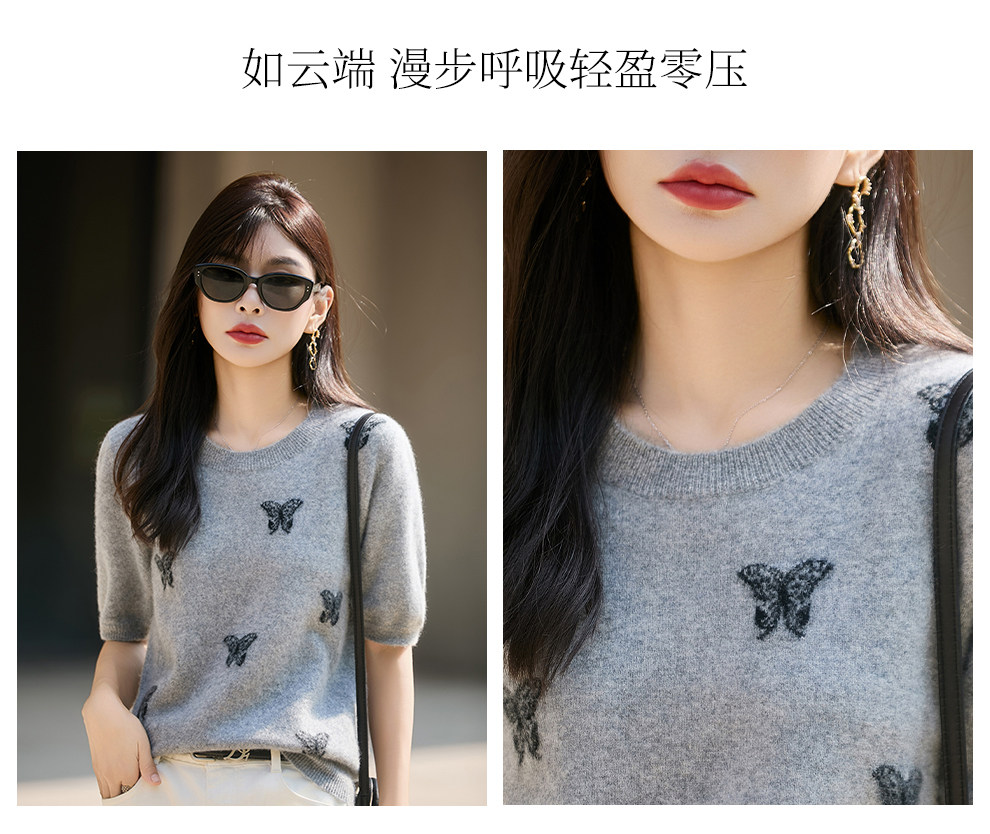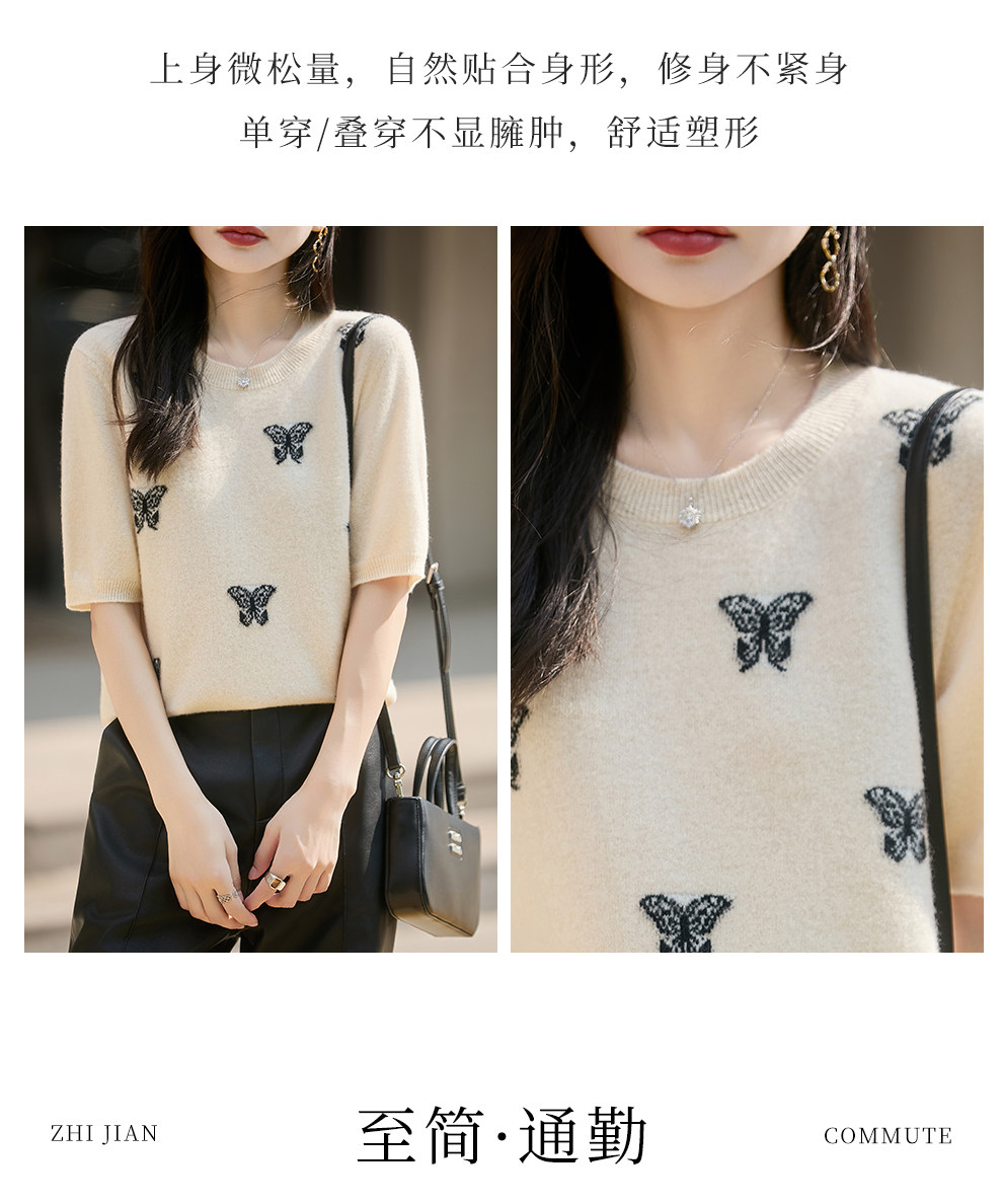 Korean-Style High-End 100% Pure Wool Knit Half-Sleeve Sweater for Women, 2026 New Butterfly Jacquard Five-Quarter Sleeve Base Layer