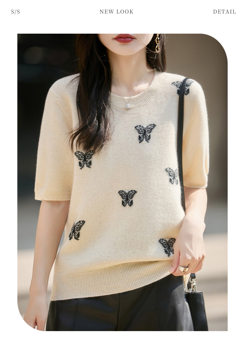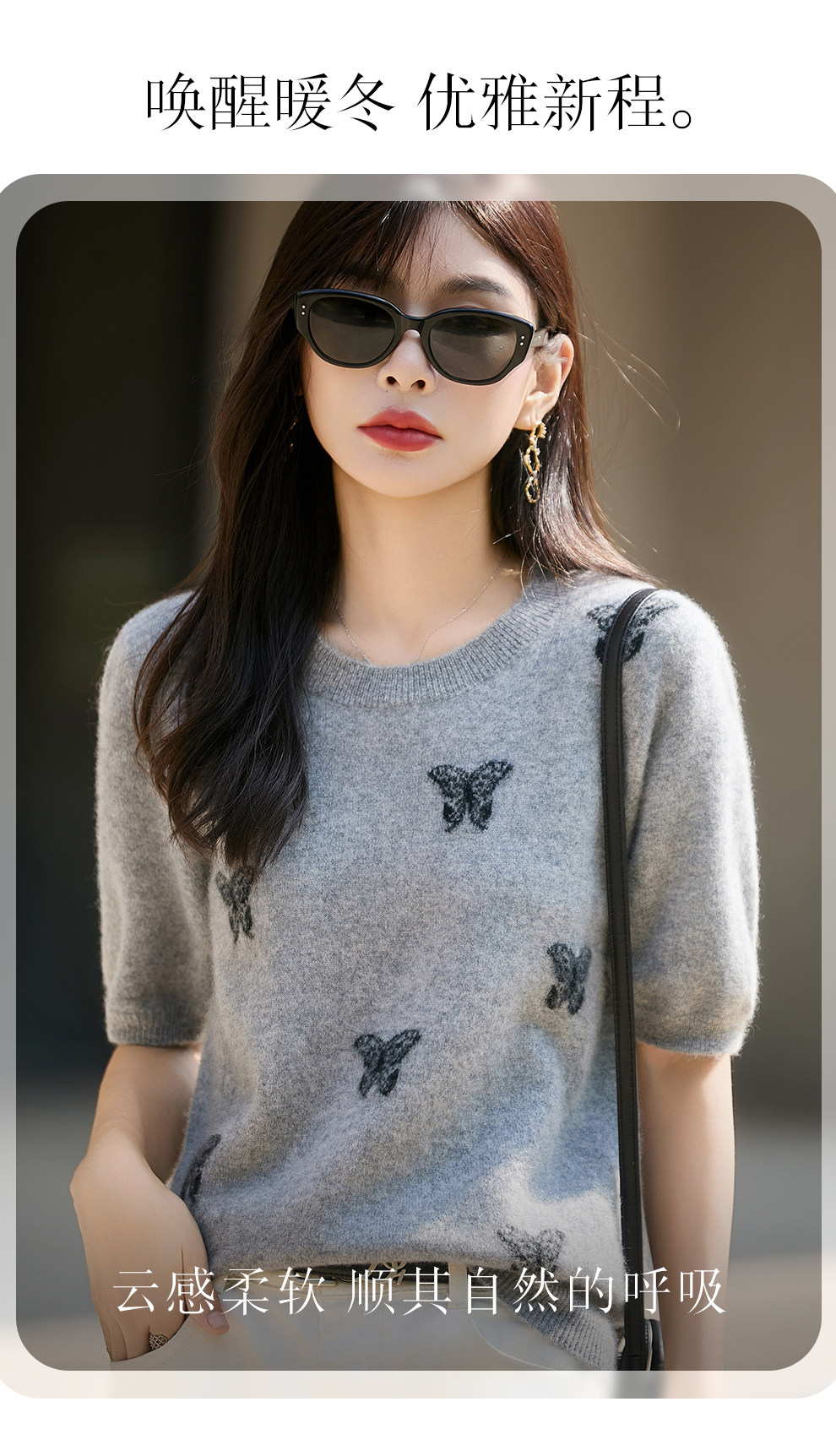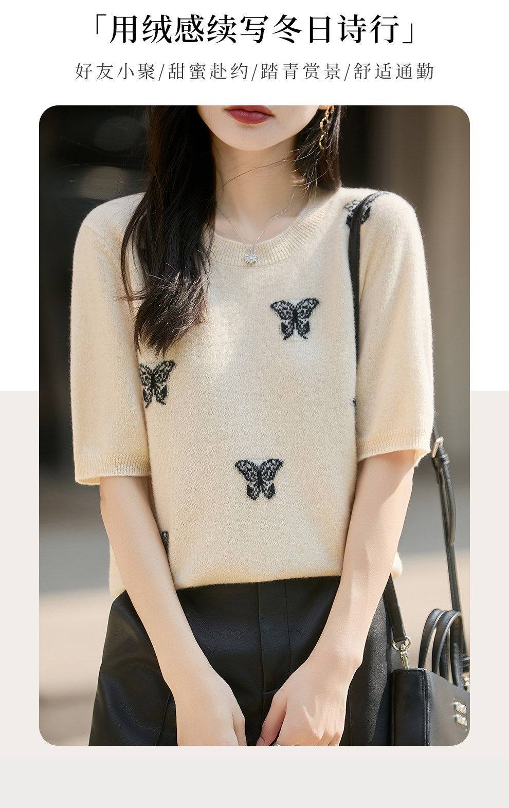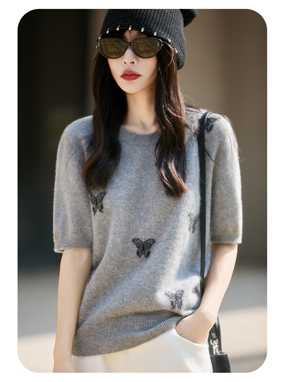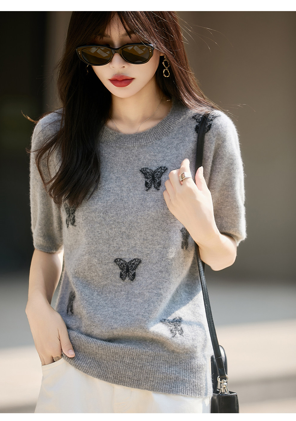 Korean-Style High-End 100% Pure Wool Knit Half-Sleeve Sweater for Women, 2026 New Butterfly Jacquard Five-Quarter Sleeve Base Layer