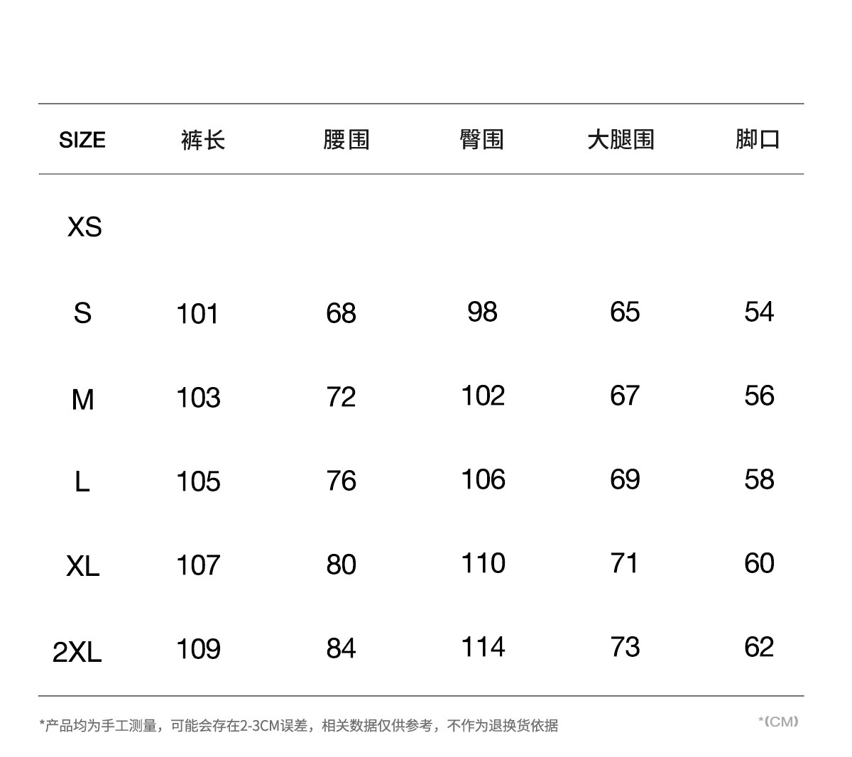 Outseam (cm) 99 cm 101.5 cm 104 cm 106.5 cm 109 cm