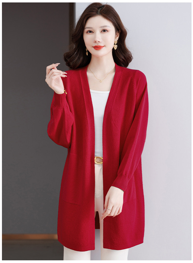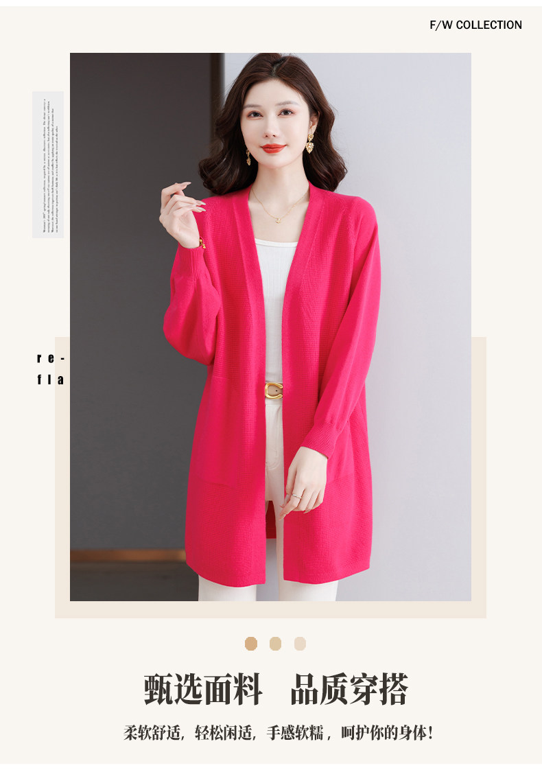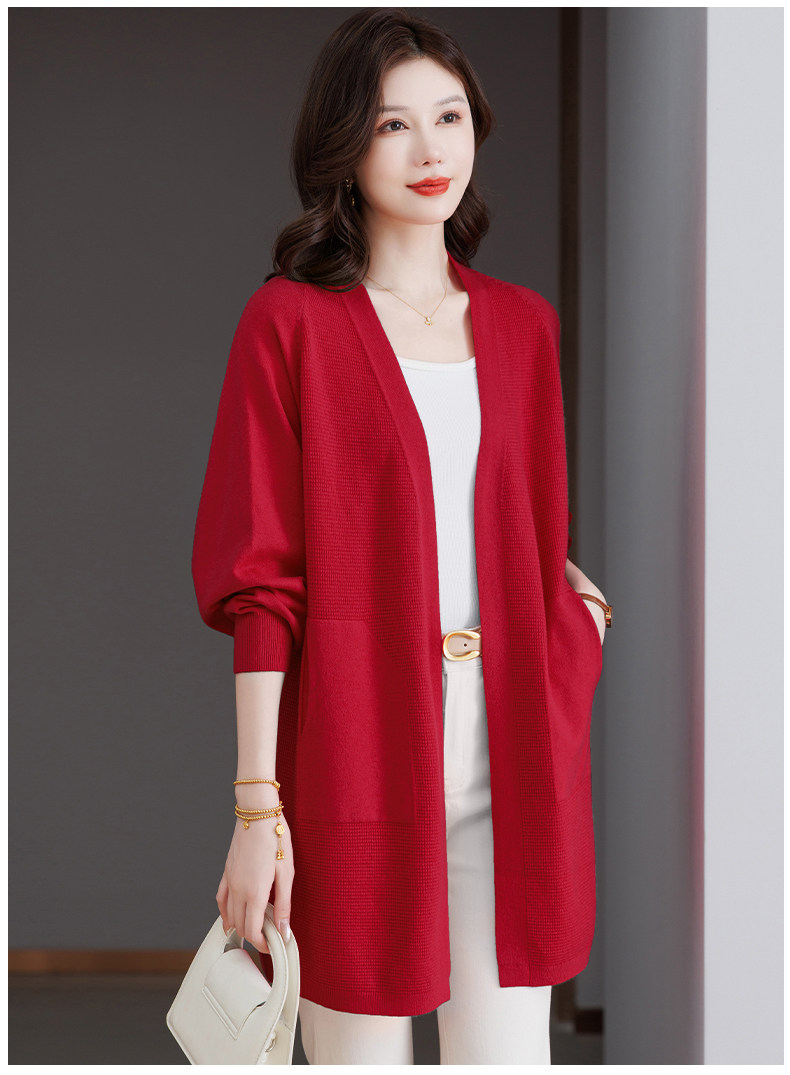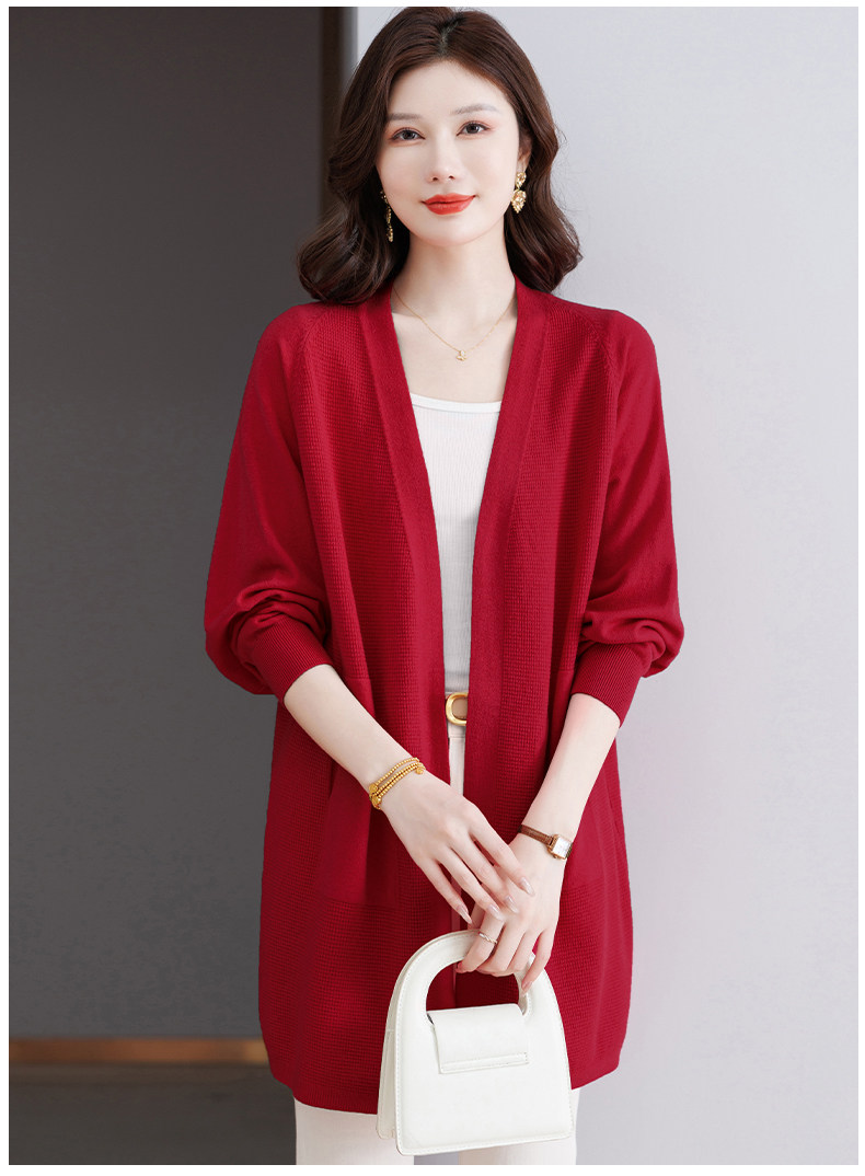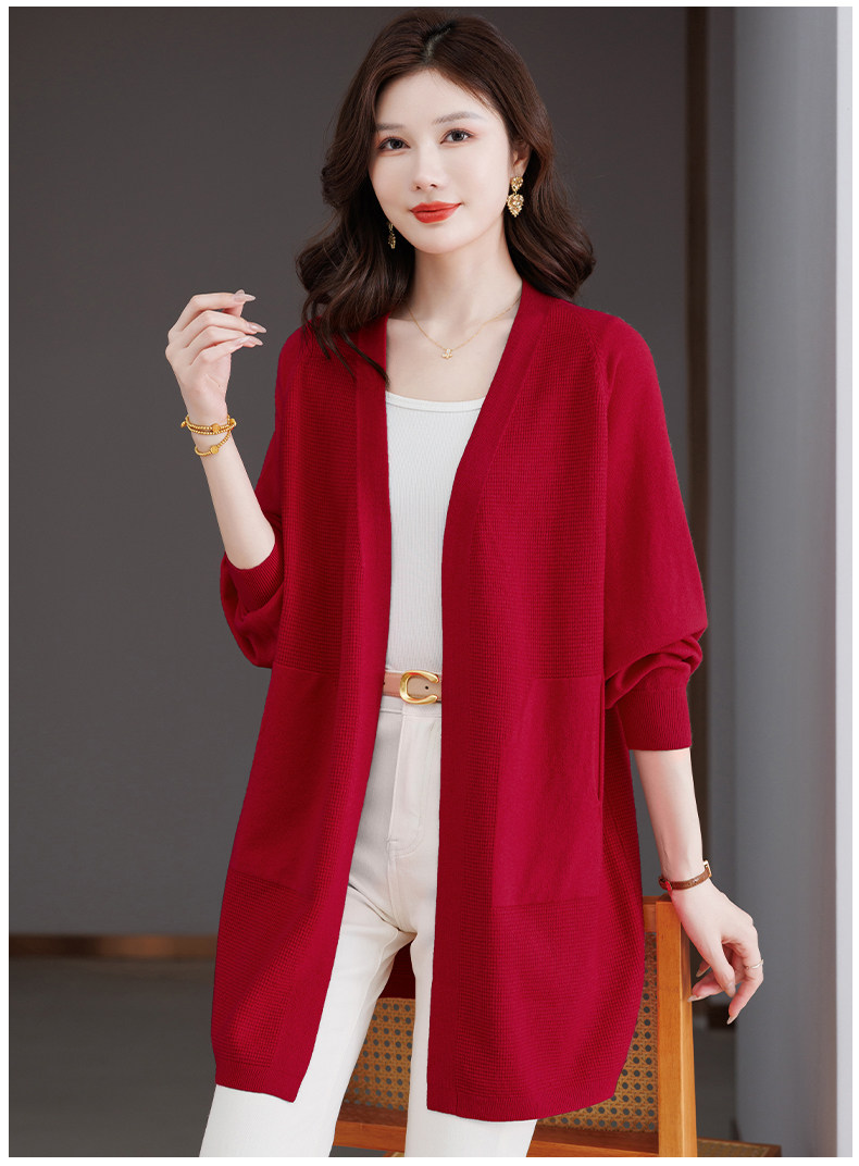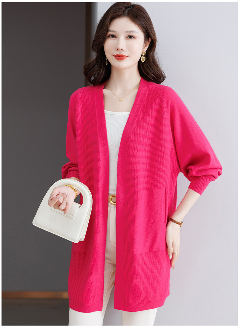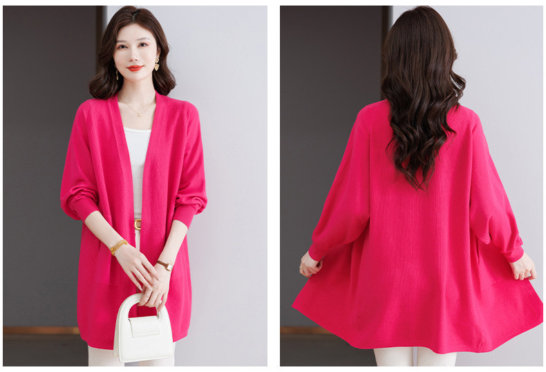 Early Autumn Rose Red Lazy Style Knitted Cardigan Jacket for Women, Mid-Length Loose Thin Sweater, Spring and Autumn Outerwear Shawl