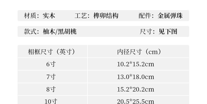 Size Print photos and contact customer service,6 inches 10.2*15.2cm North American FAS level,7 inches 12.8*17.8cm wood wax oil coating,8 inches 15*20cm hand polished,10 inches 20.3*25.3cm Ten years warranty,A4 20.8*29.5cm Guaranteed replacement if cracked,3 inches 5.5*8.5cm,4 inches 7.5*10cm,5 inches 8.9*12.7cm