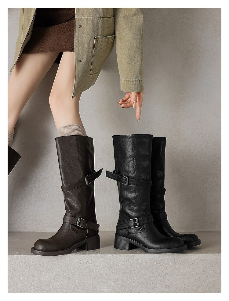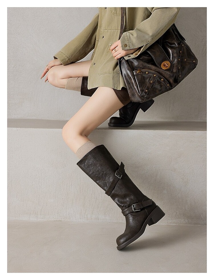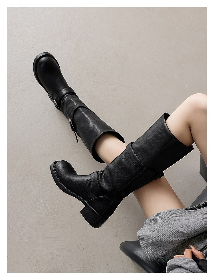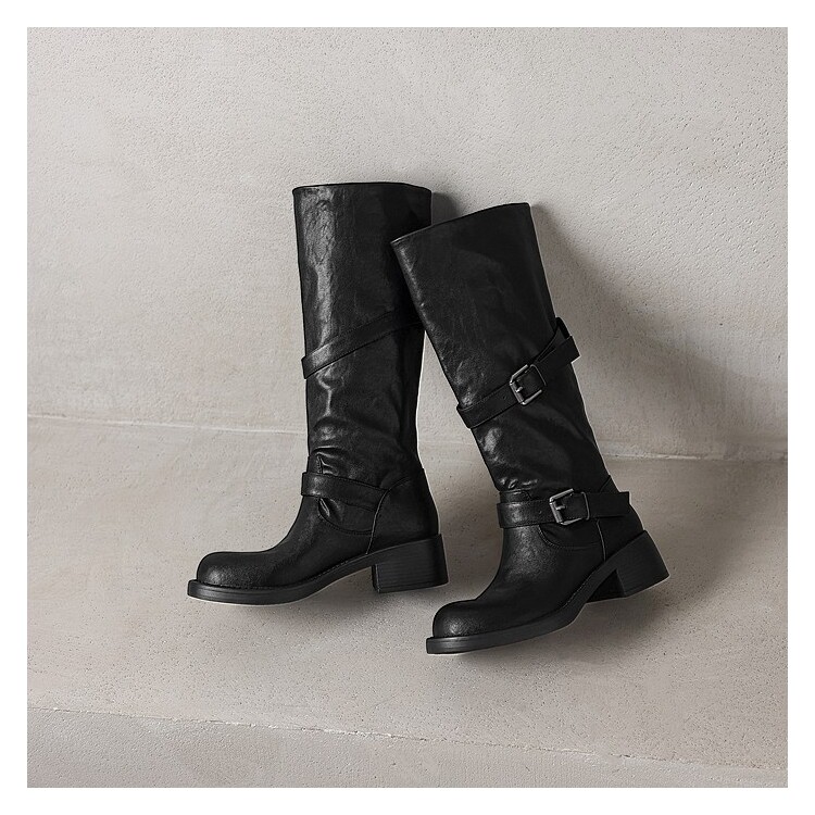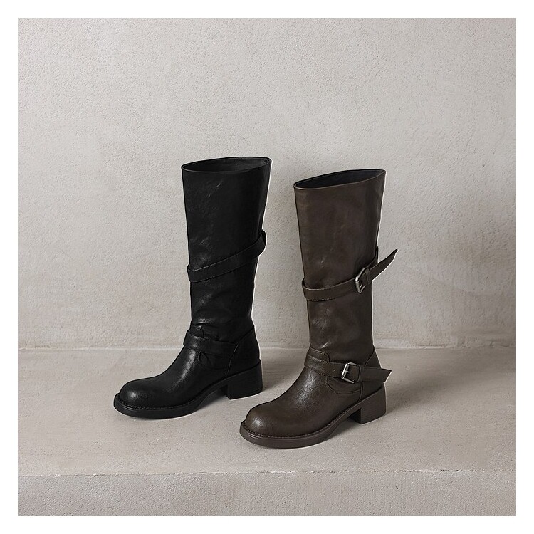 Italy Corso Venezia~ Genuine Leather Buckle Knight Boots for Women, Mid-Heel Knee-High Boots