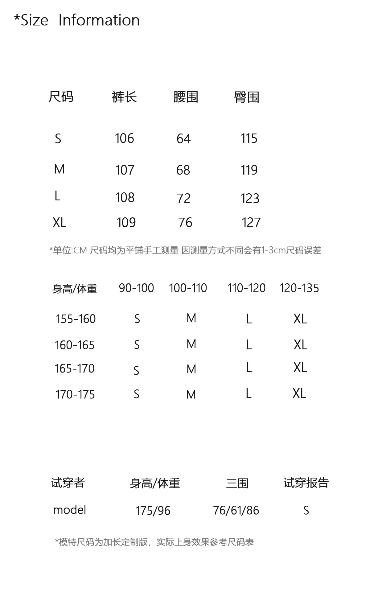 China (cm) 160-165/84-86 165-170 / 88-90 167-172 / 92-96 168-173 / 98-102 170-176 / 106-110