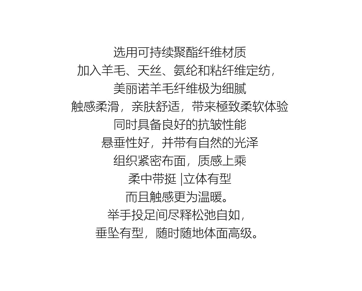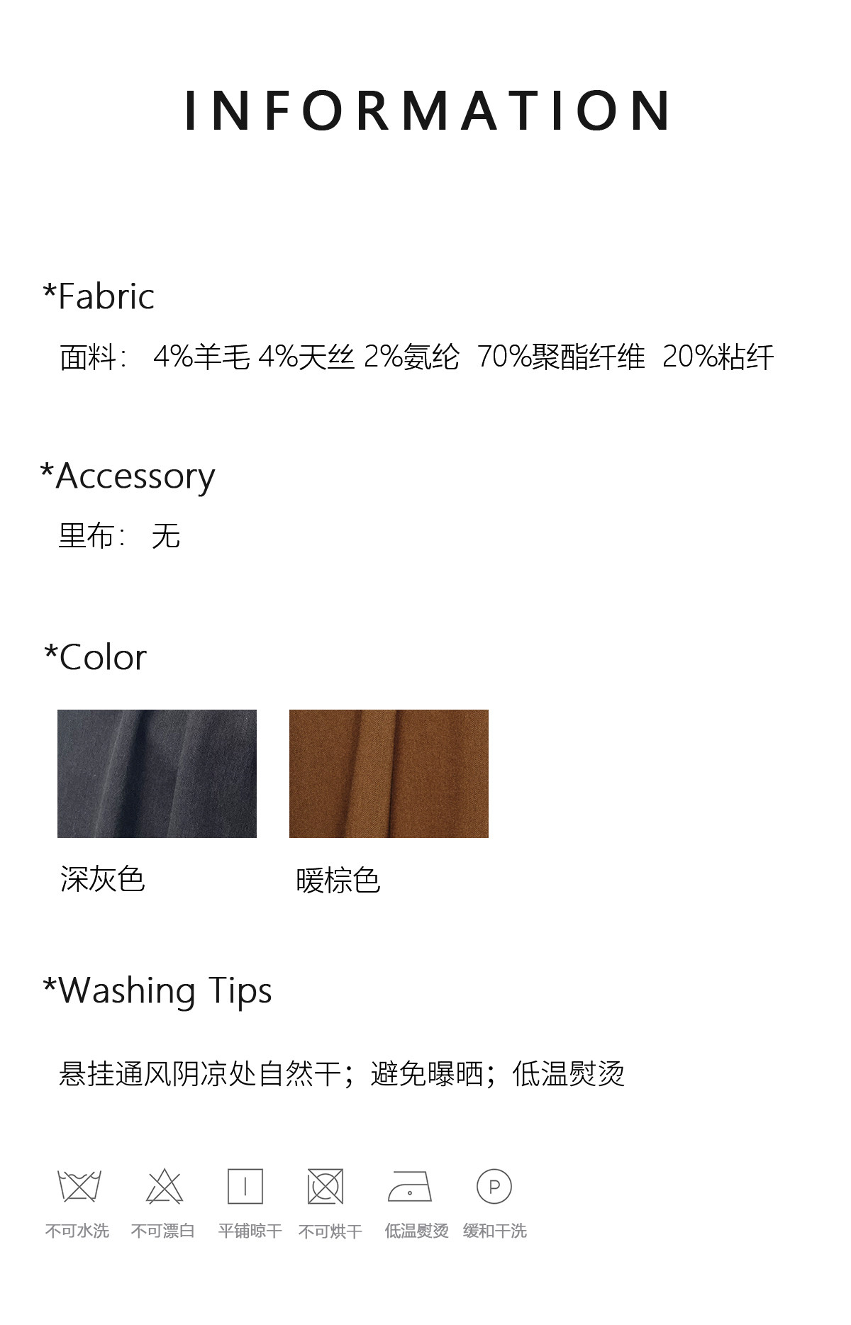 Material ingredients New polyester fiber 70% viscose fiber (viscose fiber) 20% wool 4% lyocell fiber (lyocell) 4% polyurethane elastic fiber (spandex) 2%