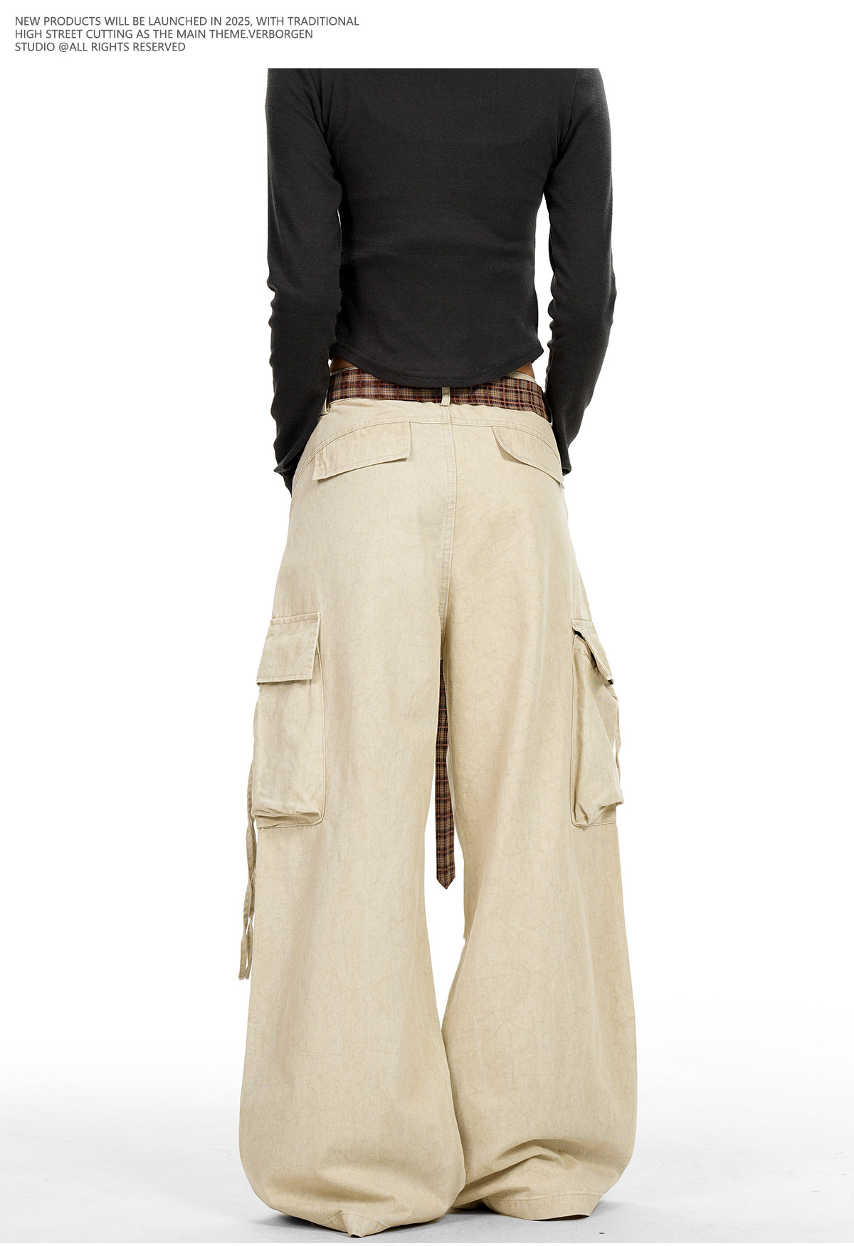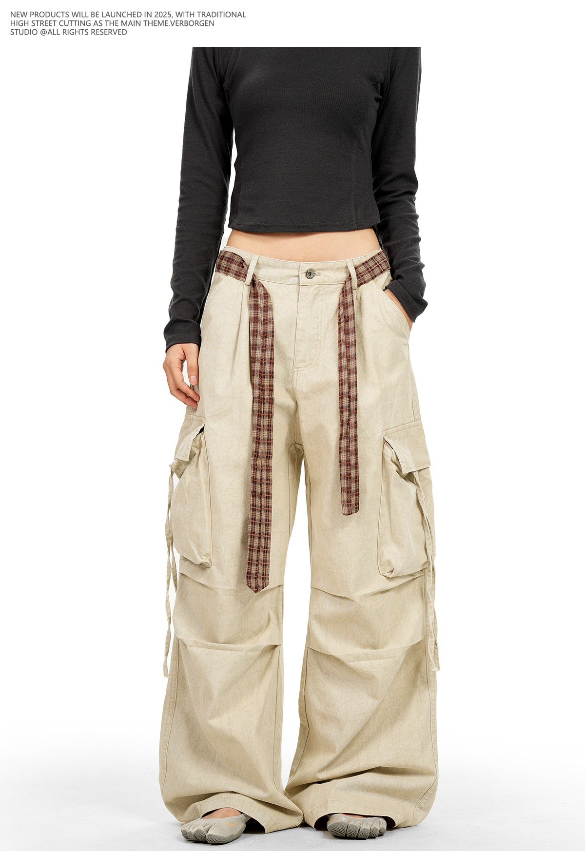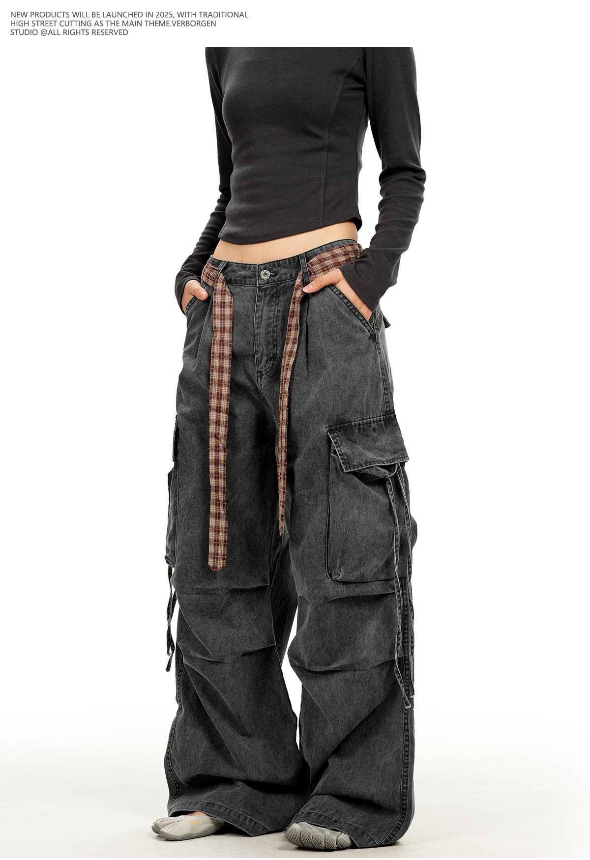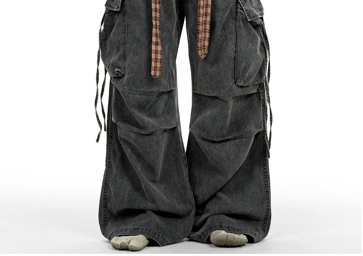 Verborgen American Retro Multi-Pocket Pleated Cargo Pants for Men and Women with Plaid Belt, Loose Straight Wide-Leg Pants