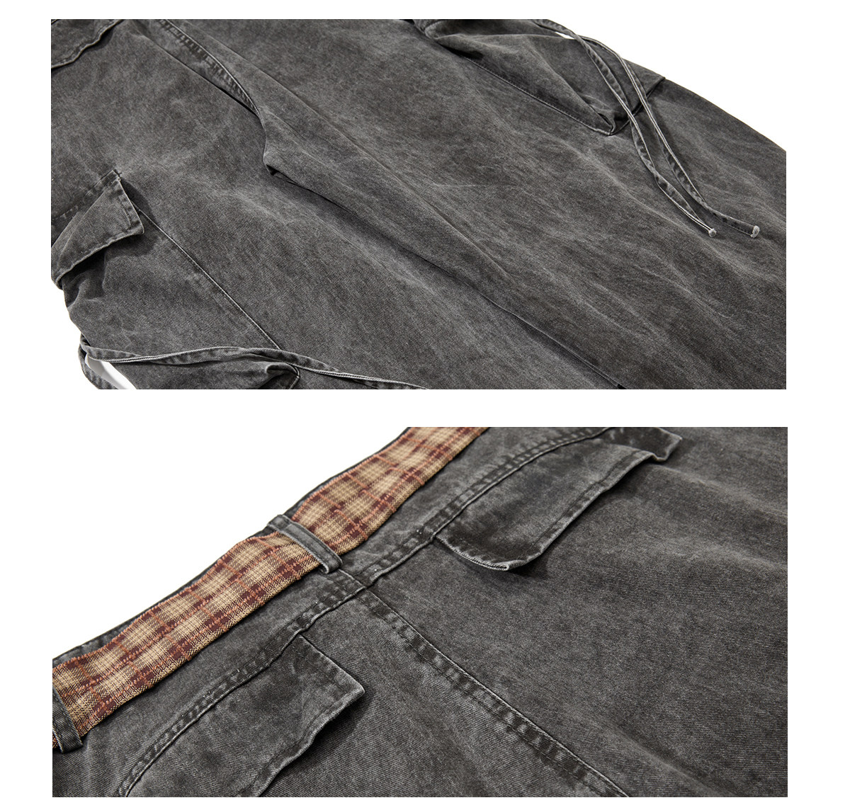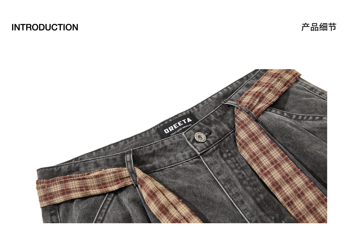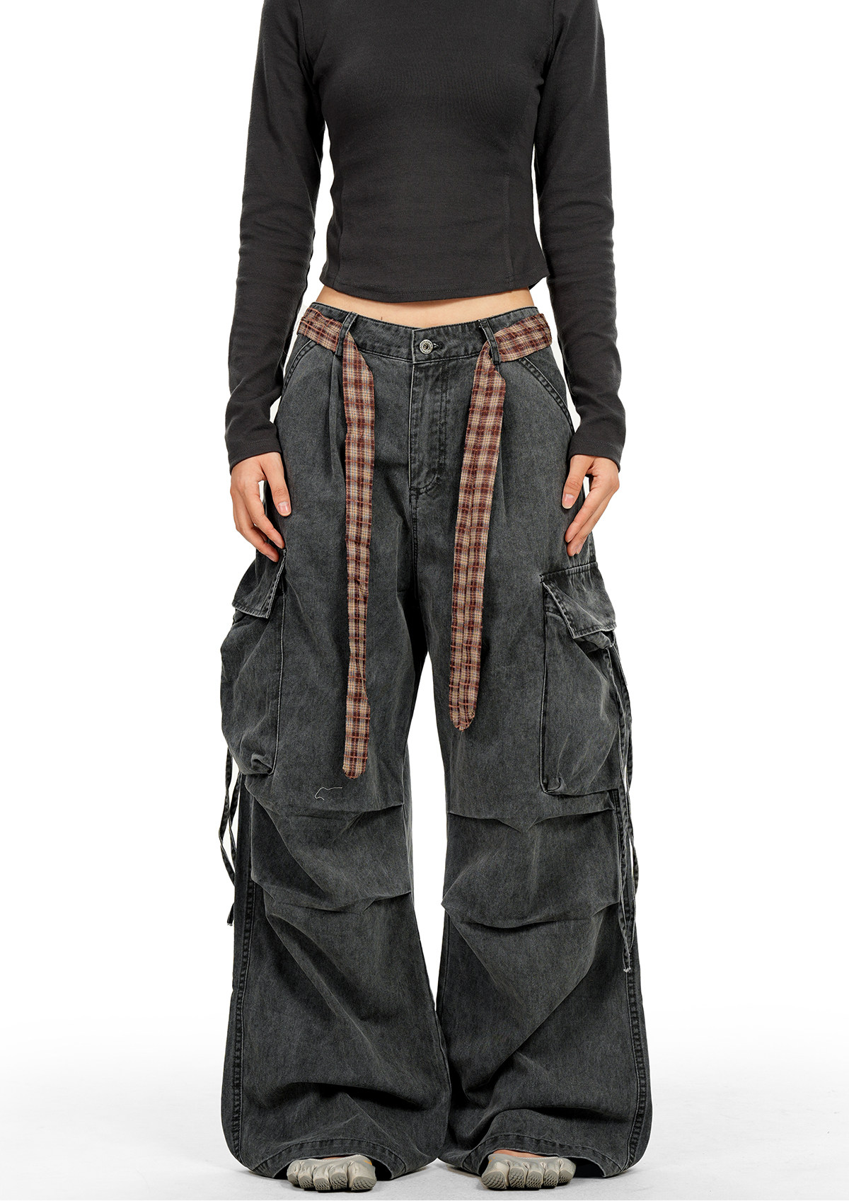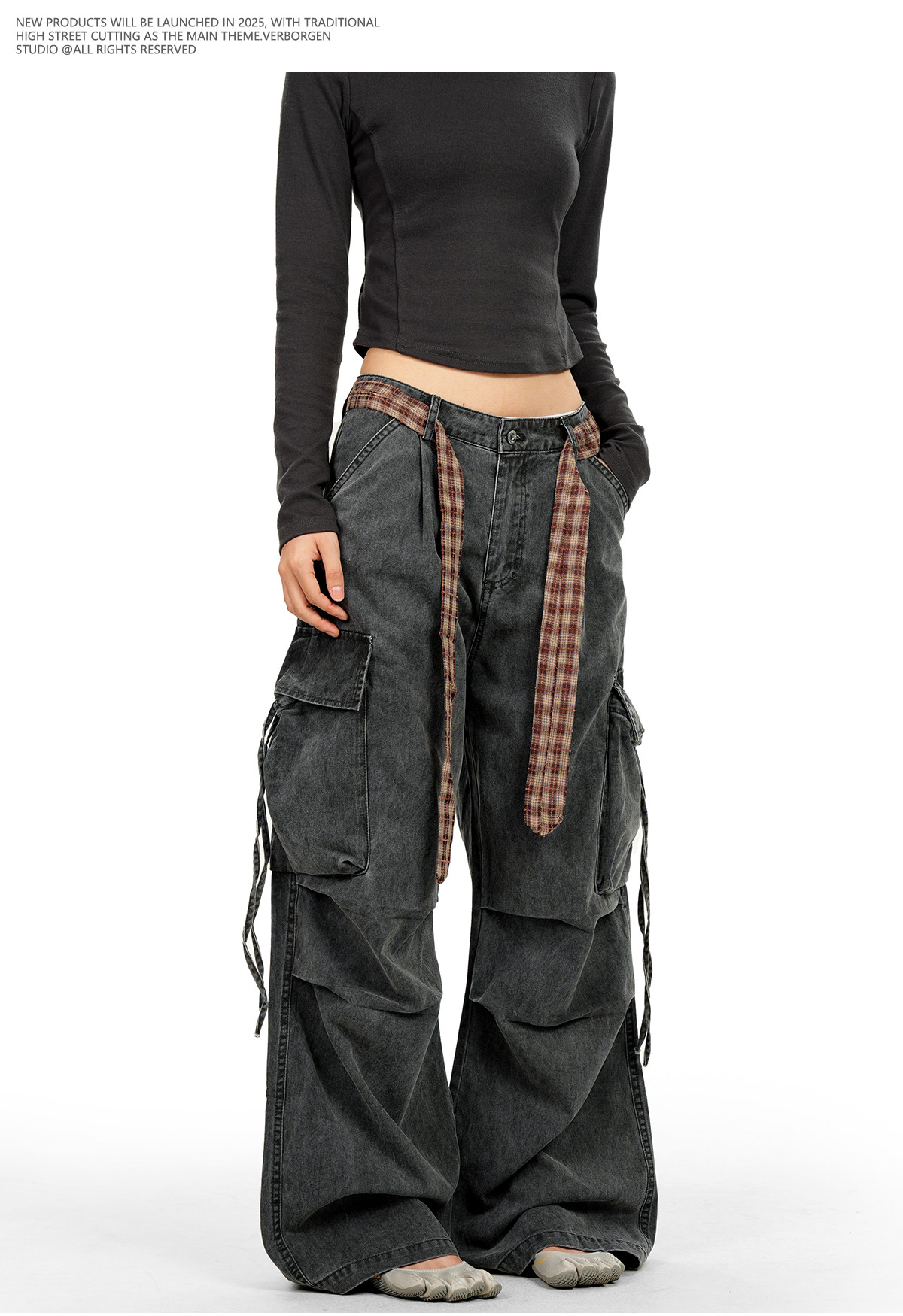 Verborgen American Retro Multi-Pocket Pleated Cargo Pants for Men and Women with Plaid Belt, Loose Straight Wide-Leg Pants