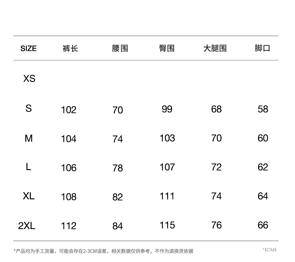 Outseam (cm) 99 cm 101.5 cm 104 cm 106.5 cm 109 cm