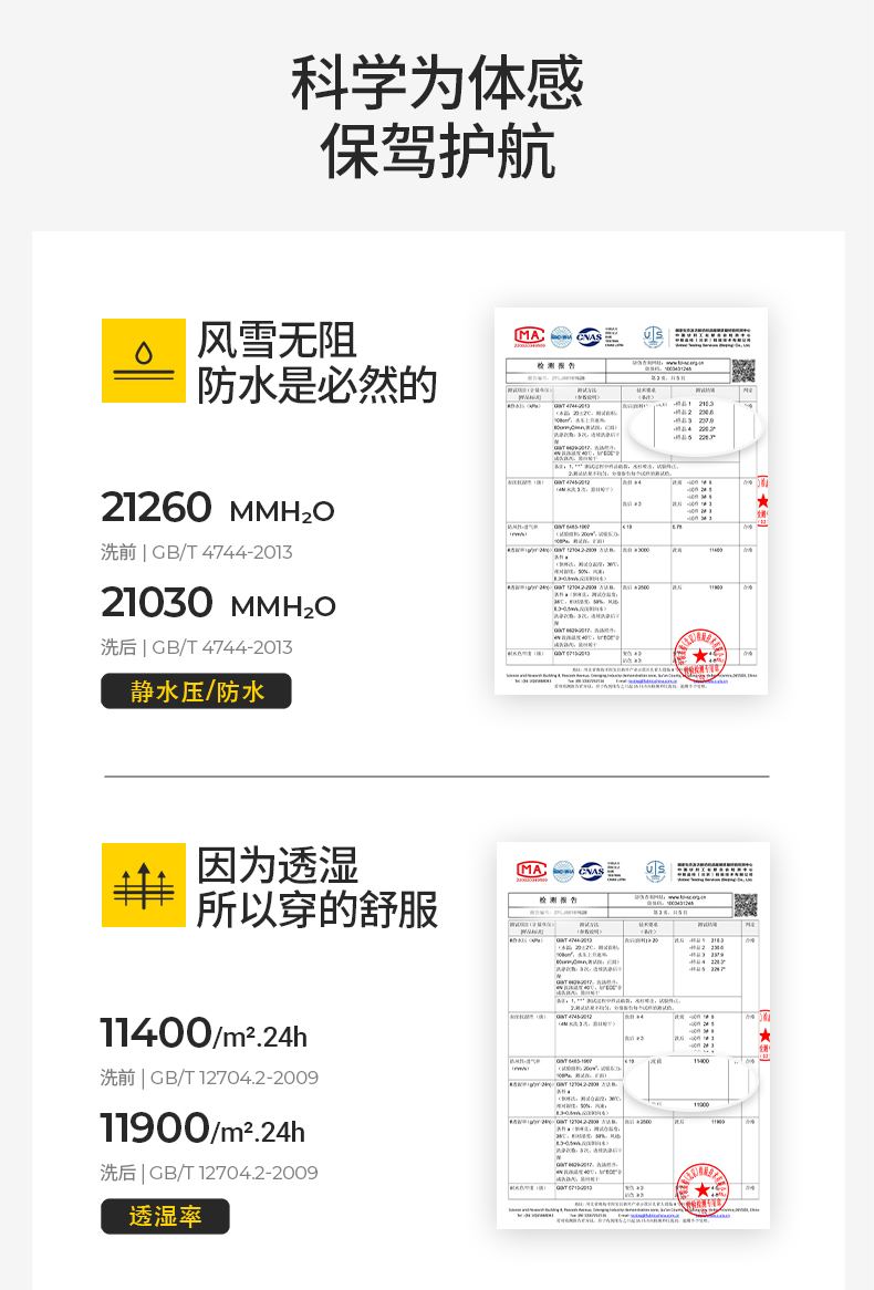 Waterproof Hydrostatic Pressure> 20000Mmh₂O,Surface Moisture Resistance: ≥4-5 Levels before Washing, ≥3-4 Levels after Washing