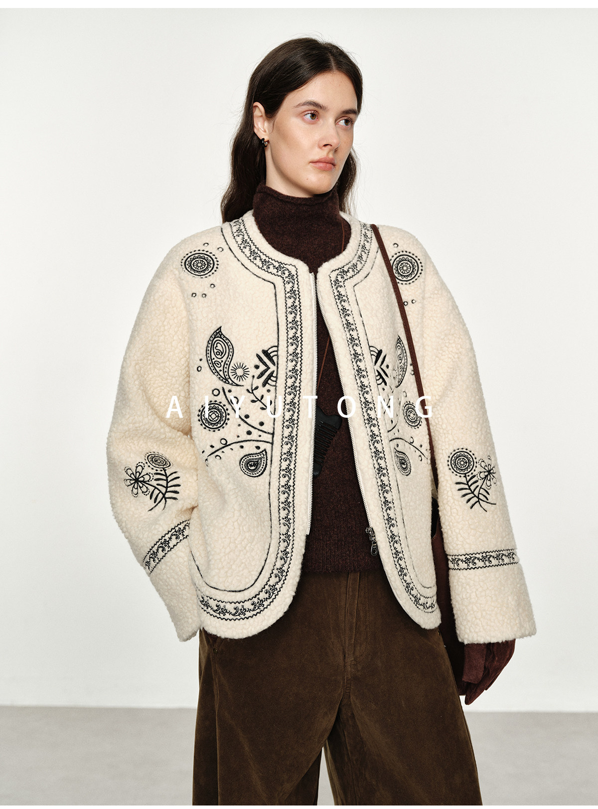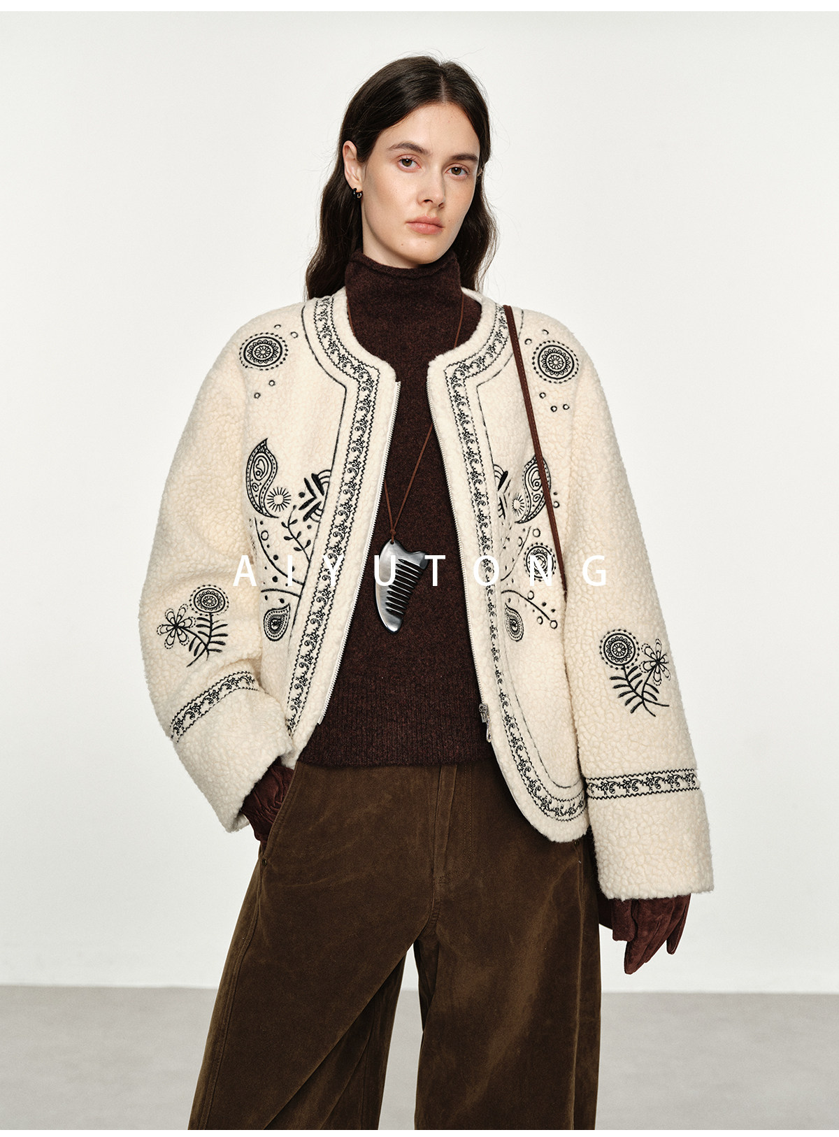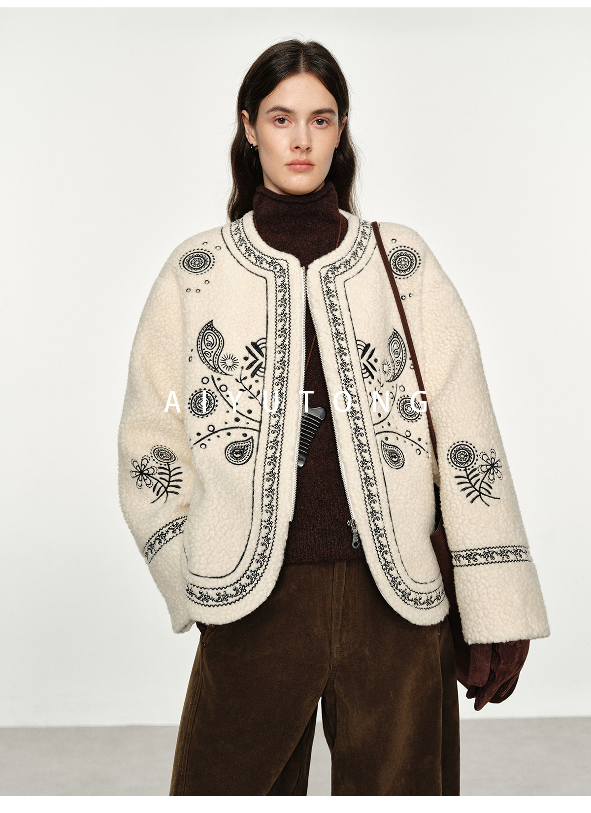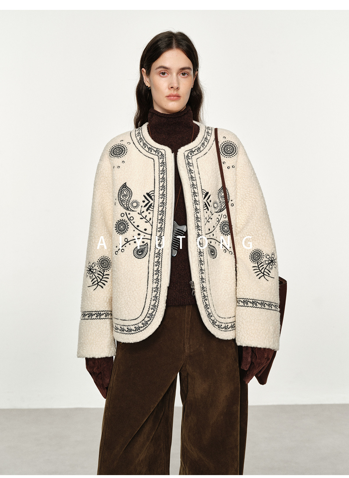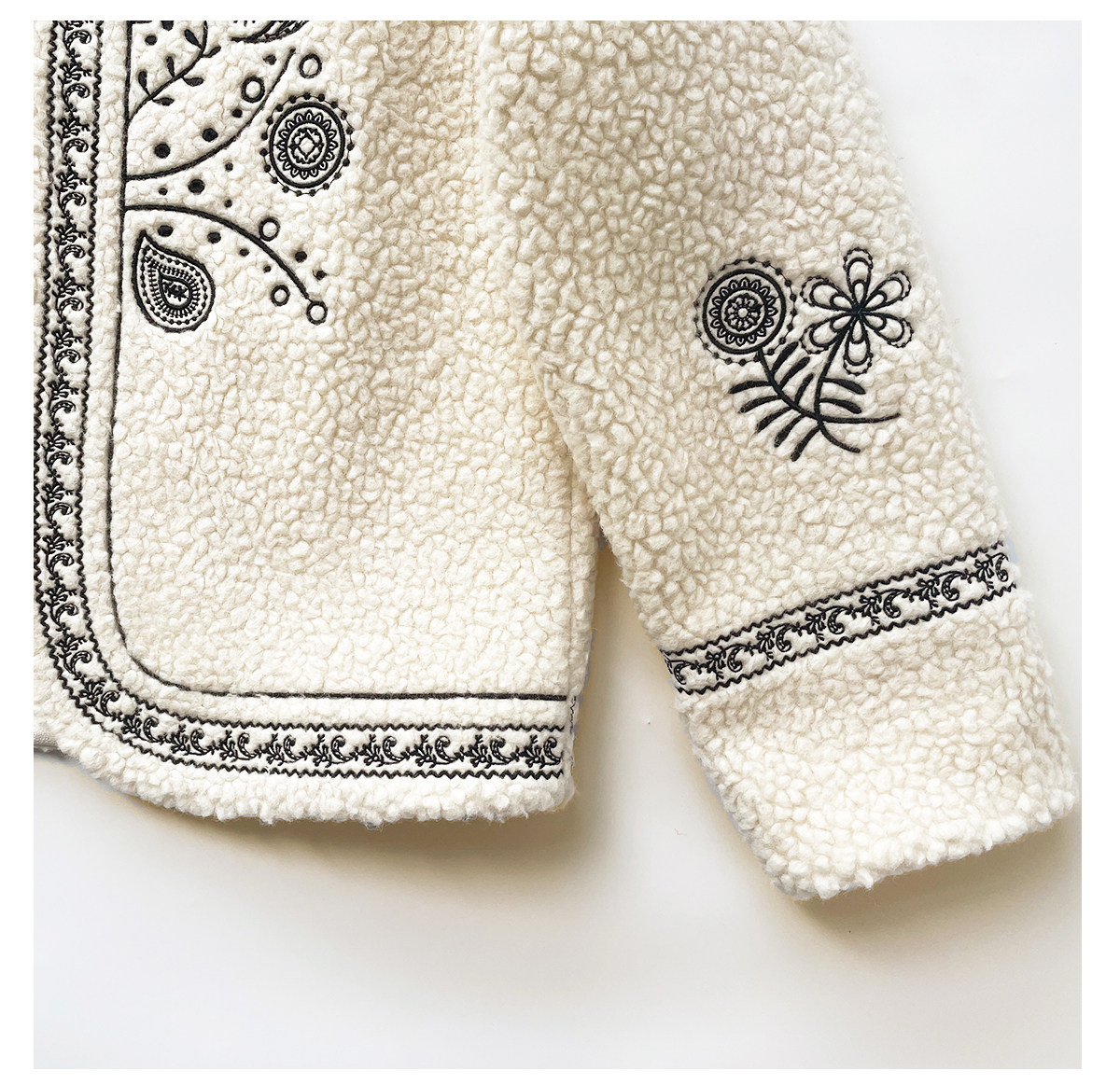 Trendy relaxed nomadic style fashionable simple silhouette heavy embroidered wool blended sherpa warm jacket for women winter