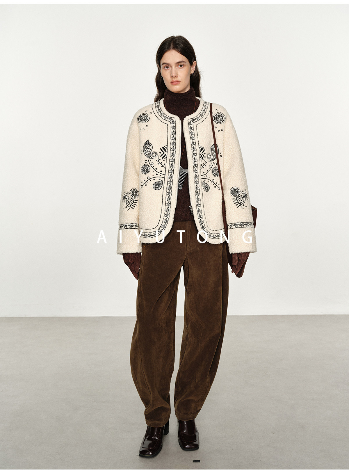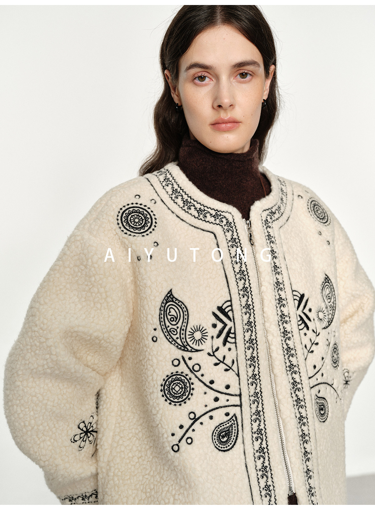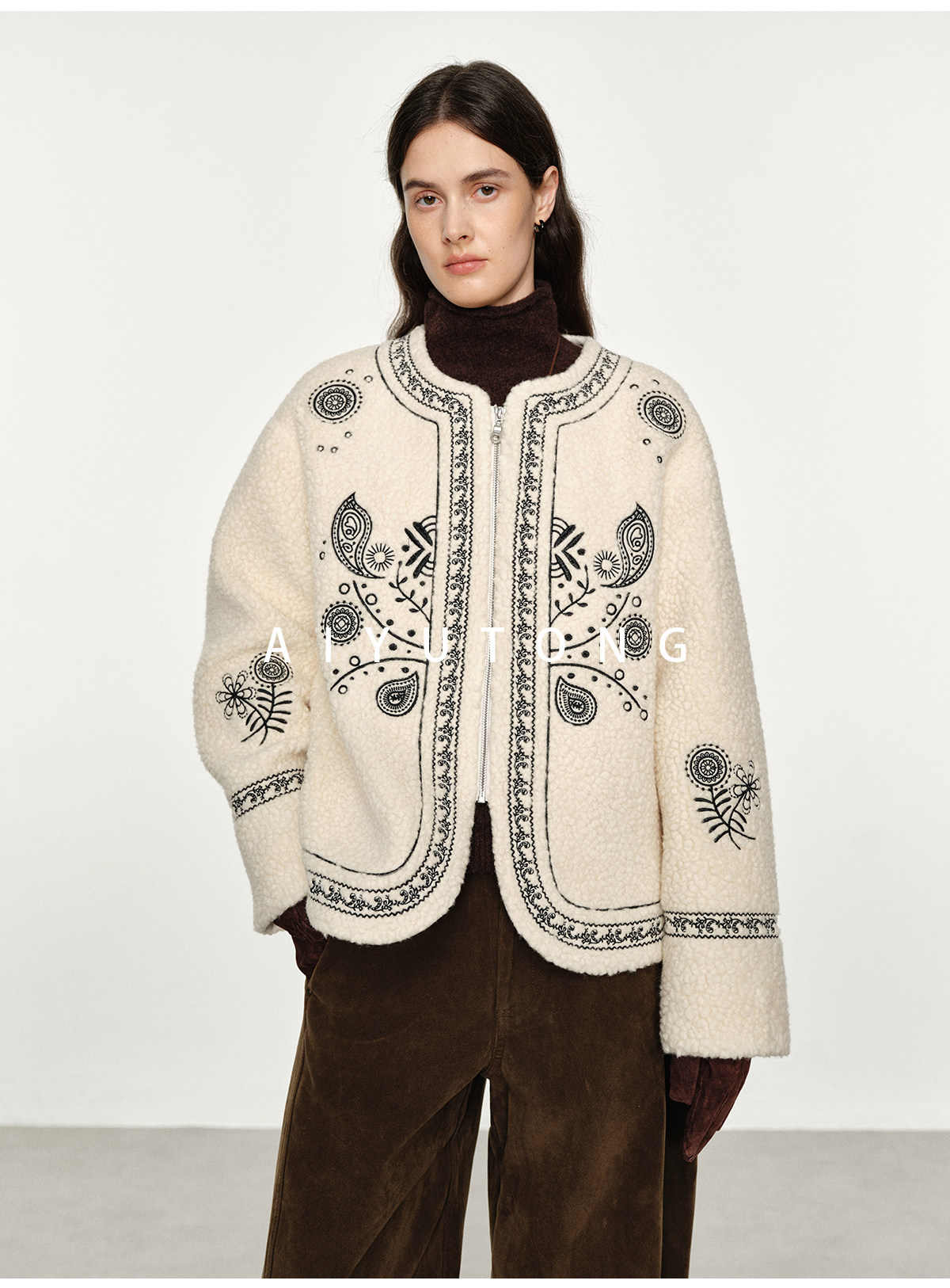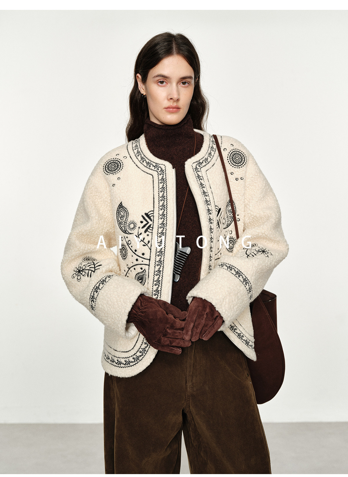 Trendy relaxed nomadic style fashionable simple silhouette heavy embroidered wool blended sherpa warm jacket for women winter