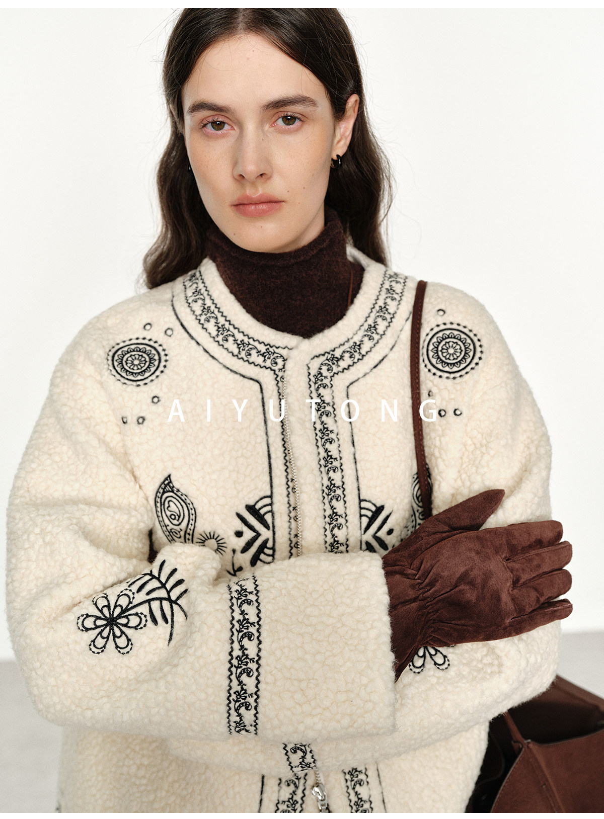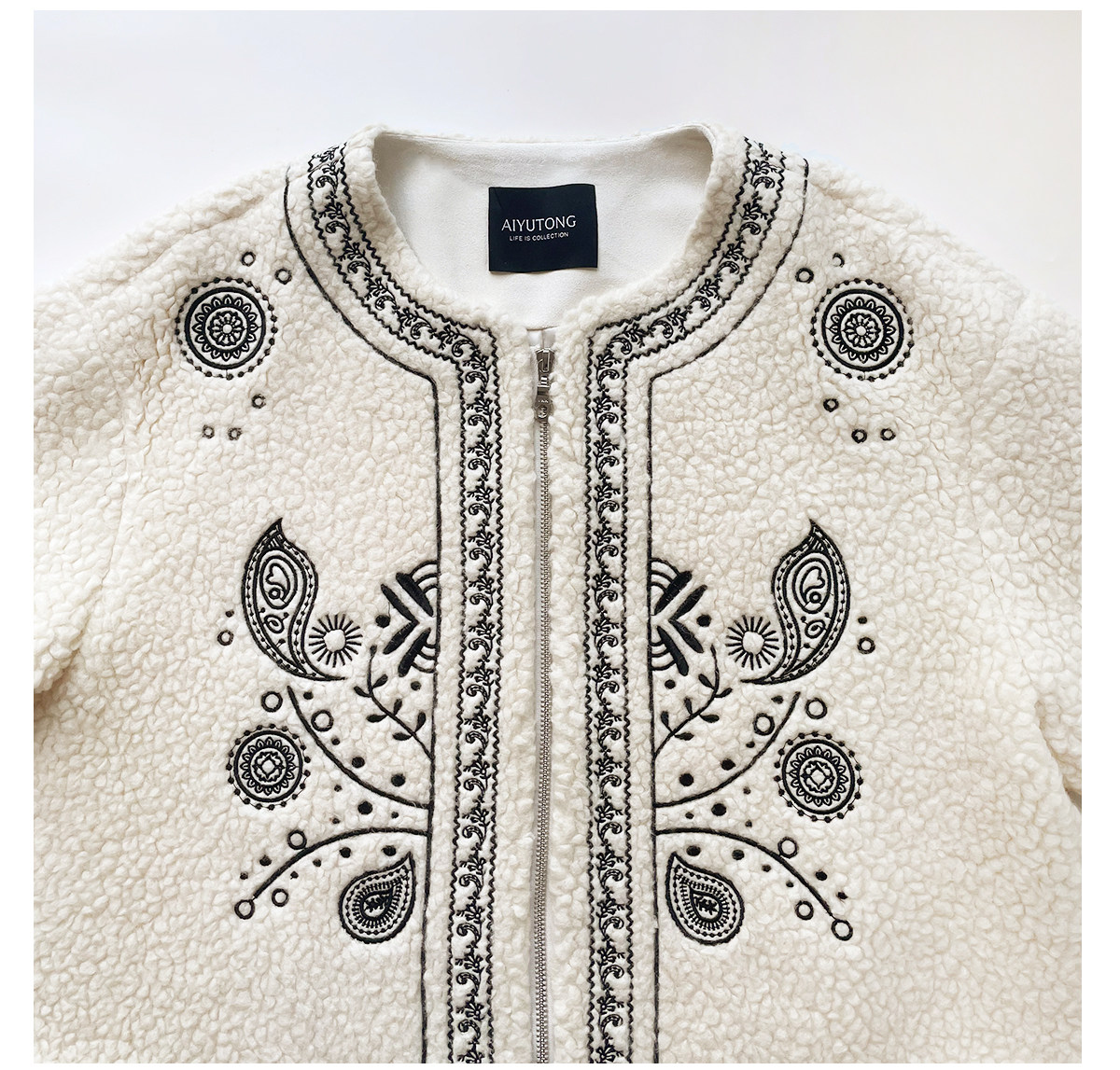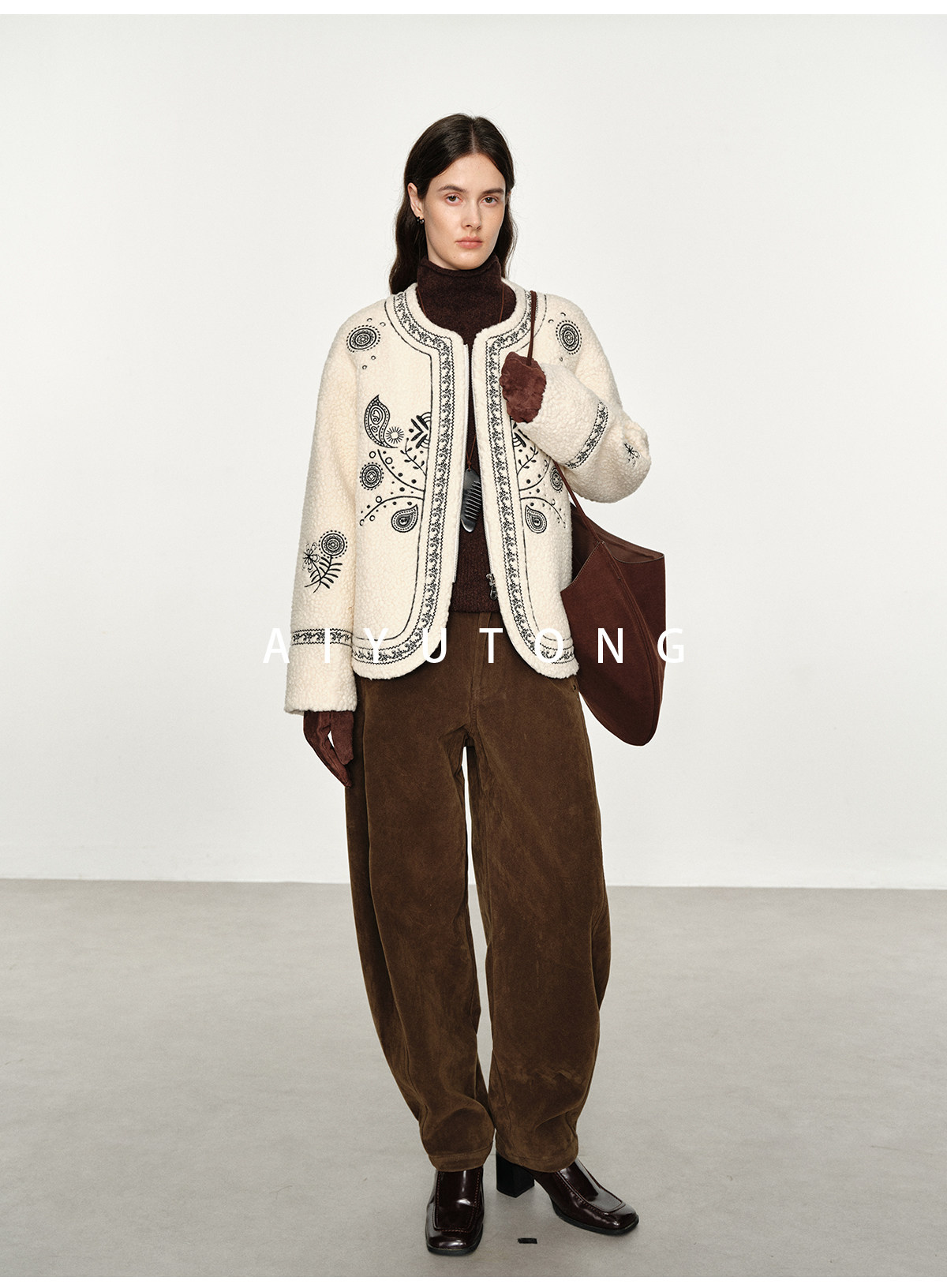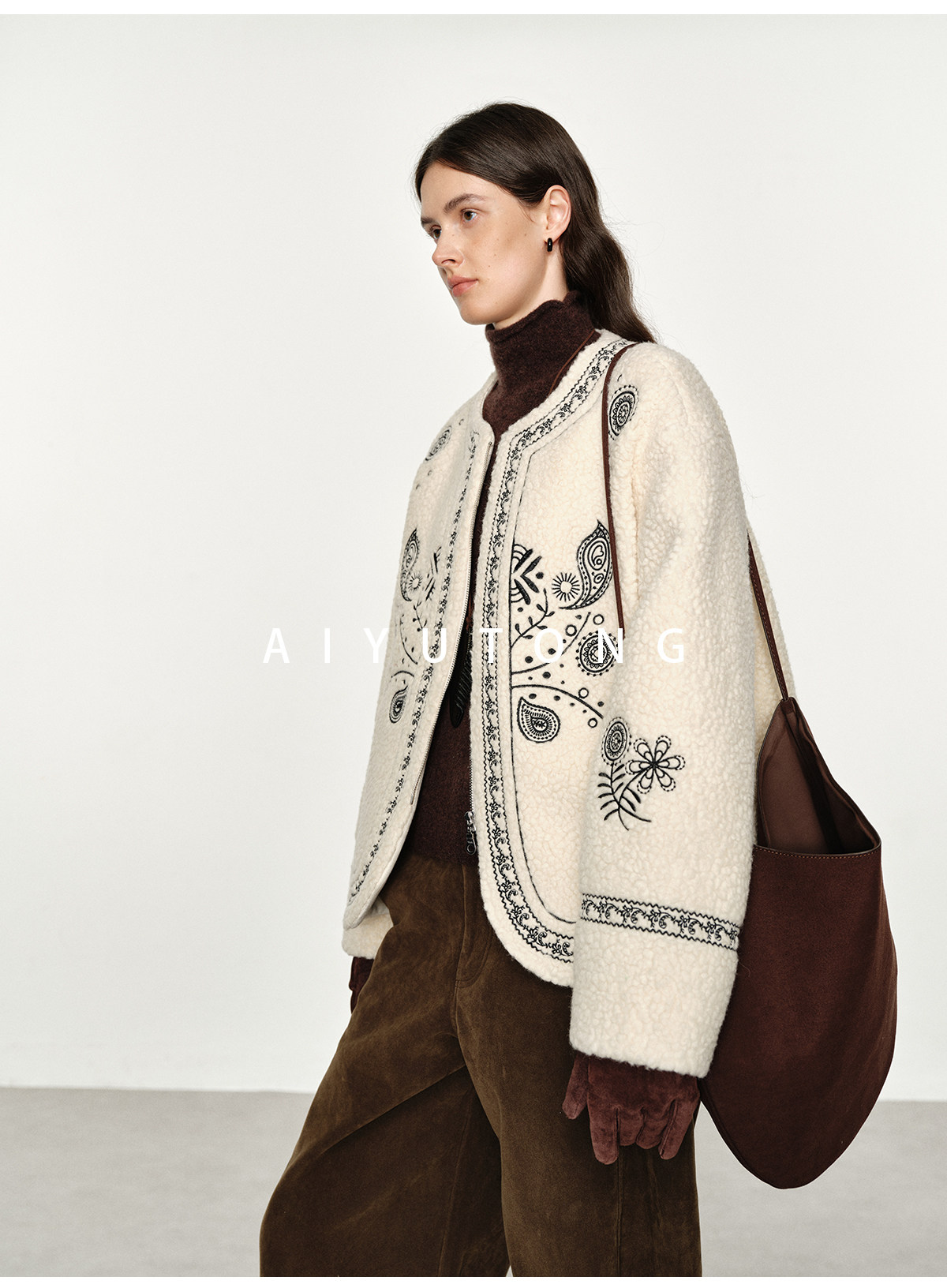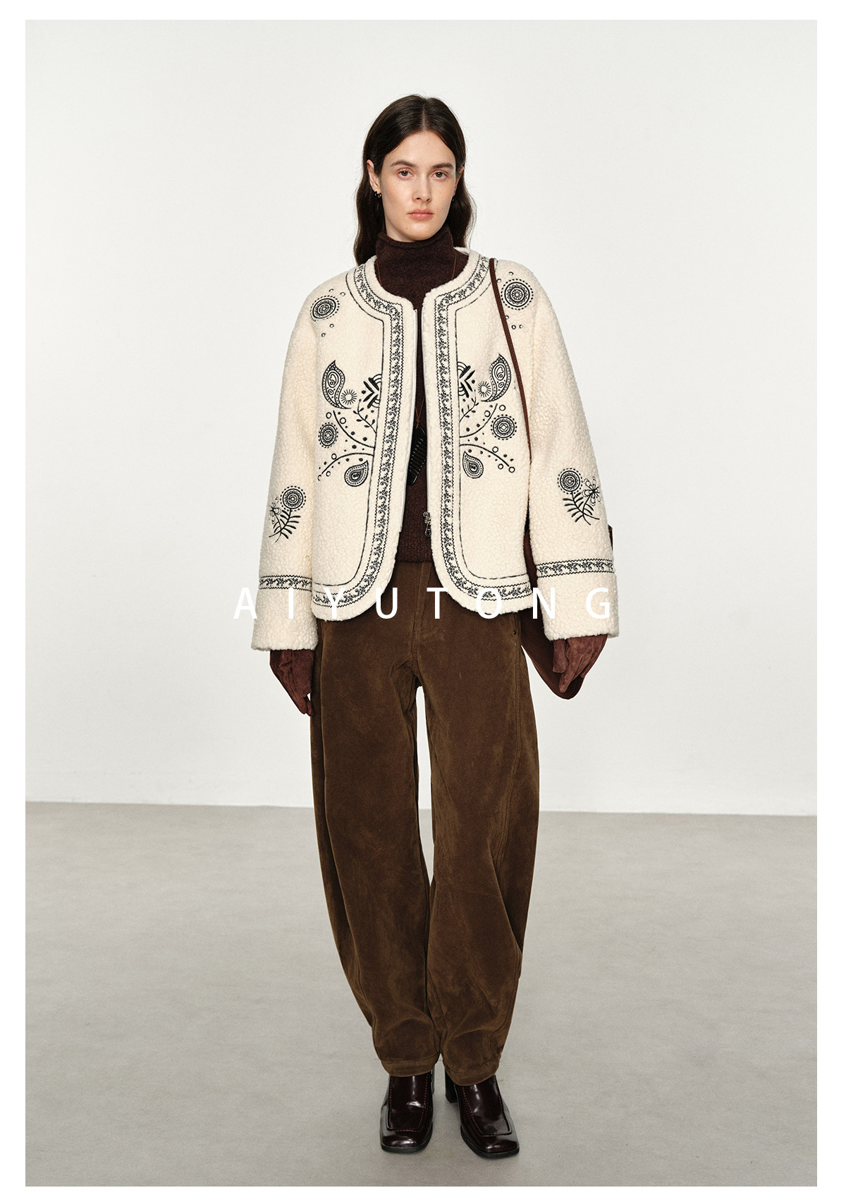 Trendy relaxed nomadic style fashionable simple silhouette heavy embroidered wool blended sherpa warm jacket for women winter