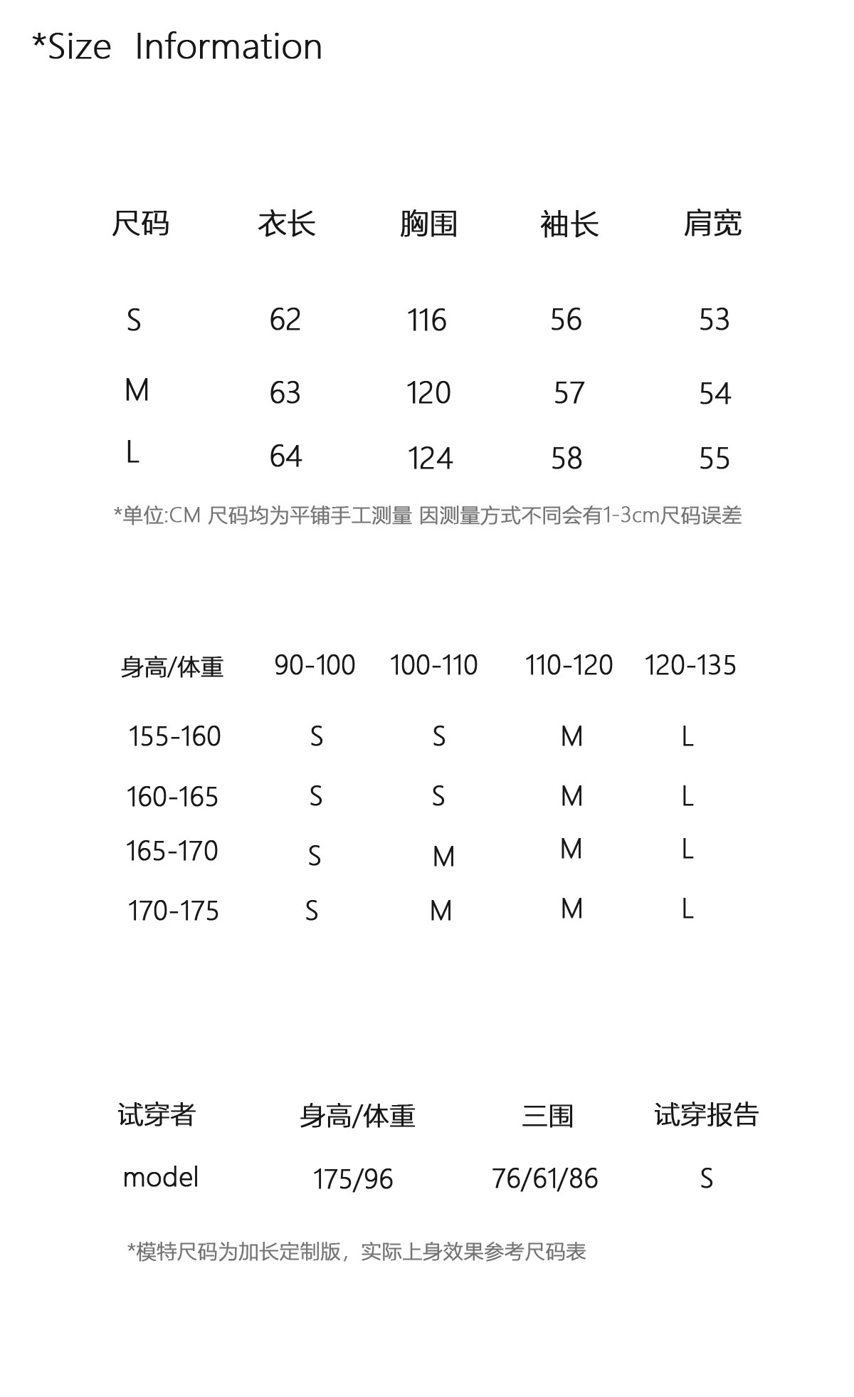 China (cm) 160-165/84-86 165-170 / 88-90 167-172 / 92-96 168-173 / 98-102 170-176 / 106-110