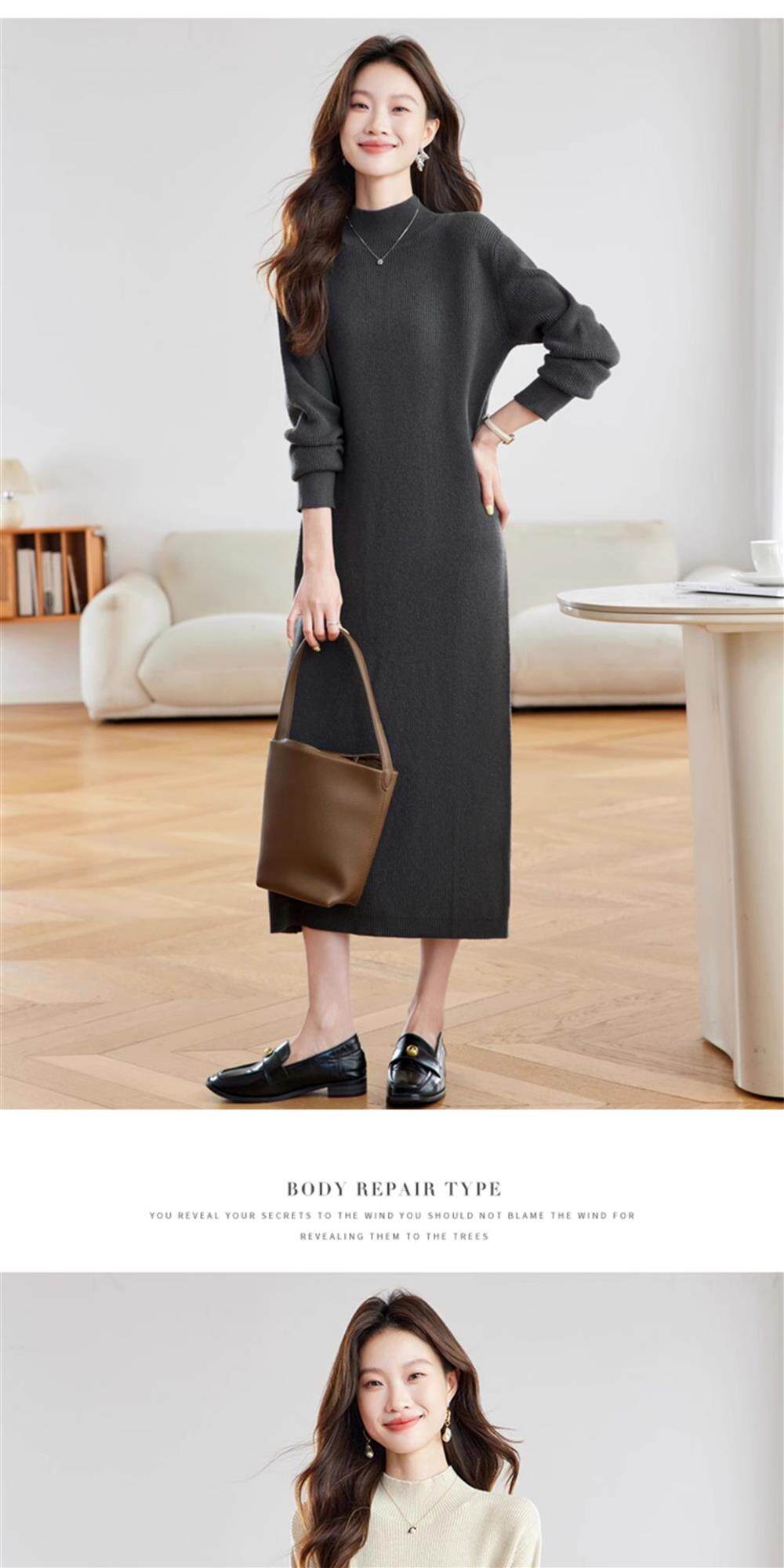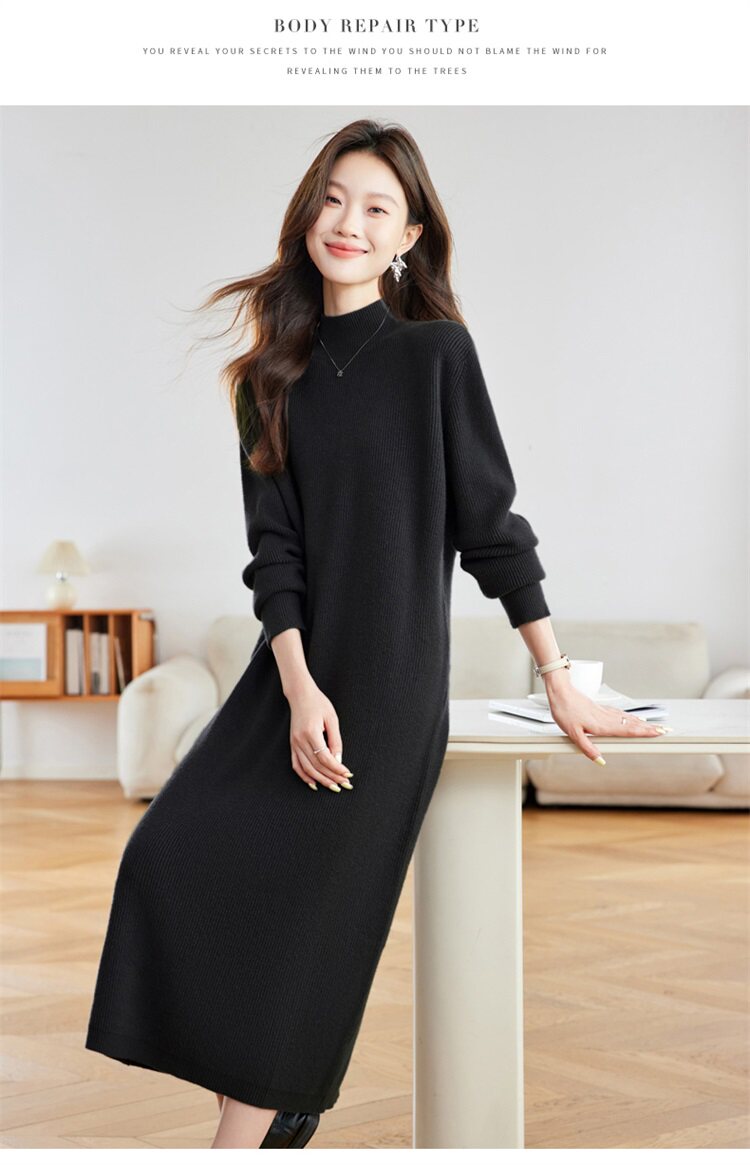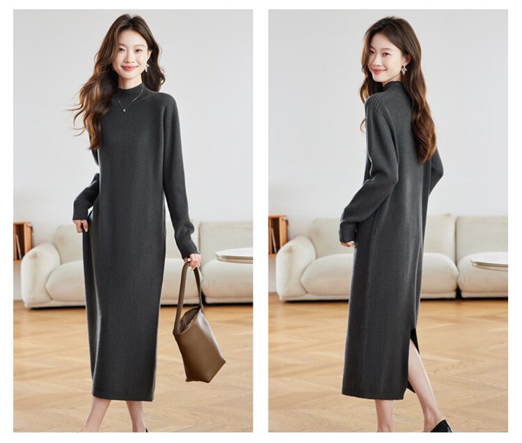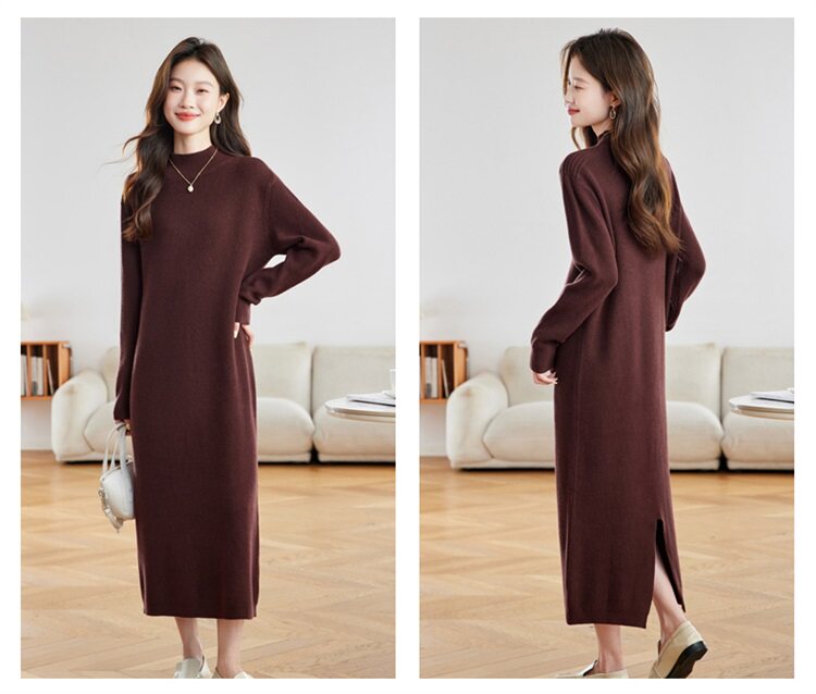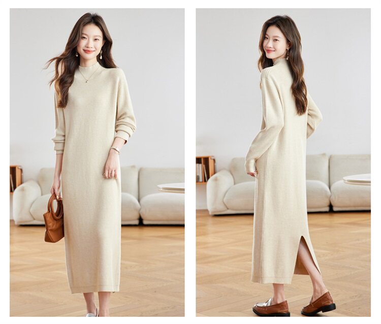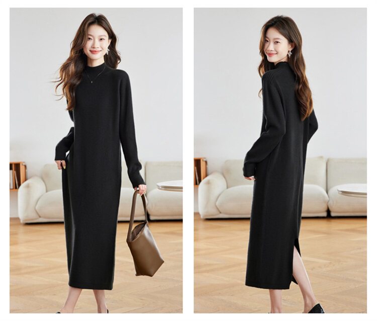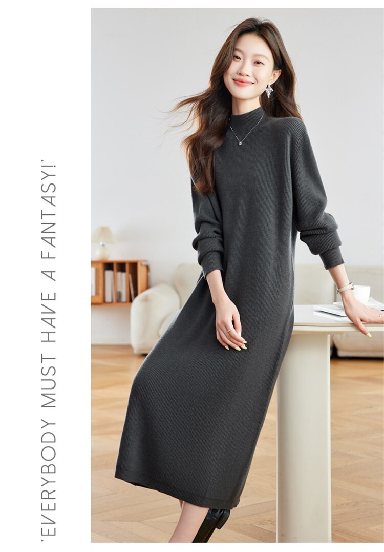 100% Pure Wool Sweater, Half-Turtleneck Sweater for Women, Autumn and Winter Extra-Long Over-The-Knee Sweater Dress, Loose Plus-Size Women's Clothing, Ribbed