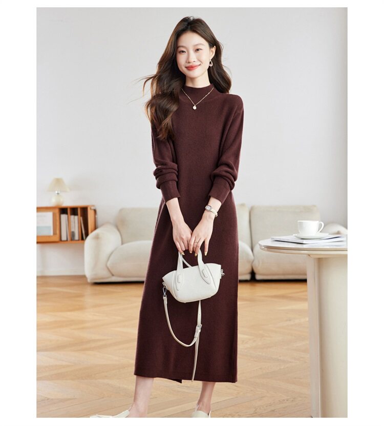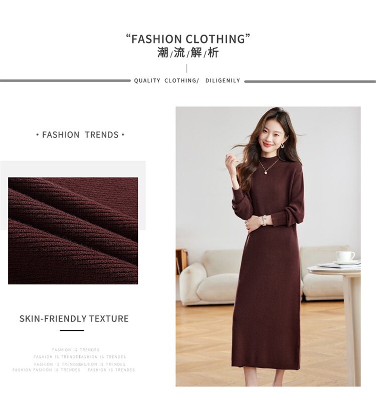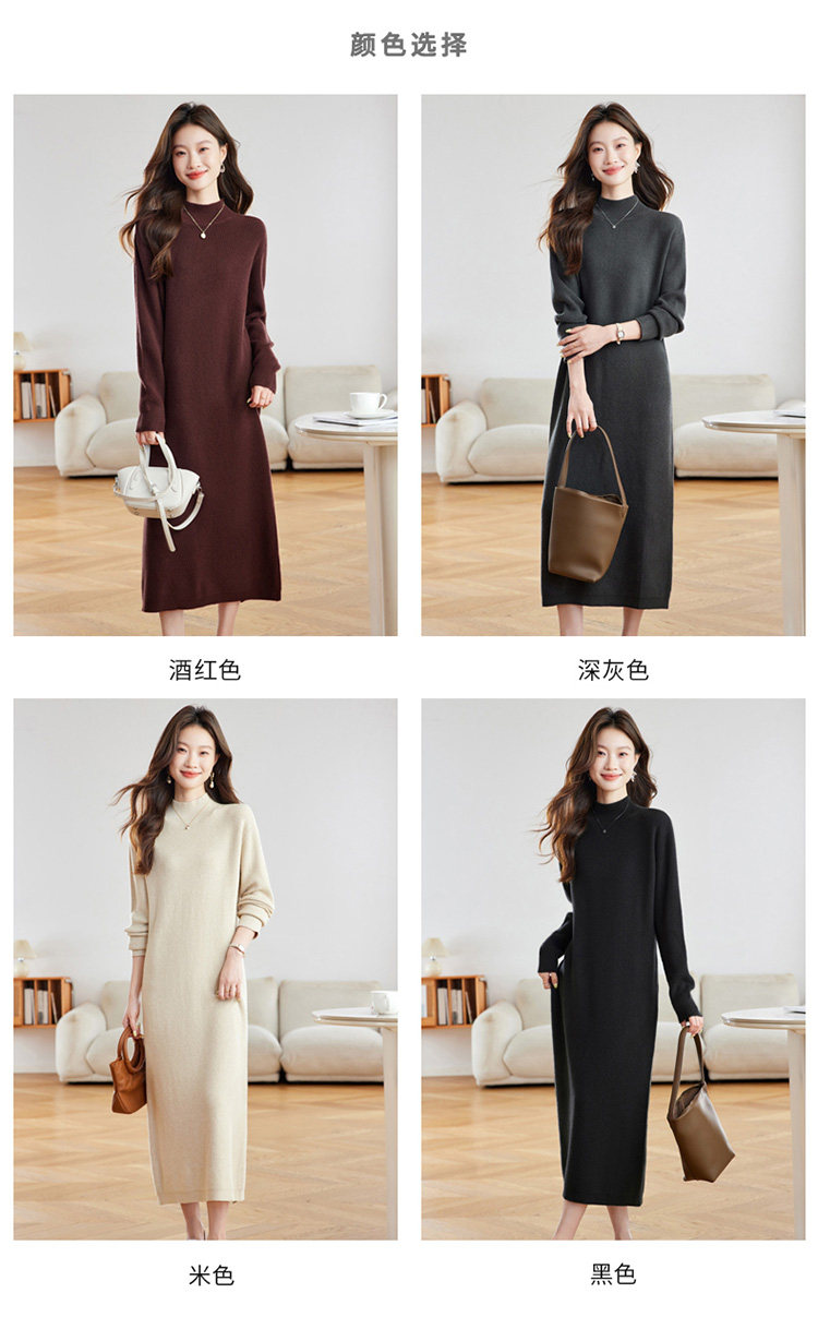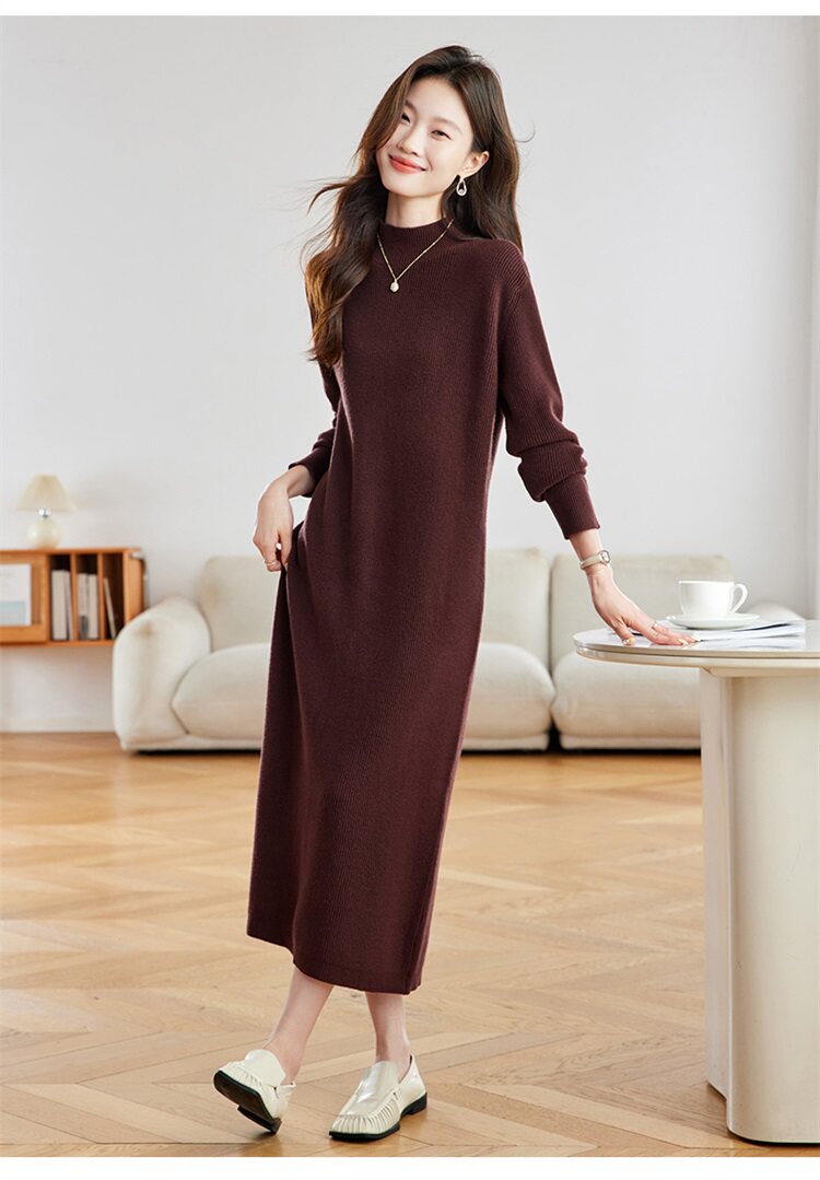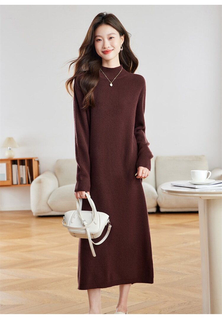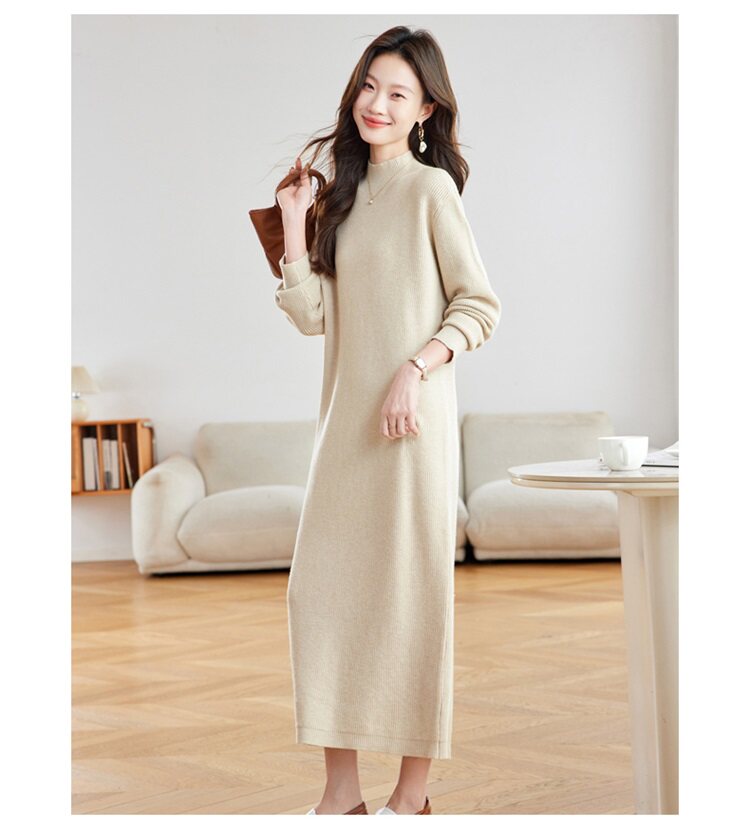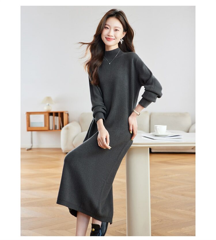 100% Pure Wool Sweater, Half-Turtleneck Sweater for Women, Autumn and Winter Extra-Long Over-The-Knee Sweater Dress, Loose Plus-Size Women's Clothing, Ribbed