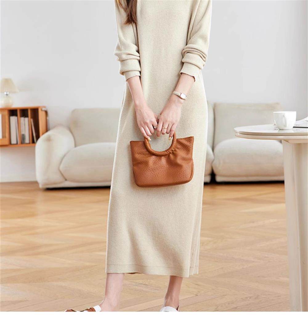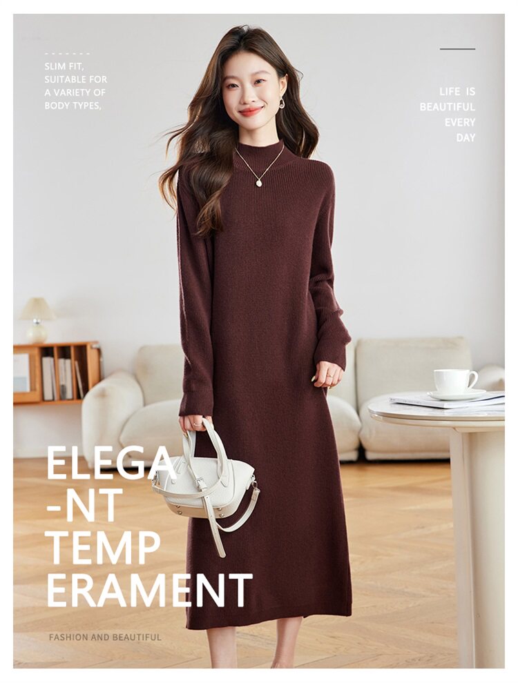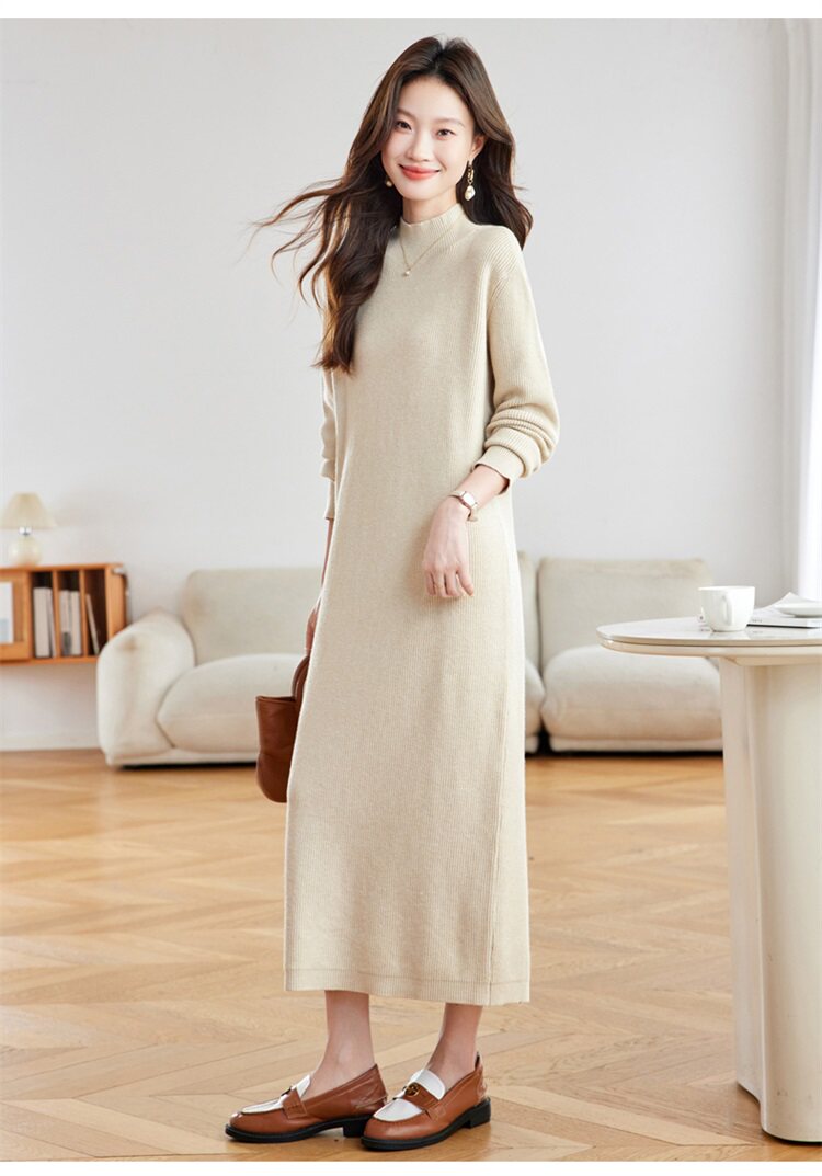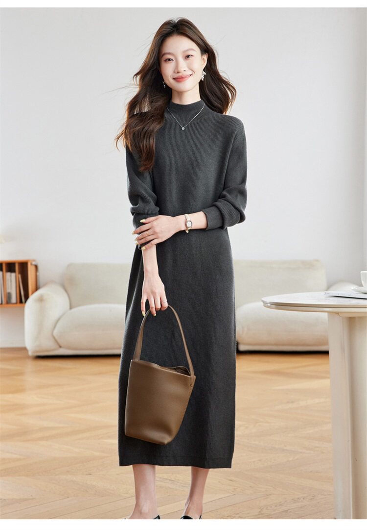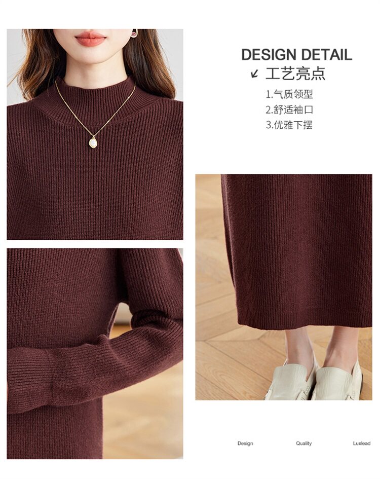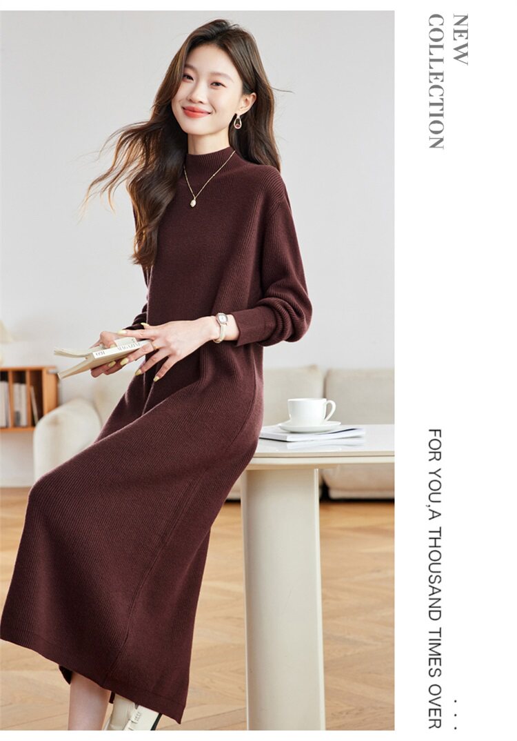 100% Pure Wool Sweater, Half-Turtleneck Sweater for Women, Autumn and Winter Extra-Long Over-The-Knee Sweater Dress, Loose Plus-Size Women's Clothing, Ribbed