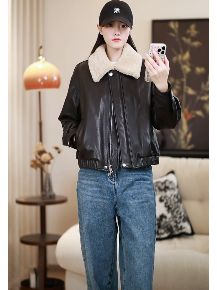 2025 New Small White Goose Down Thickened Leather Women's Slim Sheep Fur Collar Leather Jacket Women's Popular Style