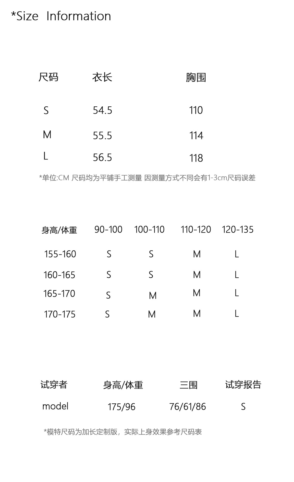 China (cm) 160-165/84-86 165-170 / 88-90 167-172 / 92-96 168-173 / 98-102 170-176 / 106-110