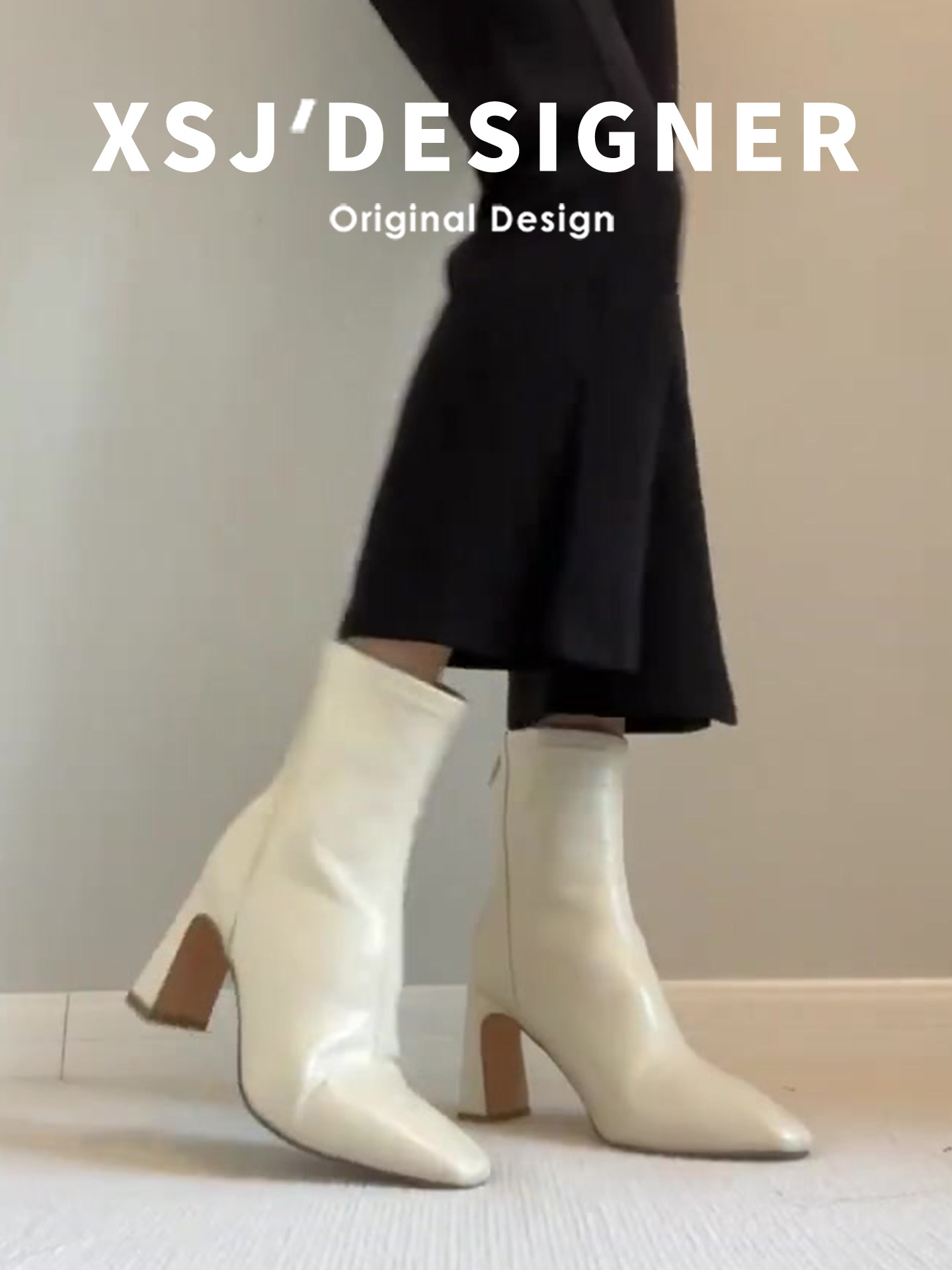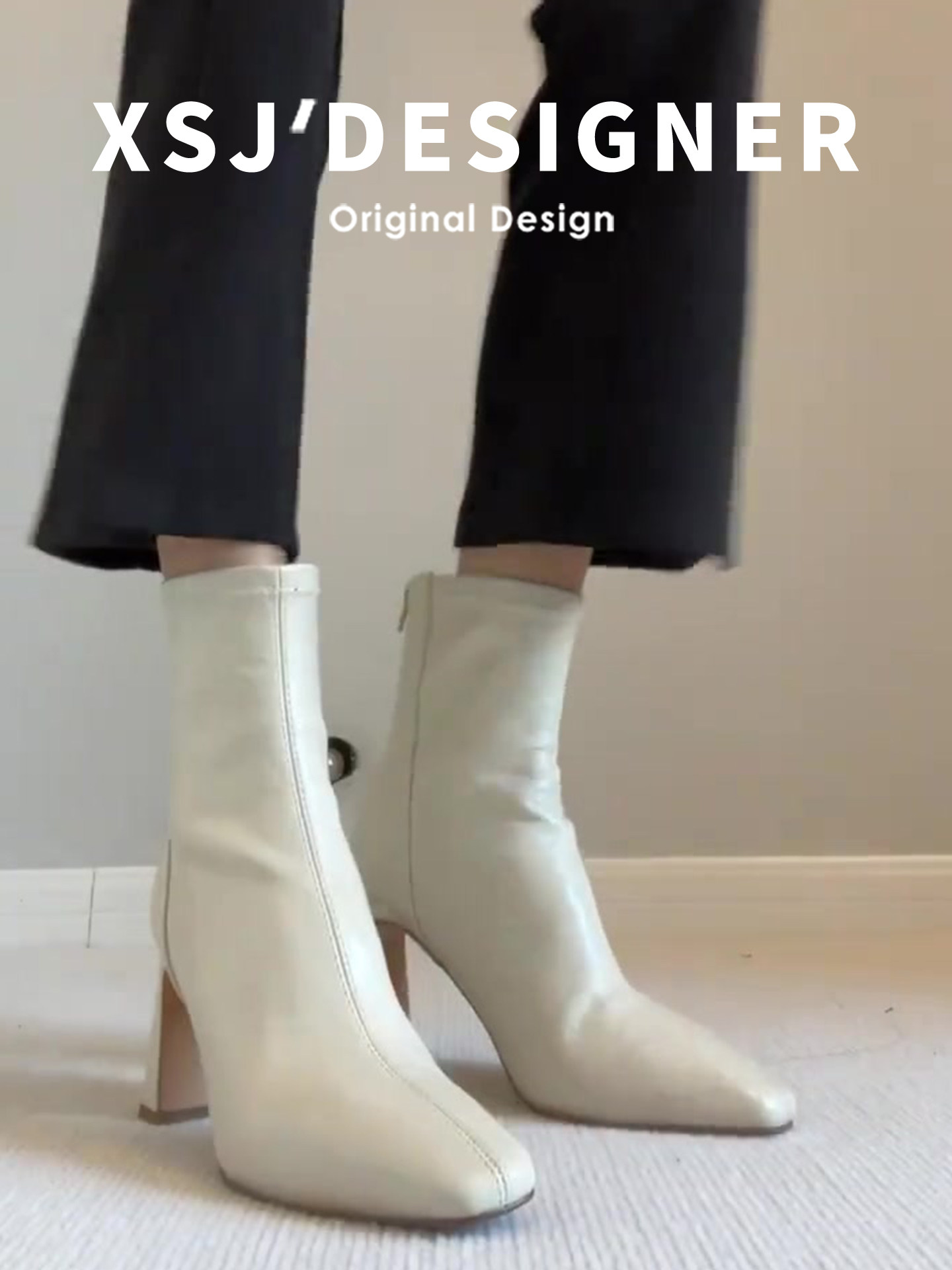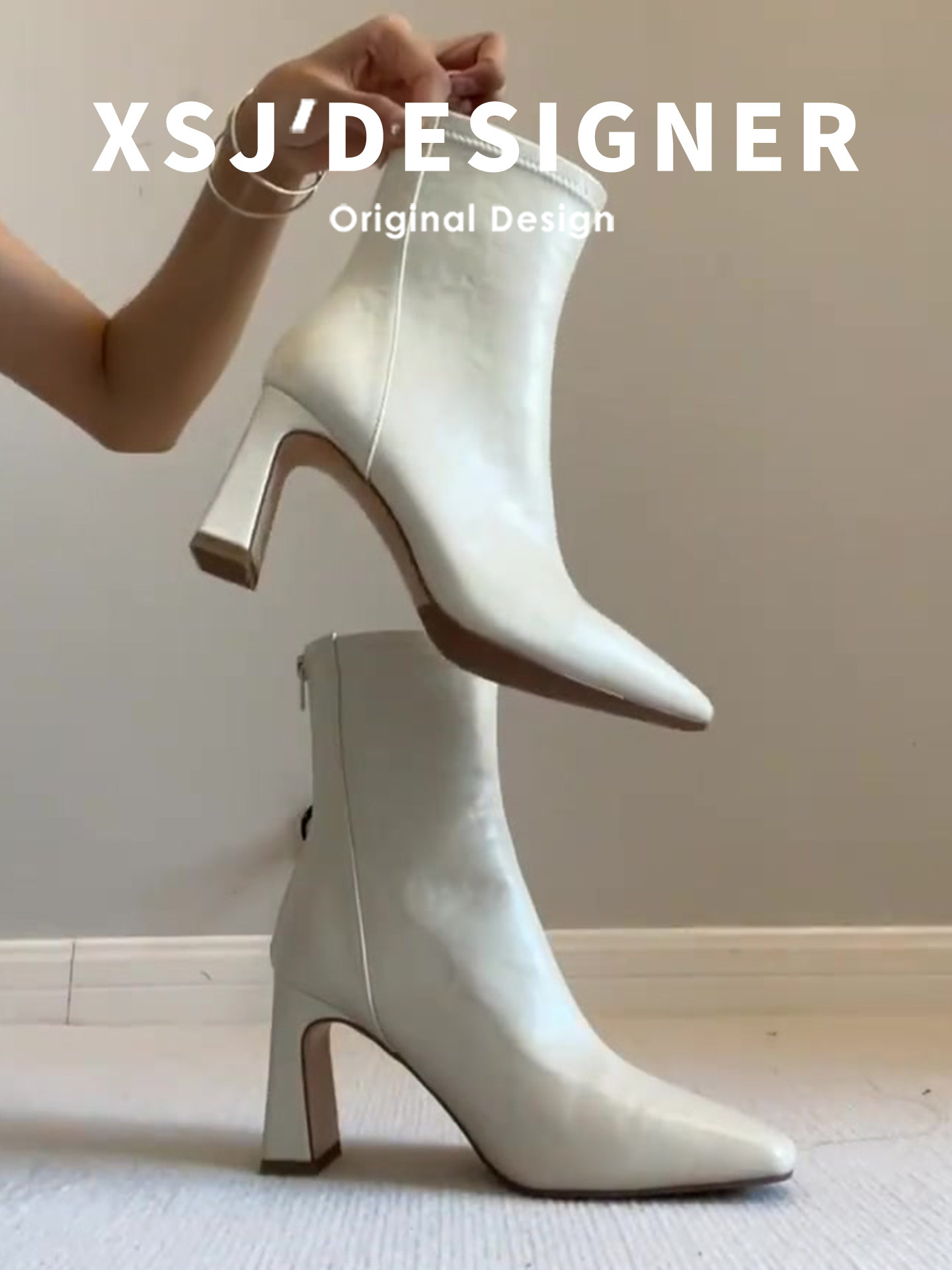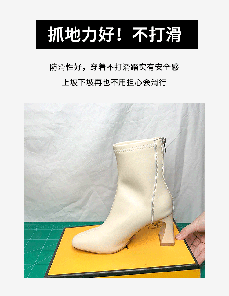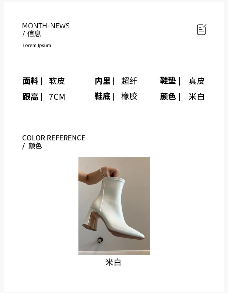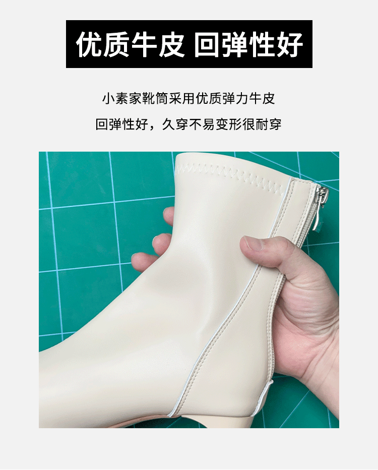 Autumn and Winter Genuine Leather French-Style White Chunky Heel Short Boots for Women, Square Toe, Elegant, Stretchy, Slimming Boots, Gentle High-Heeled Martin Boots